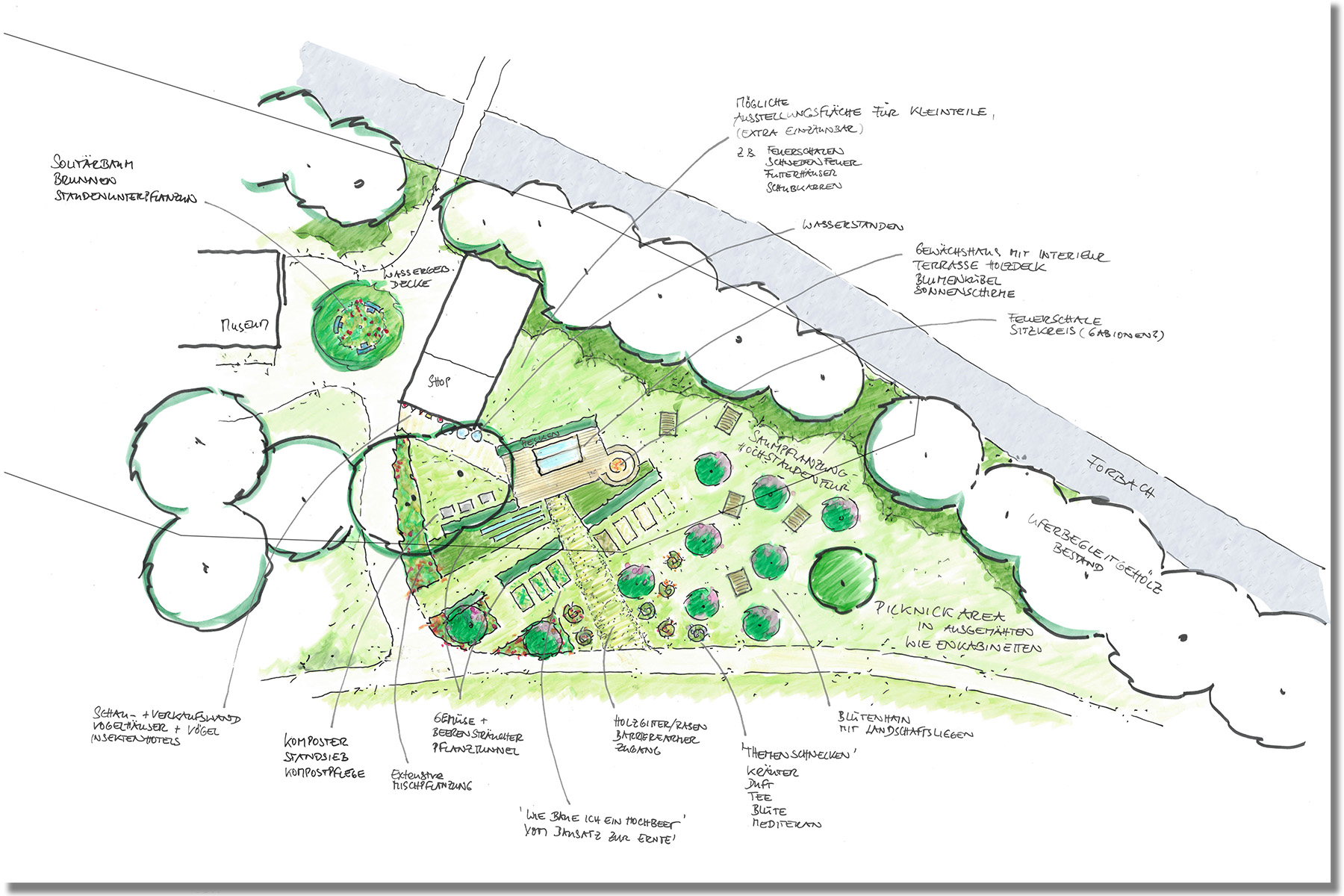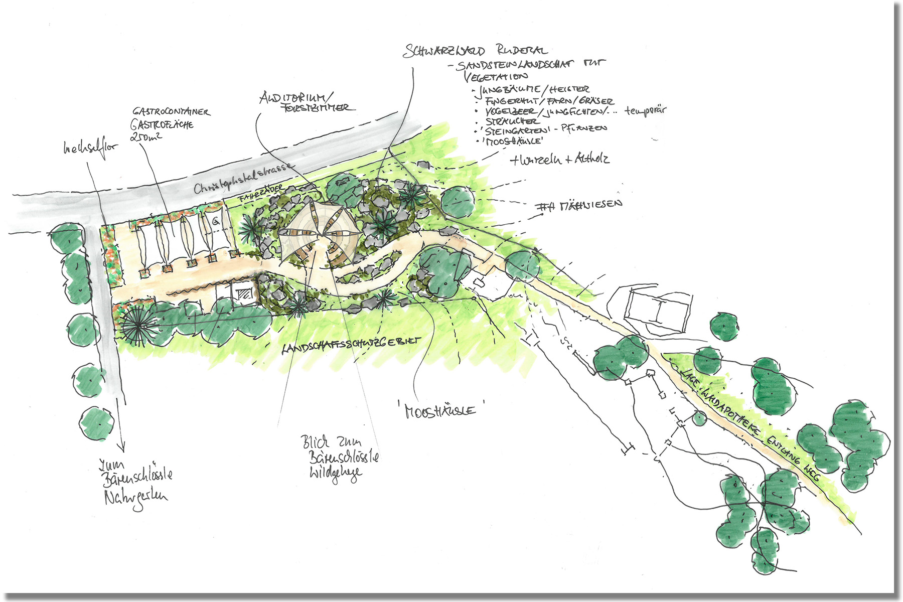 Für ausgewählte Orten ist ein differenziertes Vegetationskonzept für Daueranlagen und temporäre Schaupflanzungen entwickelt worden. Dabei spielt die Lage der Pflanzungen für die Vegetationsgestaltung eine entscheidende Rolle. Im urbanen Stadtraum sind repräsentative Pflanzungen, vor allem mit großblütigen und starkfarbigen Kultursorten vorgesehen. Dagegen spiegeln wiesenartige Mischpflanzungen, mit einem hohen Anteil an Kultursorten mit Wildcharakter und Wildflora, den landschaftlichen Charakter des Forbachtals in den Pflanzungen wider.