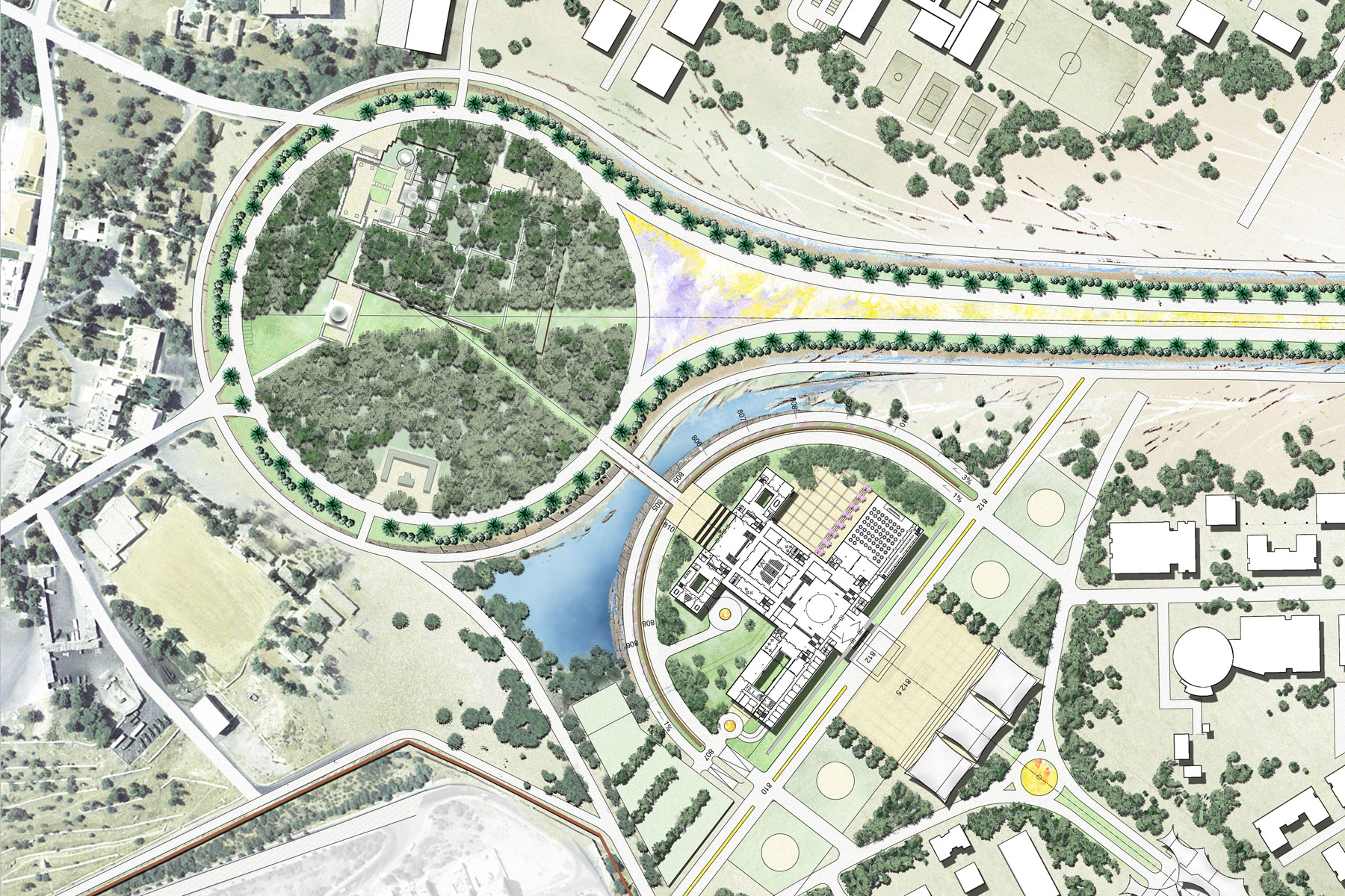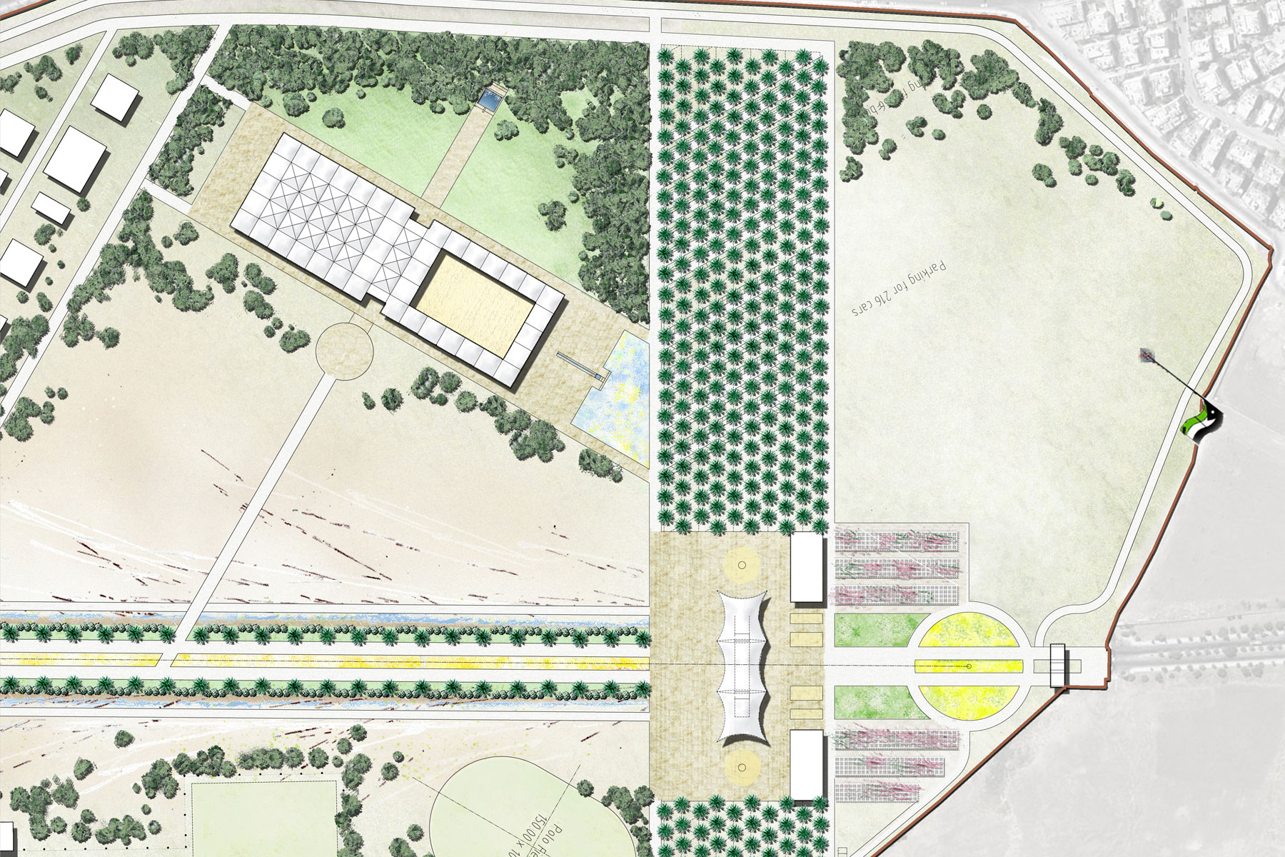 Die städtebauliche Entwicklung des Geländes konzentriert sich östlich und westlich entlang der Mauer. Dies bindet die "Royal Lane" in einen großzügigen Freiraum mit einem spektakulären Blick nach Süden in Richtung des Pinienhaines des königlichen Friedhofes ein.