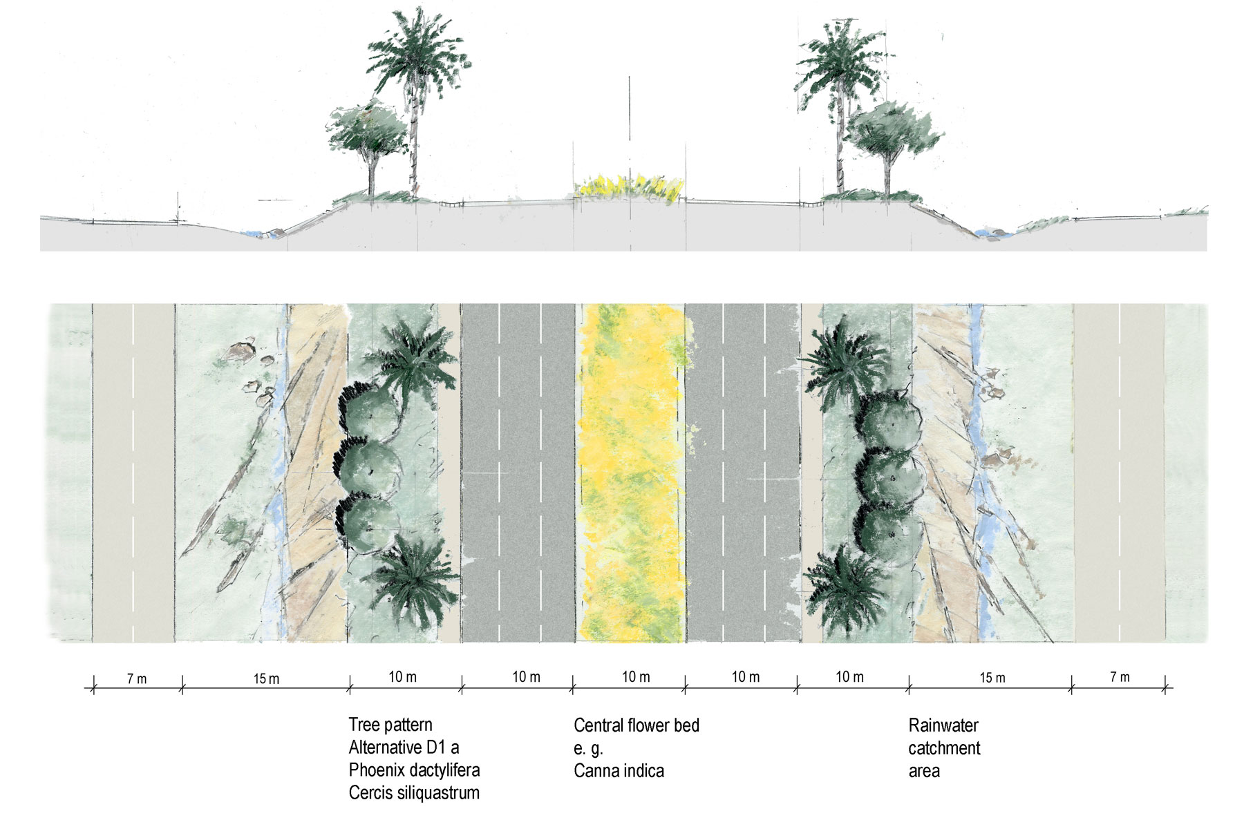 Ein zentraler Pflanzstreifen mit ornamentalen Blütenmustern trennt die Fahrspuren. Die "offenen Mitte" wird in Ihren Randbereichen mit einem Vorhang aus Bäumen zu den hinterliegenden Gebäuden abgegrenzt.