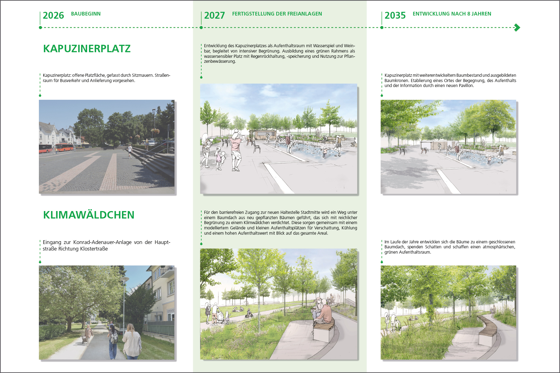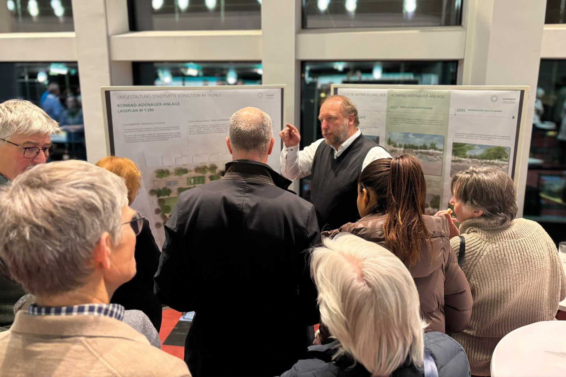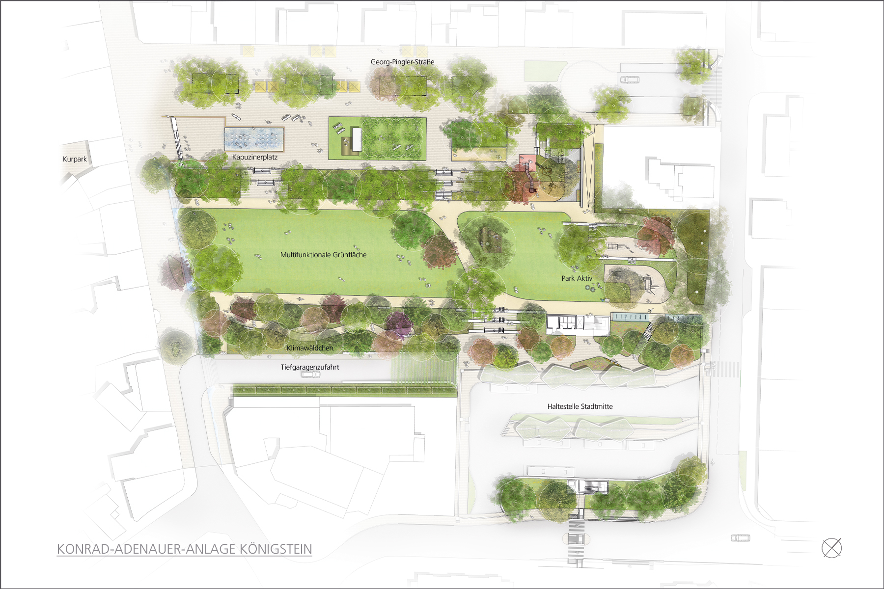 Die Stadt Königstein im Taunus plant die Um- bzw. Neugestaltung der Konrad-Adenauer-Anlage. In der Innenstadt liegend, umfasst sie eine großzügige, in die Jahre gekommene Grünanlage mit Relikten eines ehemaligen Klosters, dem angegliederten Kapuzinerplatz und darin integrierten Parkplätze. Ziel der Stadt Königstein ist es einen urbanen, nachhaltigen, multicodierten Stadtraum zu entwickeln, der zukünftig der Gesundheitsvorsorge und als sozialer Begegnungsort dient und insgesamt die Klimaresilienz der Stadt erhöht.