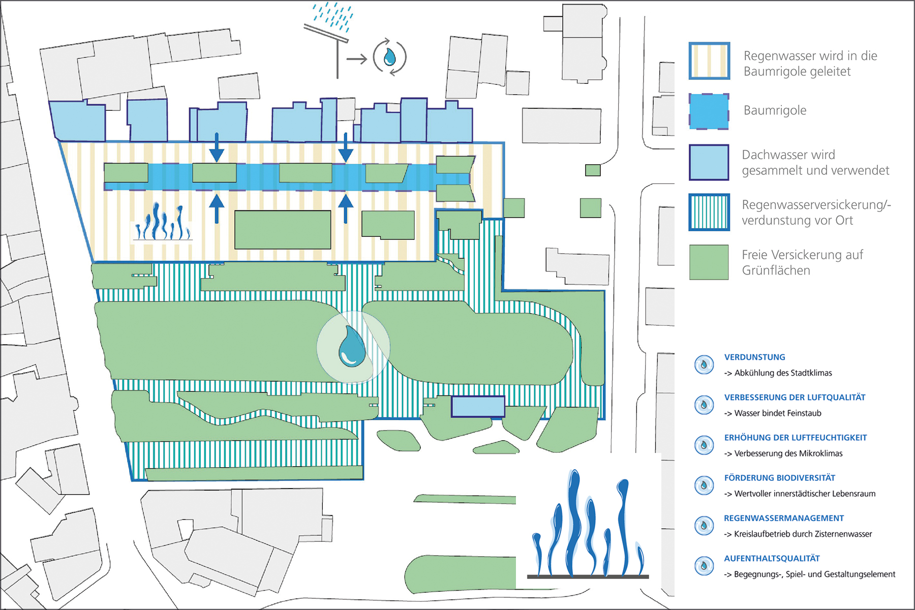 Die angrenzende Georg-Pingler-Straße wird in die Gesamtgestaltung aufgenommen und zu einer grünen Parkpromenade mit Verdunstungsbeeten, die unterirdisch als vernetzte, kaskadierende Baumrigolen ausgebildet sind und durch die Verwendung von versickeroffenen Deckbelägen mit Albedo-Effekt zukunftsorientiert entwickelt.