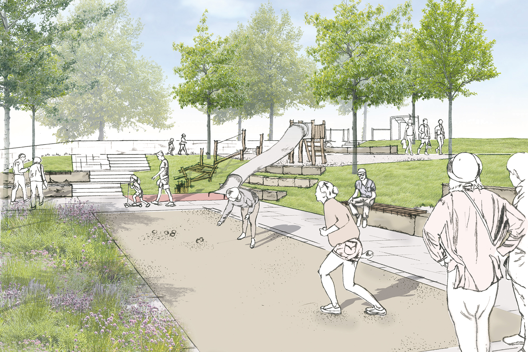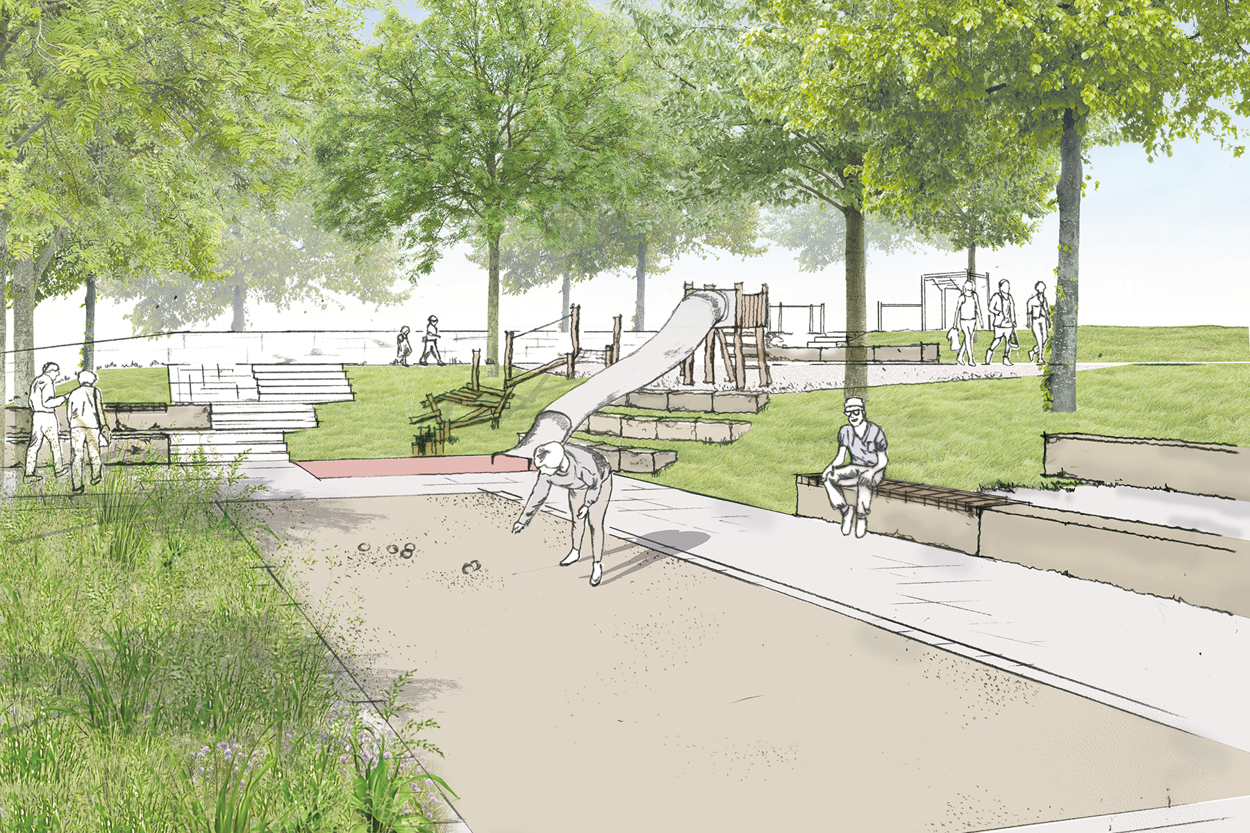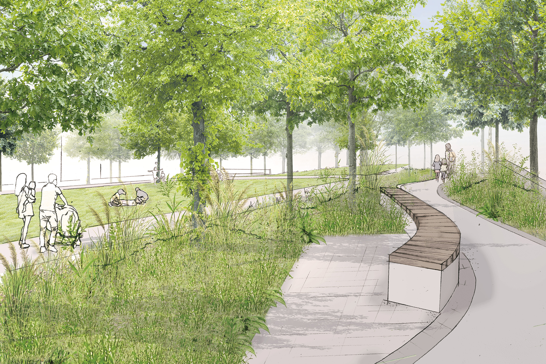 Im Rahmen der Maßnahme wird besonderer Wert auf die Qualität und Quantität der Grünflächen gelegt. Ziel ist die Schaffung leistungsfähiger, klimaangepasster Freiräume mit hoher ökologischer und gestalterischer Wertigkeit. Stark beanspruchte Grünflächen werden als Rasen ausgebildet, während andere Grünflächen mit artenreichen, biodiversen, pflegeextensiven und klimaangepassten Pflanzungen gestaltet werden. Wo möglich, werden Bestandsbäume erhalten und geschützt