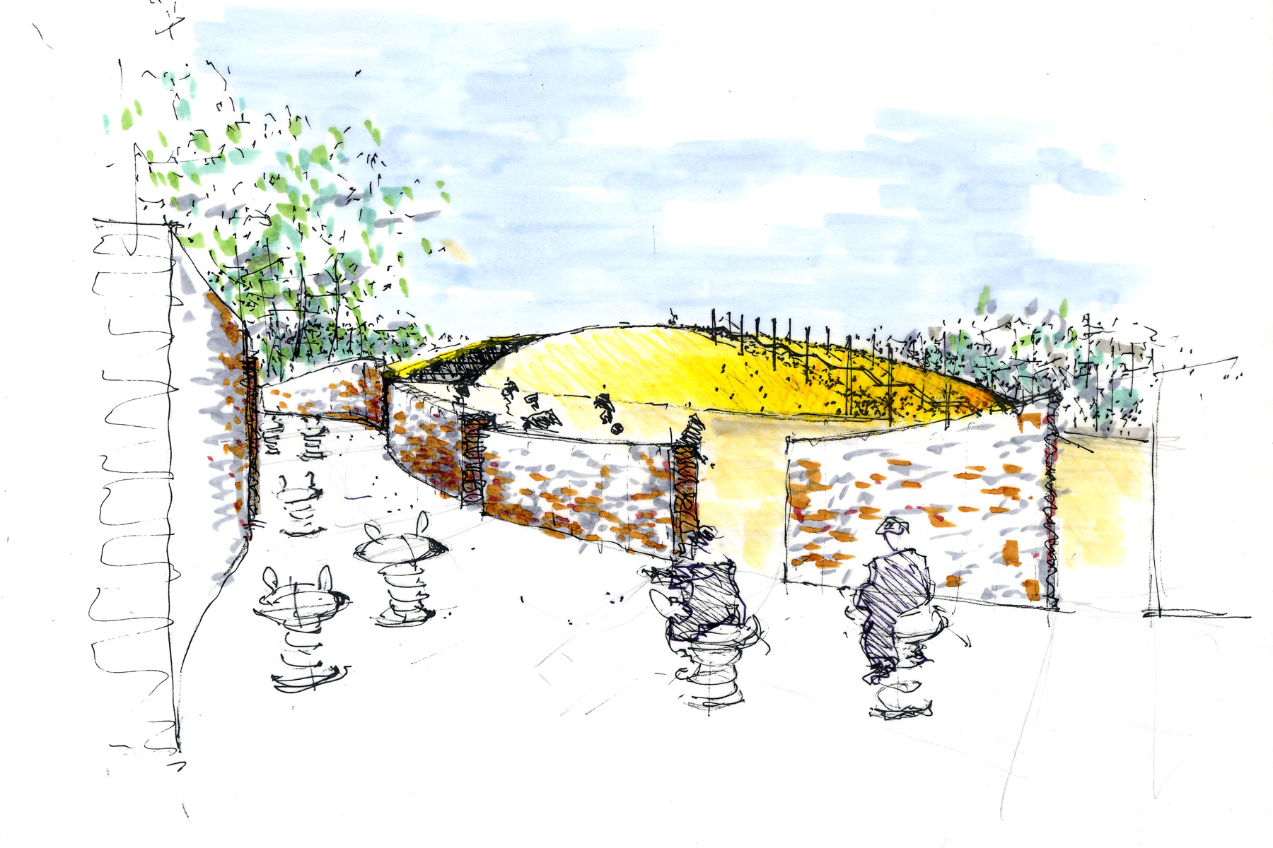 Das Südgelände erhält einen großzügigen offenen Spielplatz - ca. 2500 m² - für Bewegungsspiele. Zur Wohnbebauung werden im Westen geschwungene Mauerbänder - Recyclingziegel - angeordnet.