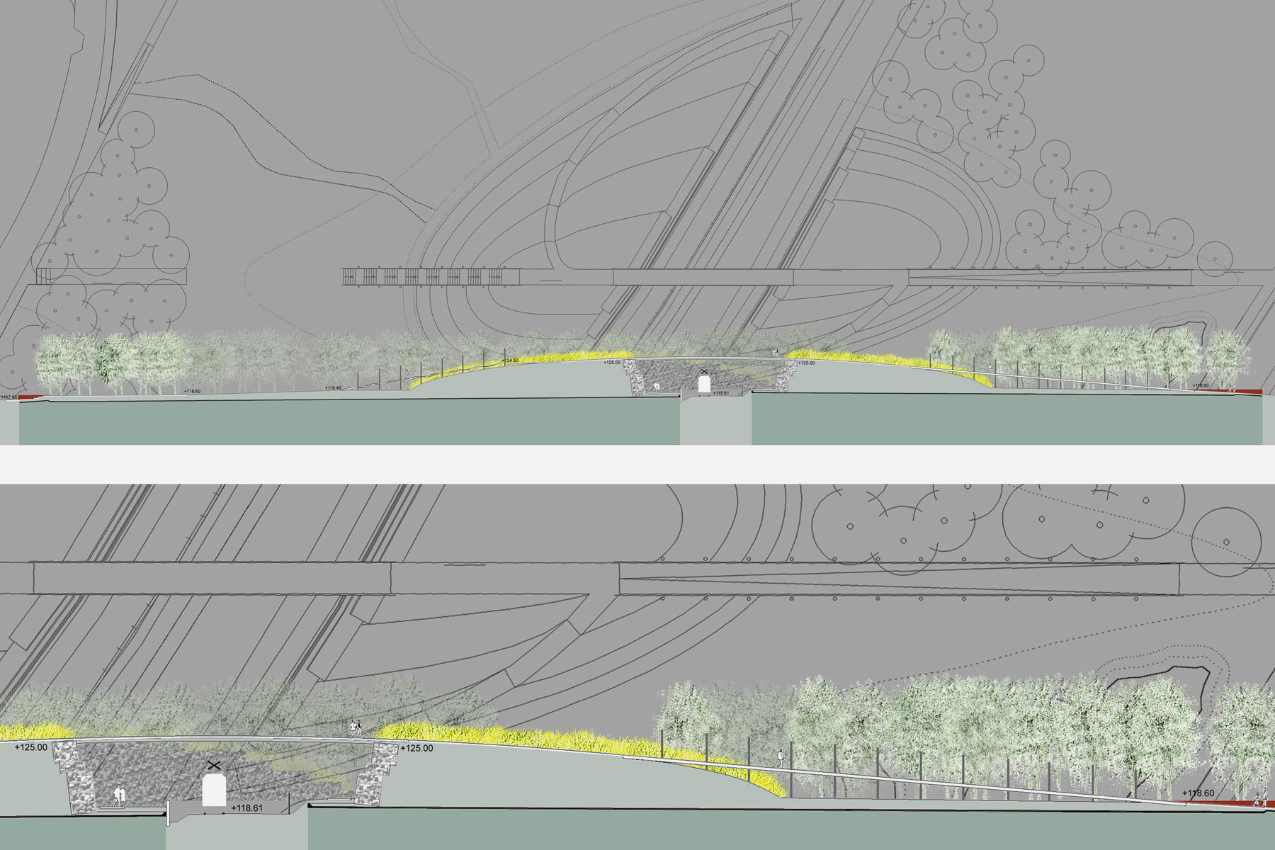 Die Murgtalbahn teilt ihn in ein Nord- und Südgelände, das über einen zentralen Hügel, die Landmarke des Projektes, verbunden ist.