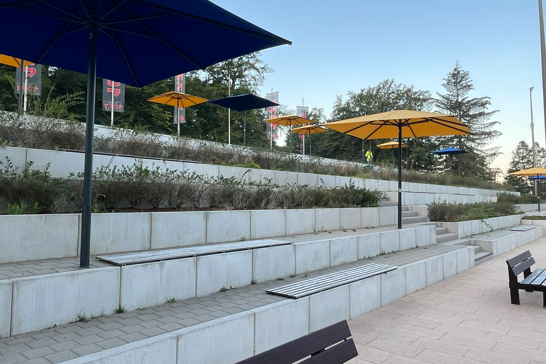 Eine vorhandene Stufenanlage im Bereich des Sportbeckens wurde zu einer Sitzstufenanlage als Tribüne und Liegestufenanlage mit hoher Aufenthaltsqualität umgeplant und gebaut. Aus einem bestehenden Wasserspielbereich wurde ein moderner Spray-Park mit zeitgemäßen Attraktionen und Aufenthalts- und Sitzmöglichkeiten für die Eltern deren spielenden Kinder. Der Weg vom Haupteingang des Freibades zu den Kinderbecken wurde barrierefrei umgeplant und ertüchtigt.