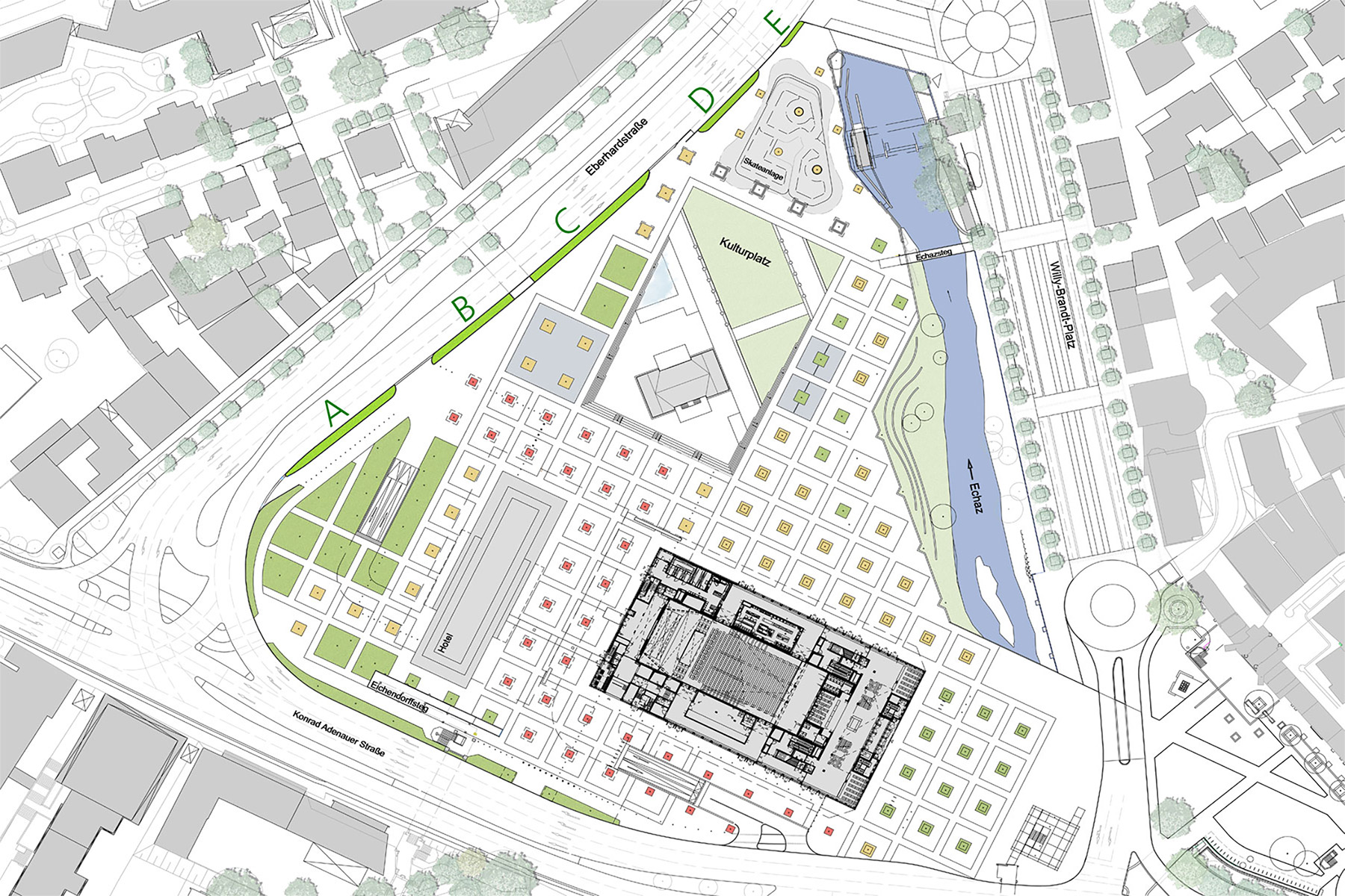Die Beseitung des Hochsteges und das Einebnen des Geländes eröffnet heute neue Blickbeziehungen zwischen Stadthalle und Altstadt und neue Wegeverbindungen über die Echaz verknüpfen die Kernstadt mit dem neuen städtisch geprägten Freiraum.