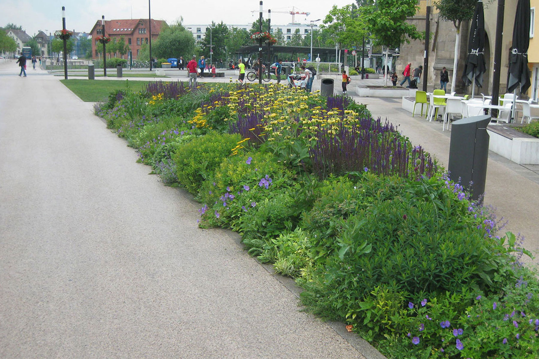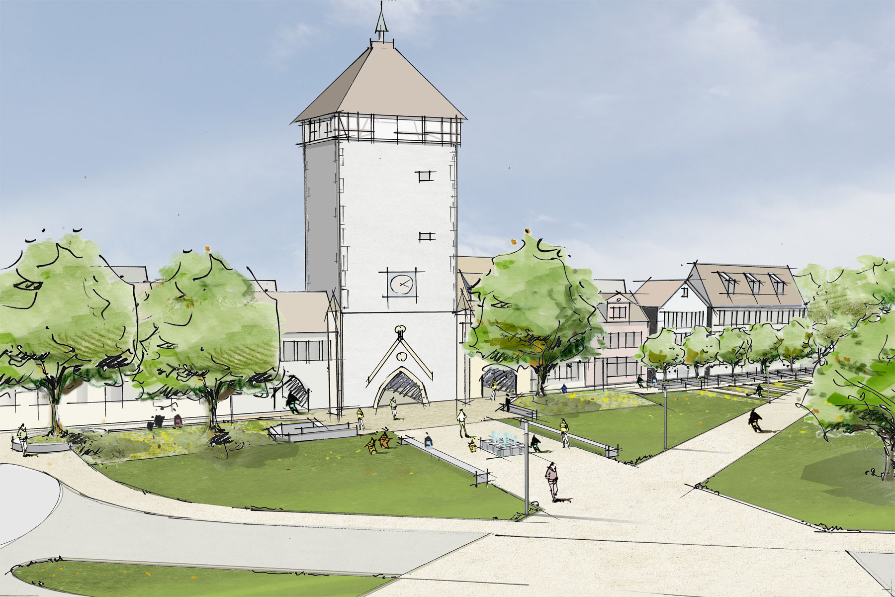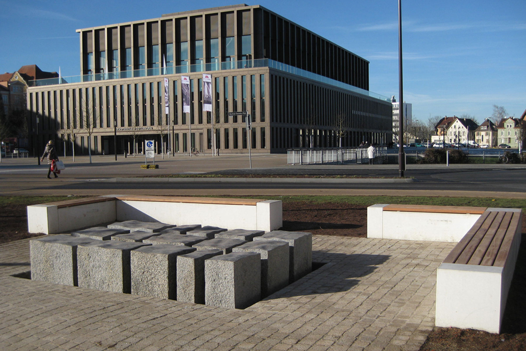 Im Vorfeld des Tübinger Tors entstand eine urbane Grünanlage mit großzügigen Rasenflächen, Staudenpflanzungen, Spielelementen und einem kleinen Platz um den Brunnen des Reutlinger Künstlers Rainer Hantschke.
