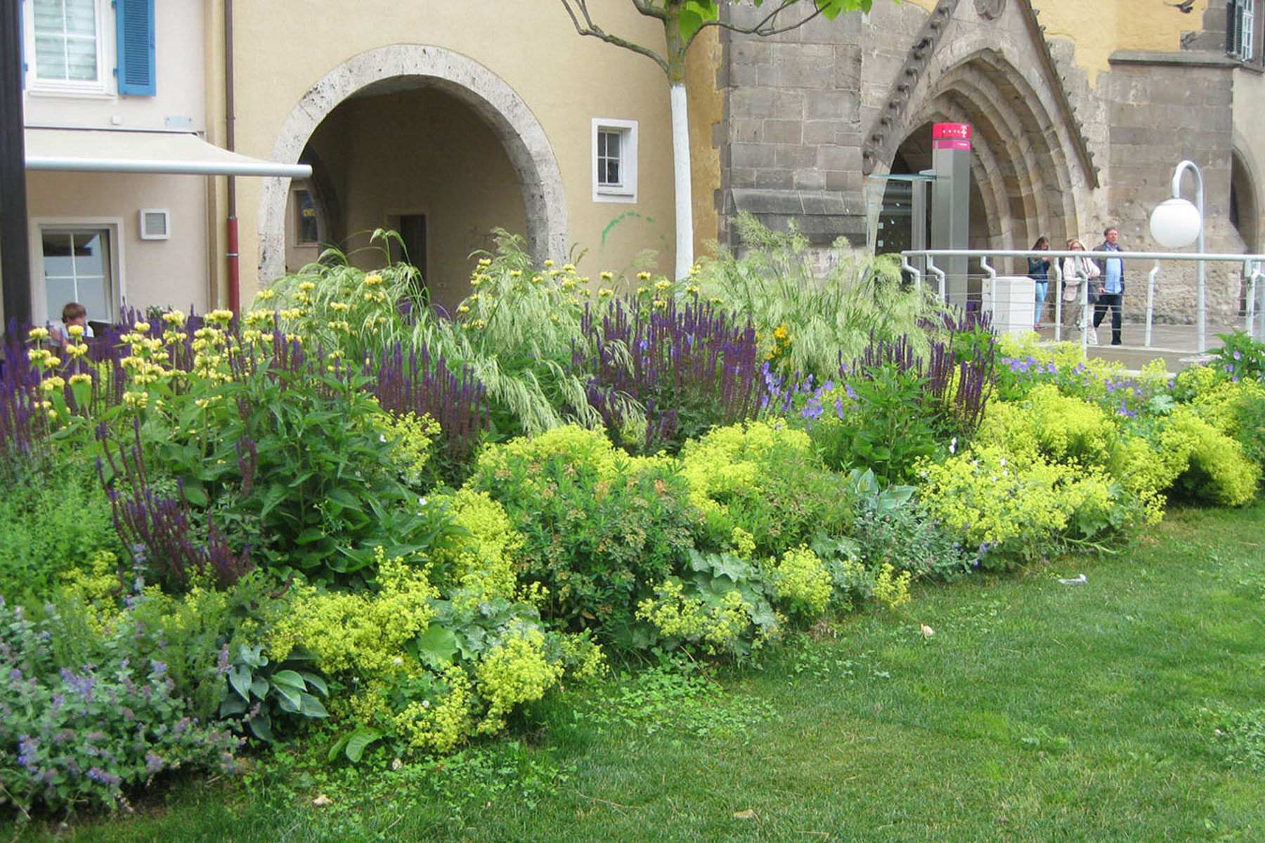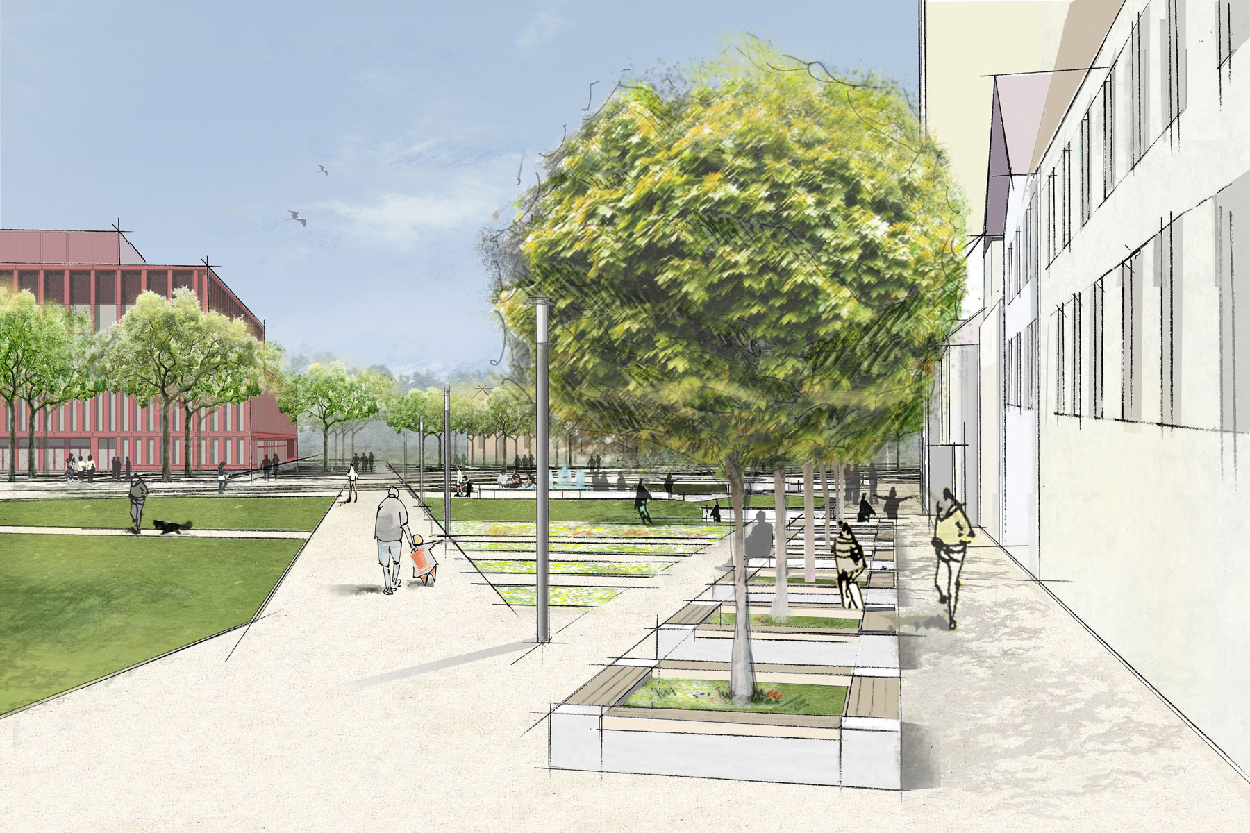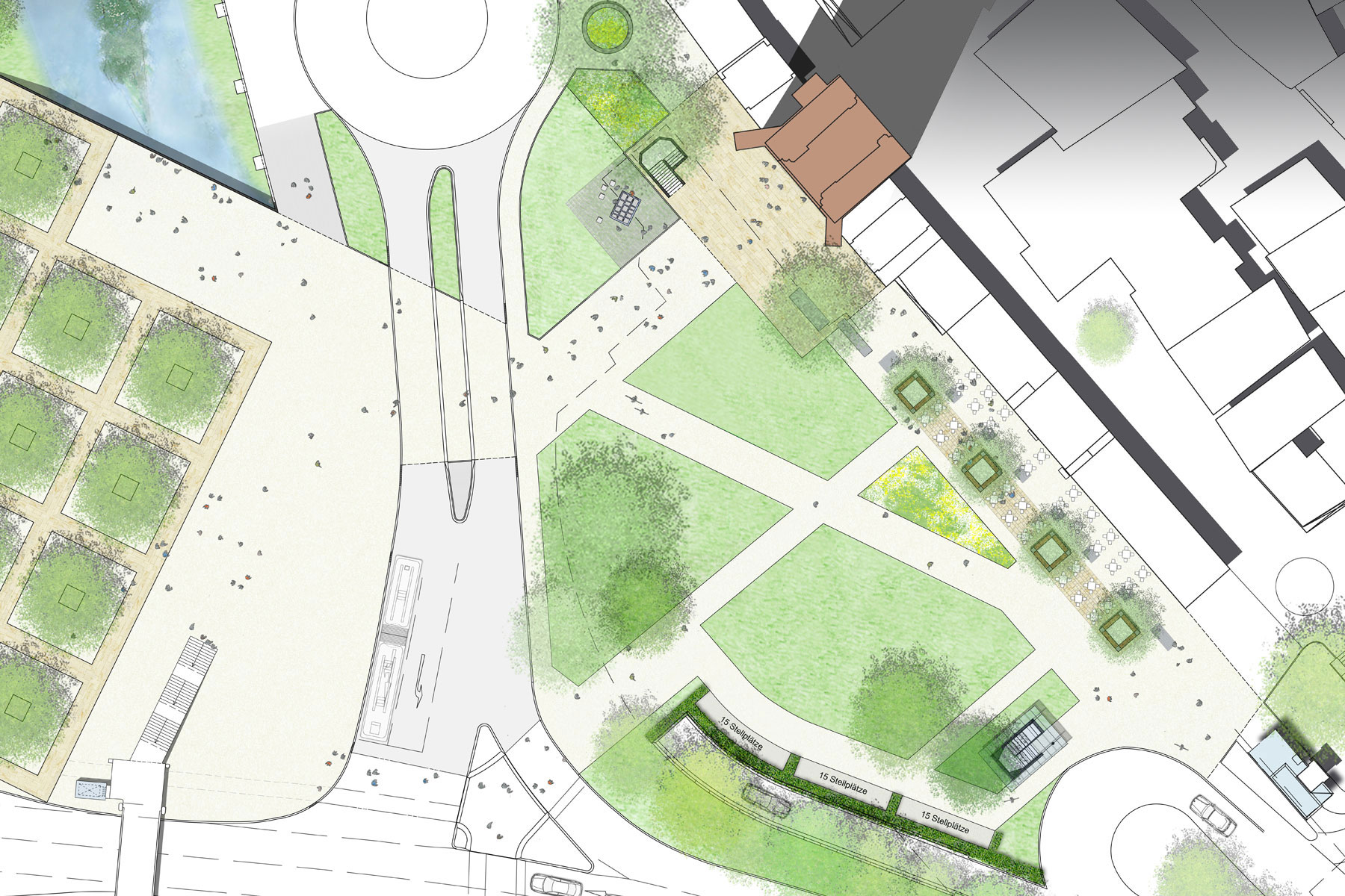 Im Vorfeld des Tübinger Tors entstand eine urbane Grünanlage mit großzügigen Rasenflächen, Staudenpflanzungen, Spielelementen und einem kleinen Platz um den Brunnen des Reutlinger Künstlers Rainer Hantschke.