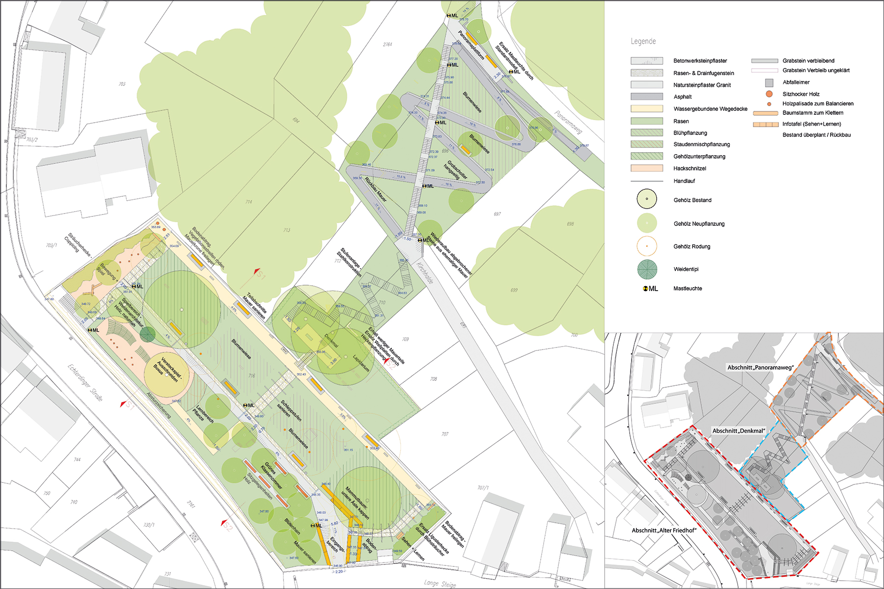 Die stadtklimatisch wichtigen Kaltluftströme werden im Steilhang von Bepflanzung mit Gehölzen freigehalten. Die vorhandene periphere Gehölzkulisse wird mit klimaangepassten Arten behutsam ergänzt. Innerhalb des alten Friedhofs setzten vor allem artenreiche Blühwiesen neben einzelnen extensiven Staudenmischpflanzungen Akzente. Der Altbaumbestand im Friedhof wird durch insektenfreundliche Blütengehölzen ergänzt, die zusätzlich ihren Beitrag zur Erhöhung der Biodiversität leisten.