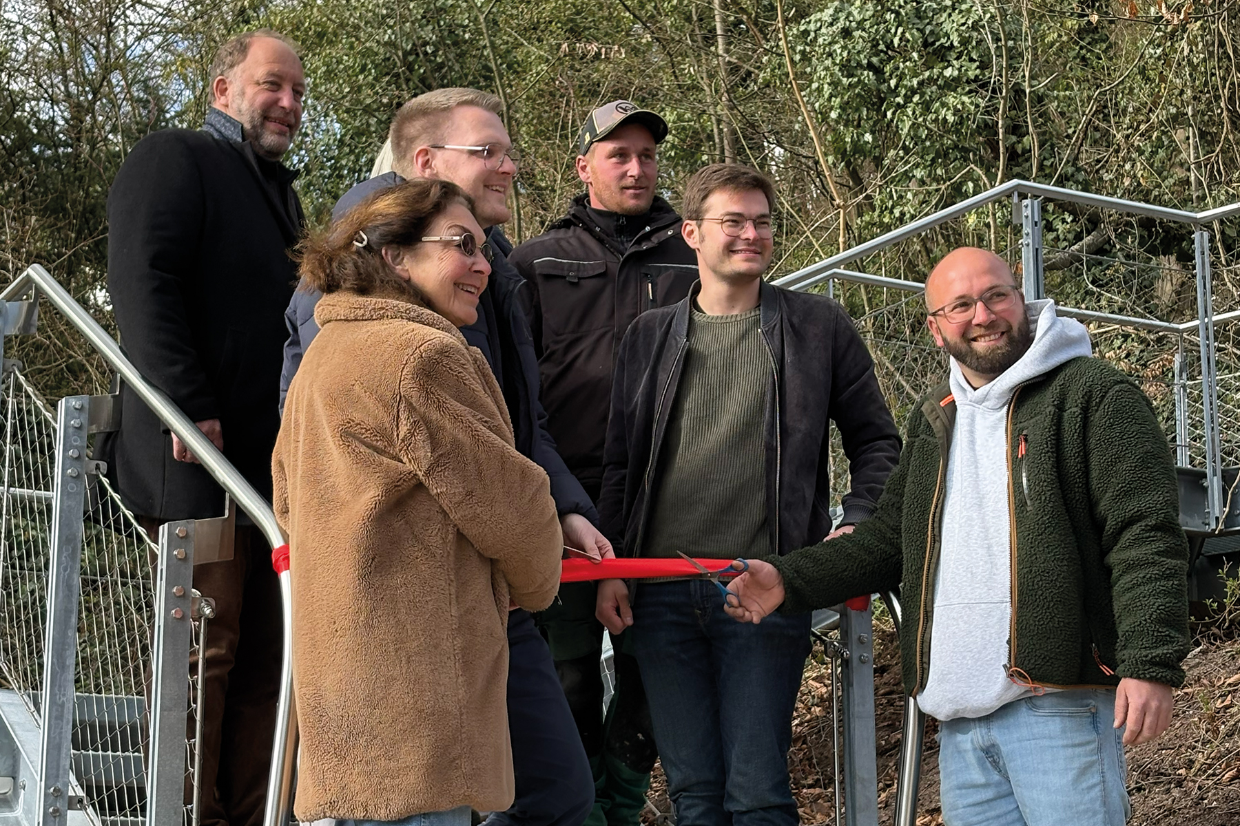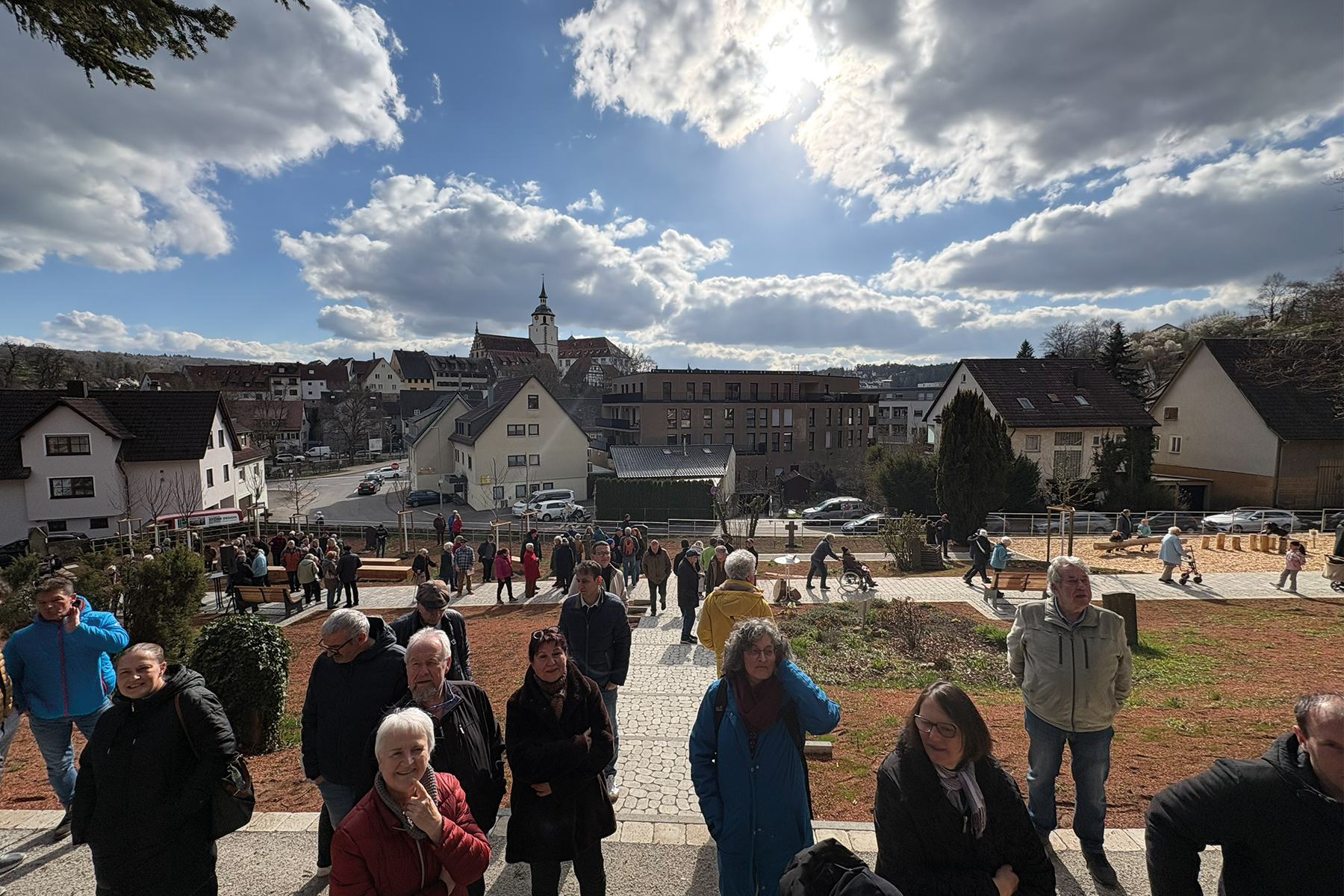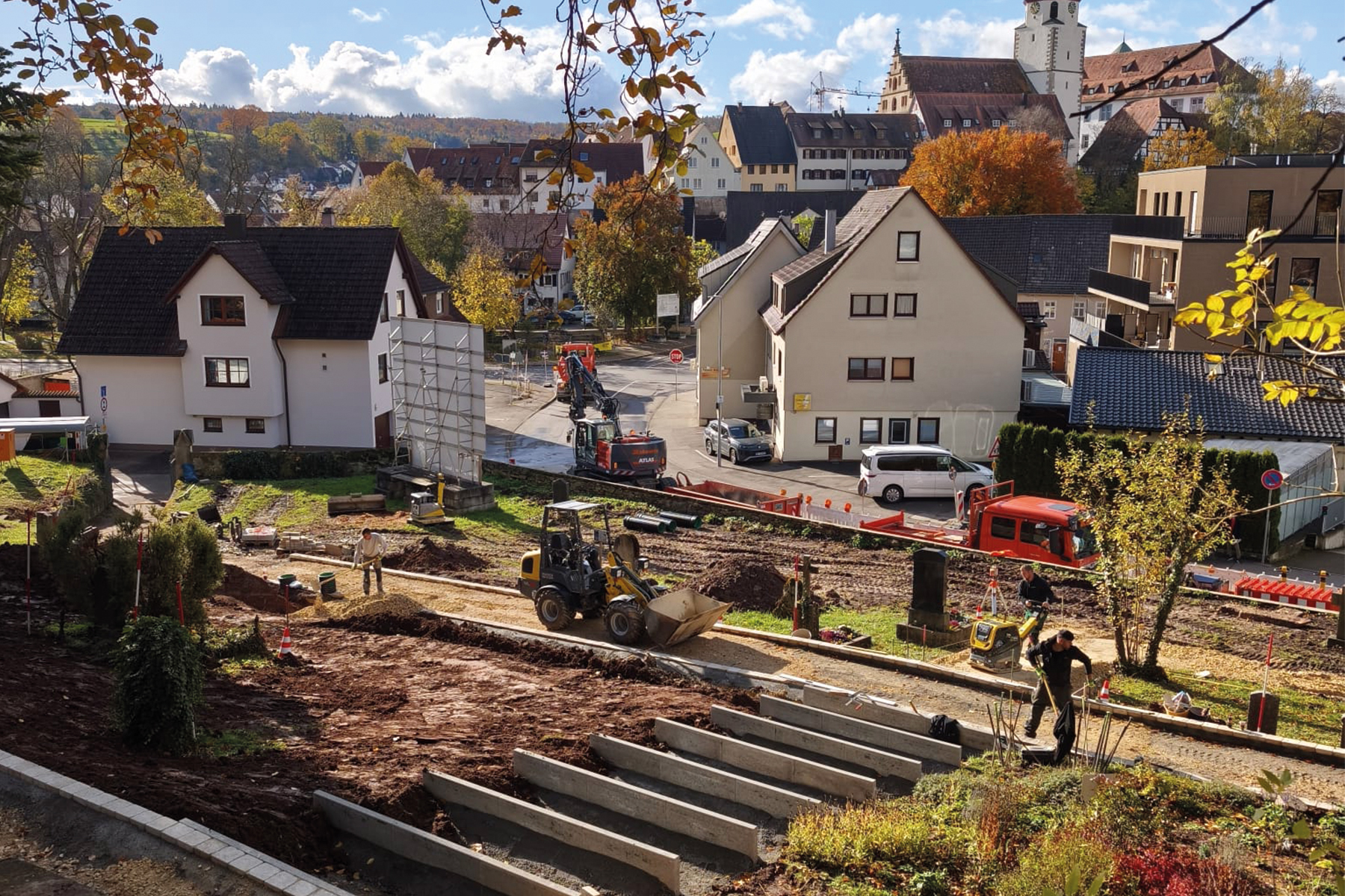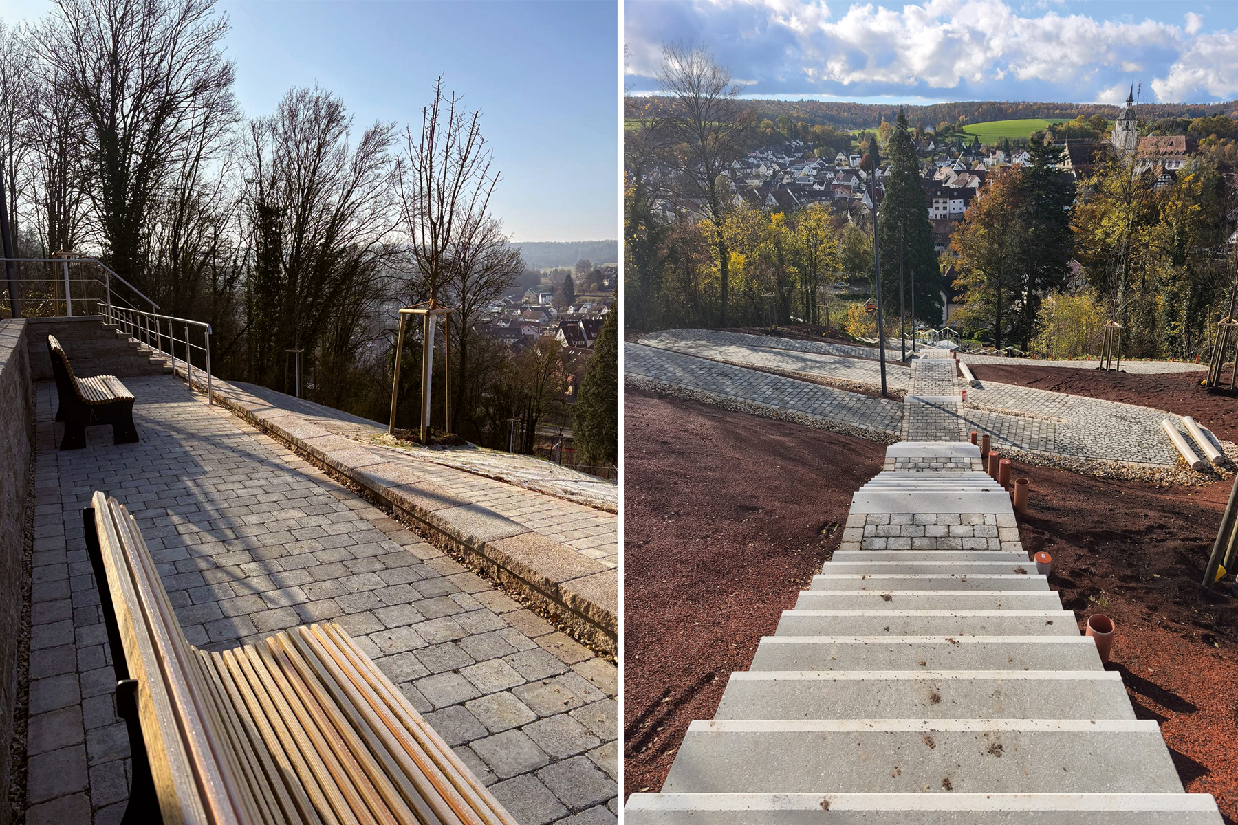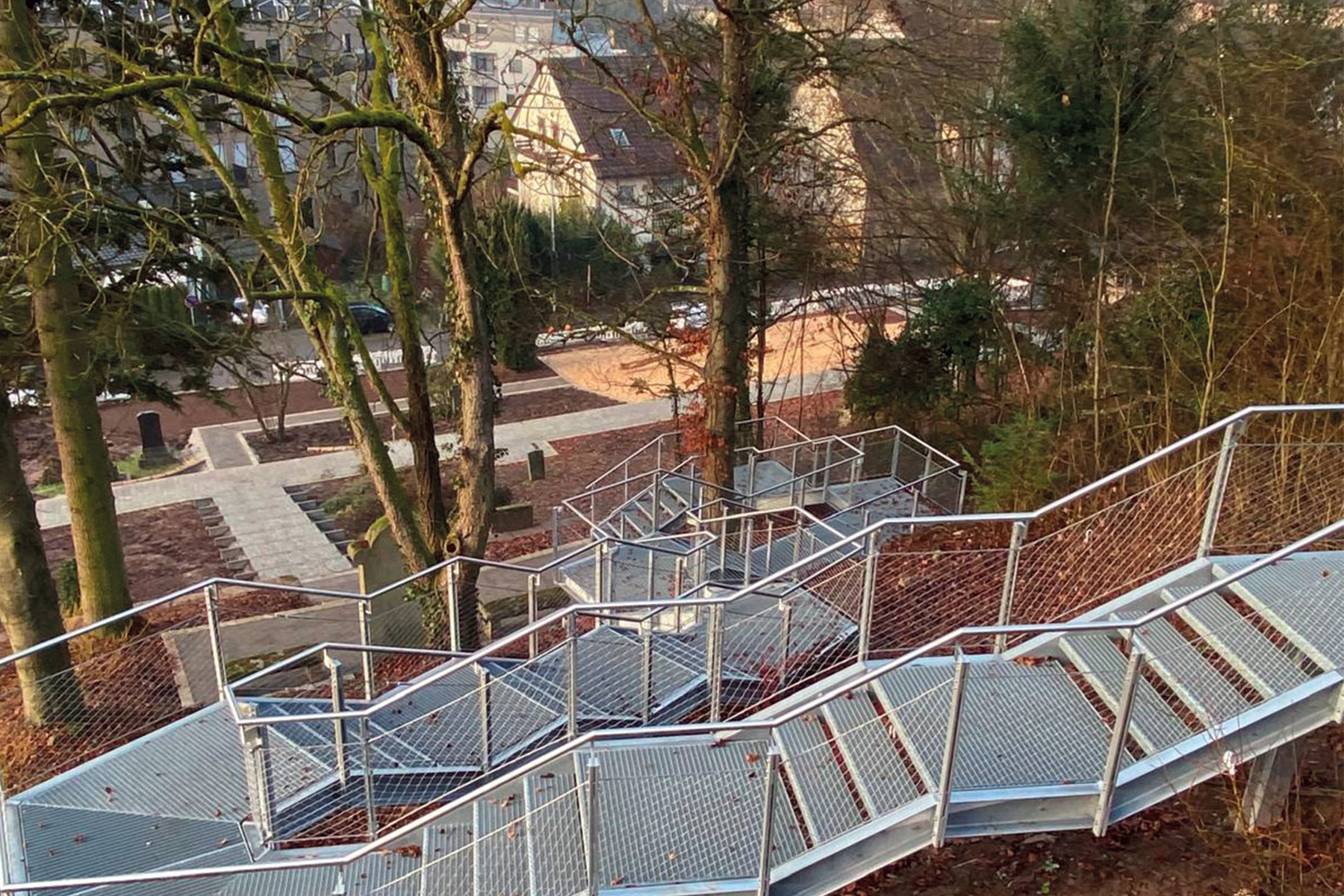Gleichzeitig entsteht eine neue, wichtige und direkte Wegeverbindung zwischen Kernstadt und dem höher gelegenen Wohngebiet Kalkofen. In die durchweg sehr steile Hangsituation wird, neben einem durchgängig barrierearmen Serpentinenweg, eine axiale Treppenkonstruktion in Leichtbauweise aus Stahl, als 'Schnellaufstieg' Kirchhalde/Panoramaweg, eingefügt. Eine Aussichtsplattform am Panoramaweg bündelt beide Erschließungssysteme und stellt signifikante Blickbeziehungen zur Altstadt her.