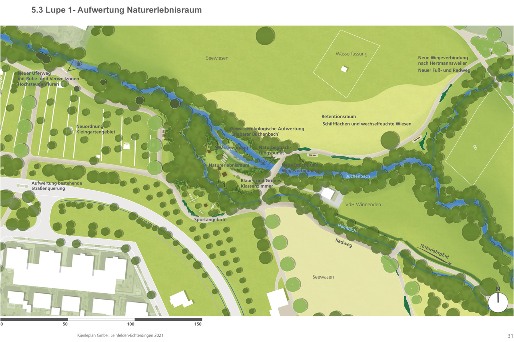 Entsprechend der Ziele der Landschaftsparkkonzeptes möchte Winnenden daher seinen Natur- und Landschaftsraum Buchenbachaue erhalten, aktiv gestalten, aufwerten und qualitativ weiterentwickeln. Dabei stehen die Sicherung und Weiterqualifizierung der wertvollen Natur- und Landschaftsräume der Buchenbachaue, die Gewässerentwicklung des Buchenbachs selbst, der Erhalt der umgebenden Kulturlandschaft, die langfristige Aufwertung zu einem Naherholungsraum genauso im Fokus, wie die anstehenden Themen der Anpassung an die Folgen des Klimawandels durch Starkregenereignisse und die immer häufiger vorkommenden Hitzesommer. Die zukünftig attraktive grüne und blaue Infrastruktur nimmt damit direkten Einfluss auf die Wohn- und Lebensqualität. Das Projekt soll eine qualitätvolle Aufwertung und Vernetzung zu einem Biotopverbund darstellen, zugleich die Naherholungsfunktion der Bevölkerung sicherstellen.