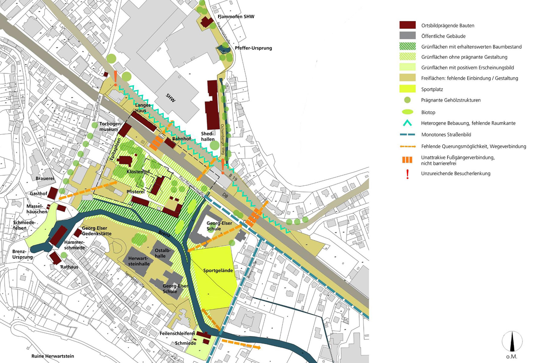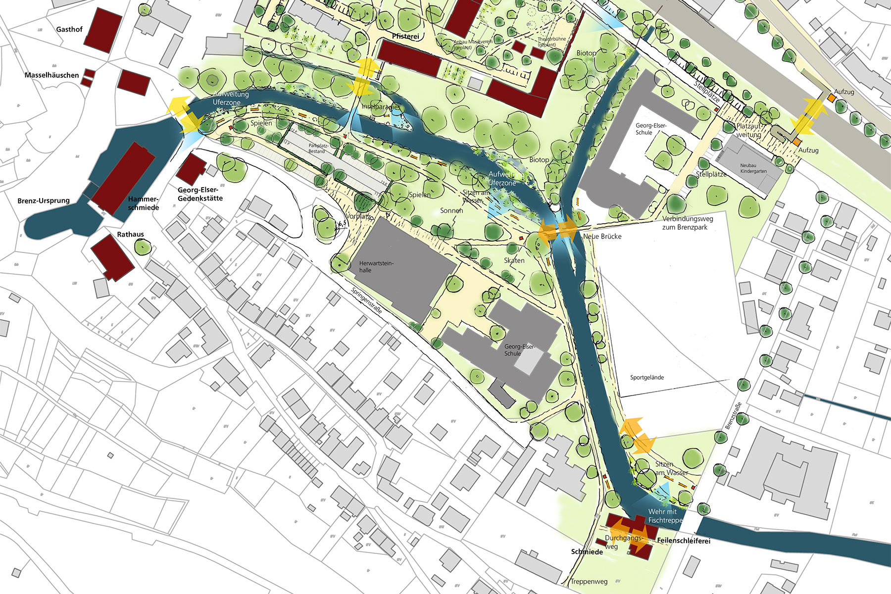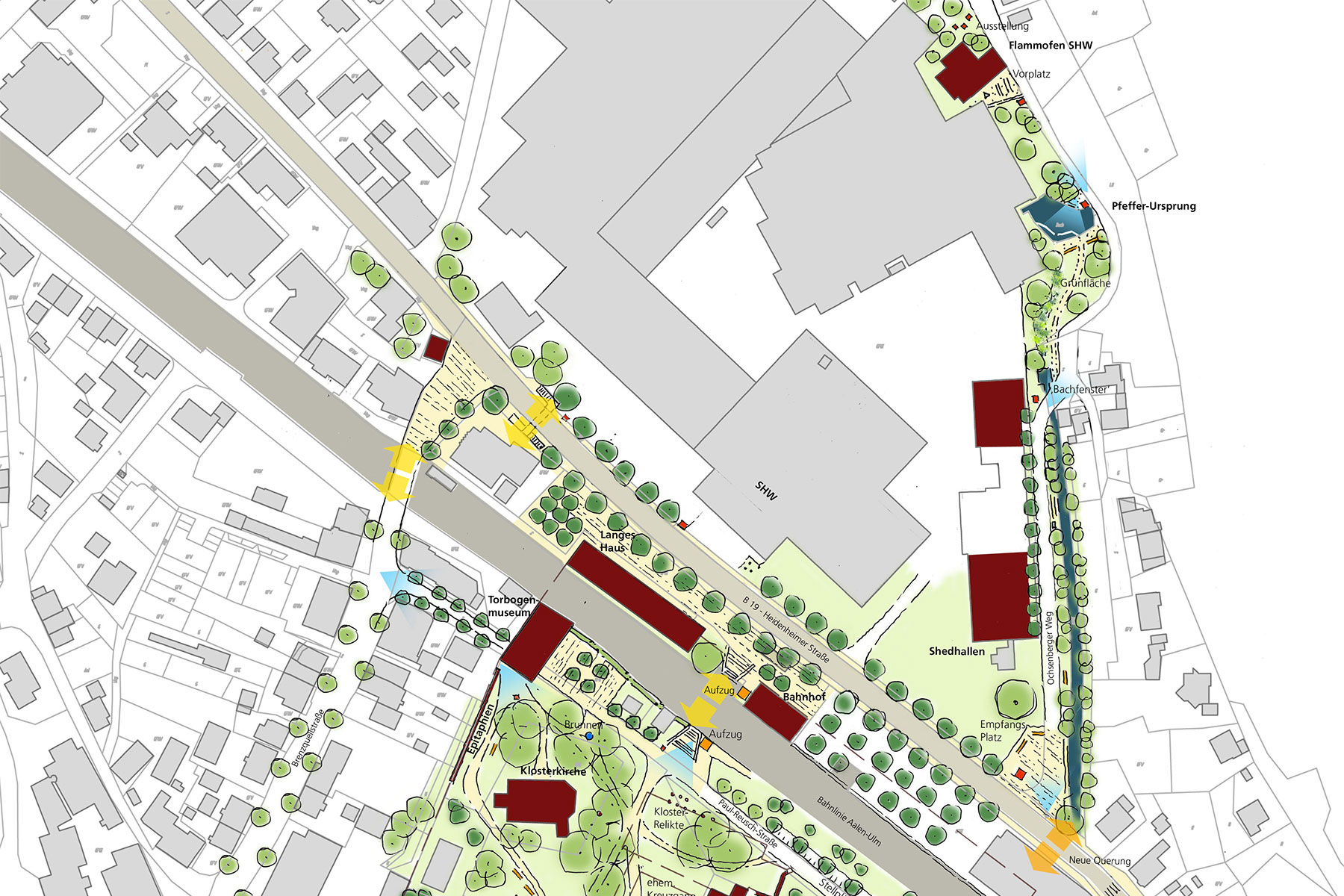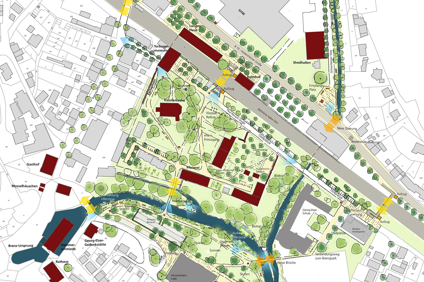 Die naturräumlichen Elemente wie Brenz und Pfeffer bilden dabei die Kernbereiche für einen attraktiv gestalteten Freiraum, der die einzelnen Sehenswürdigkeiten verbindet und zu einem lebenswerten Aufenthaltsort beiträgt.