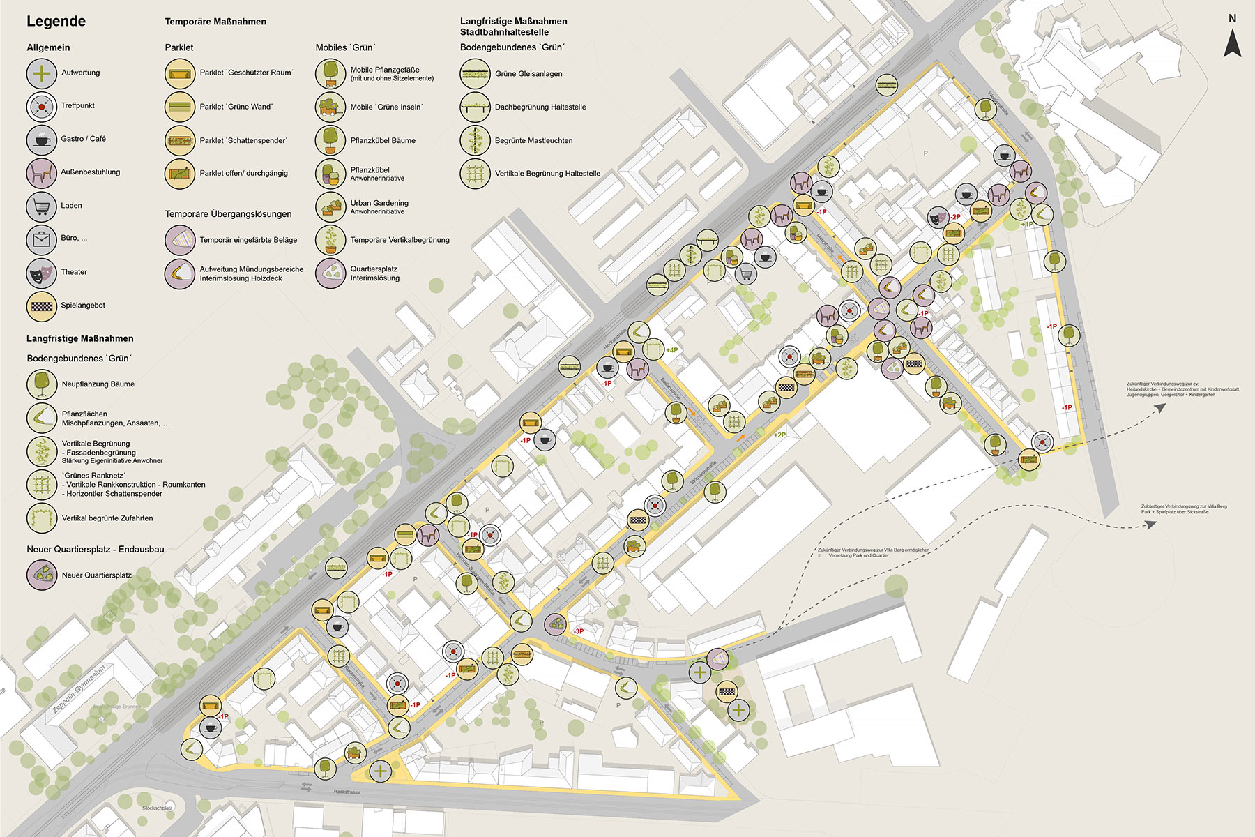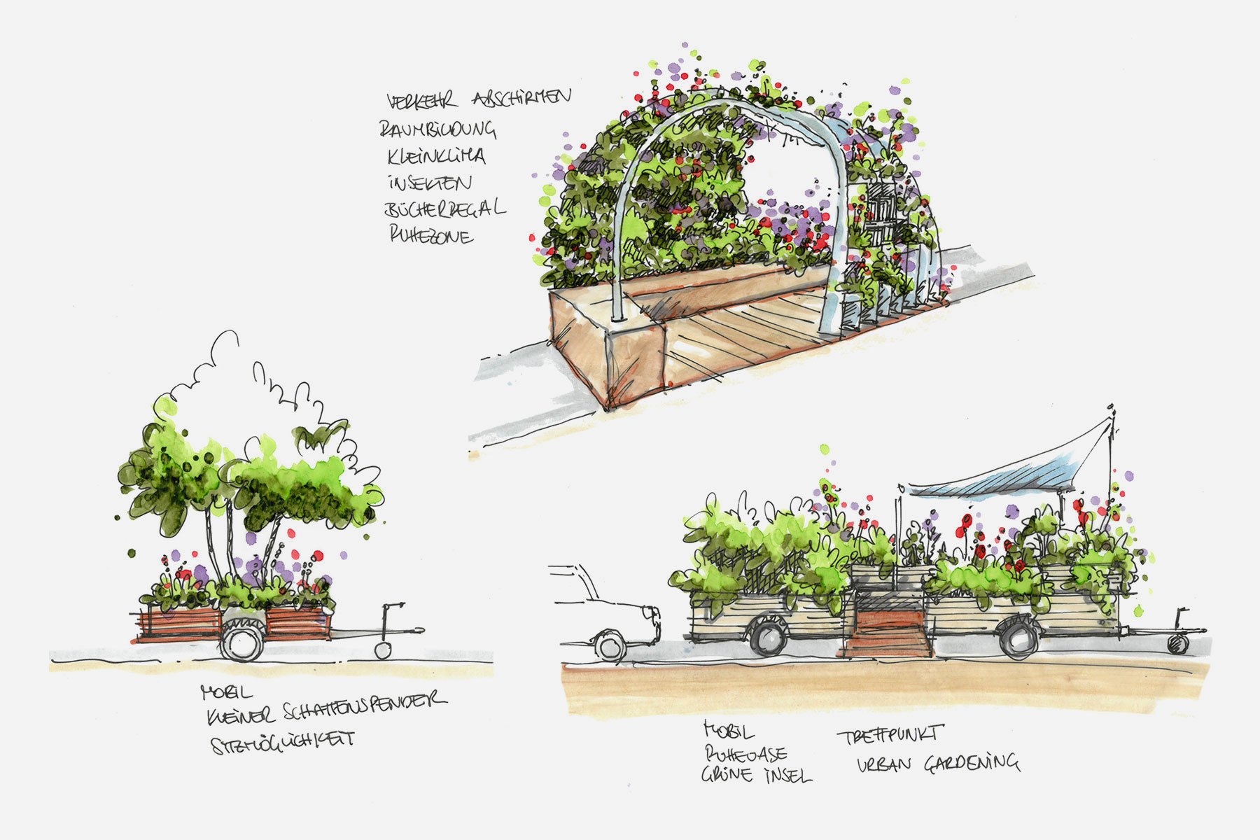 Neben den kurzfristigen Grüninterventionen stehen langfristige Ziele, die, durch ergänzende und neue Begrünungs-, sowie Entsiegelungsmaßnahmen, den Verkehrsraum zunehmend in qualitativ hochwertige Aufenthalts- und Grünräume mit vielfältigen Angeboten wandeln sollen.