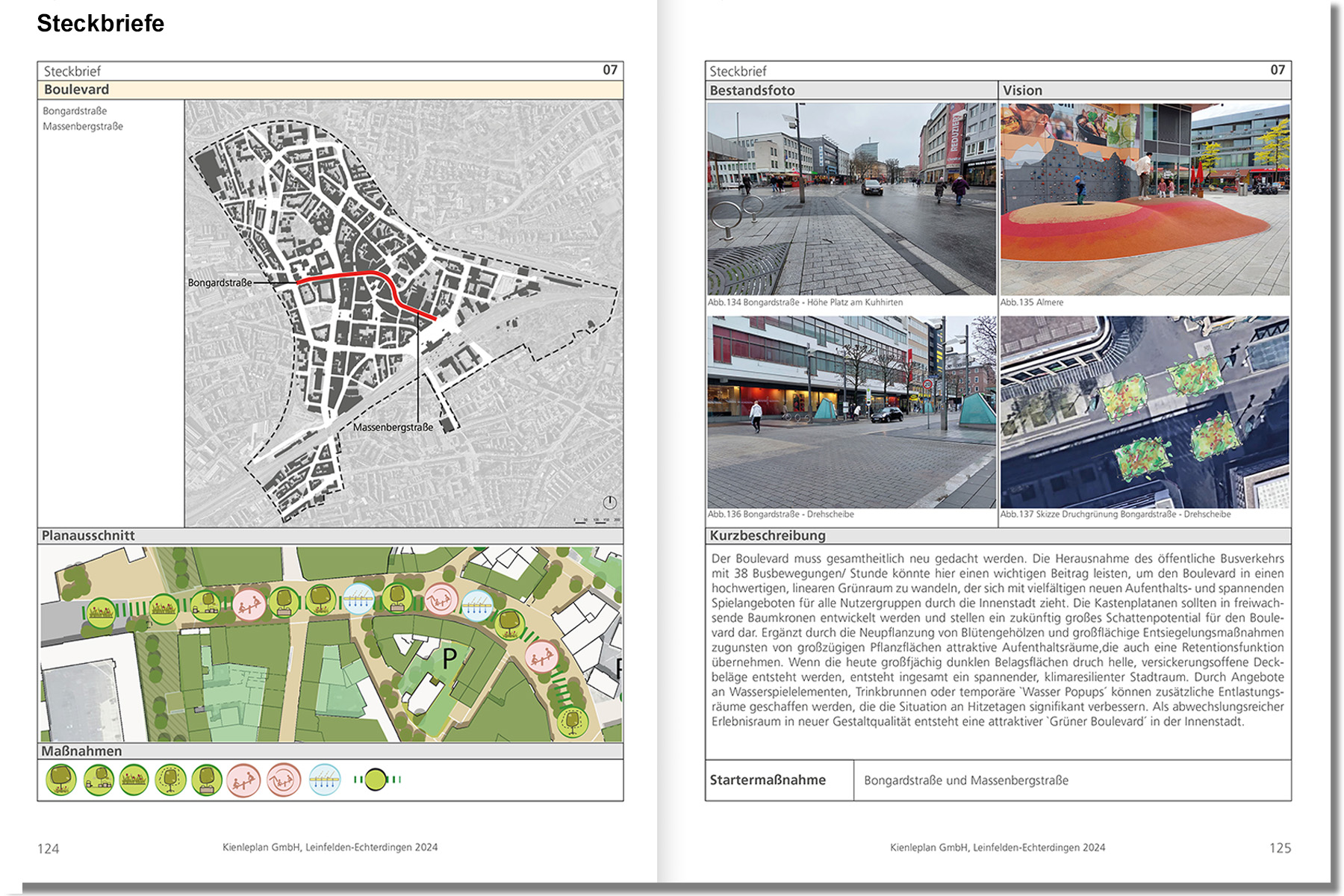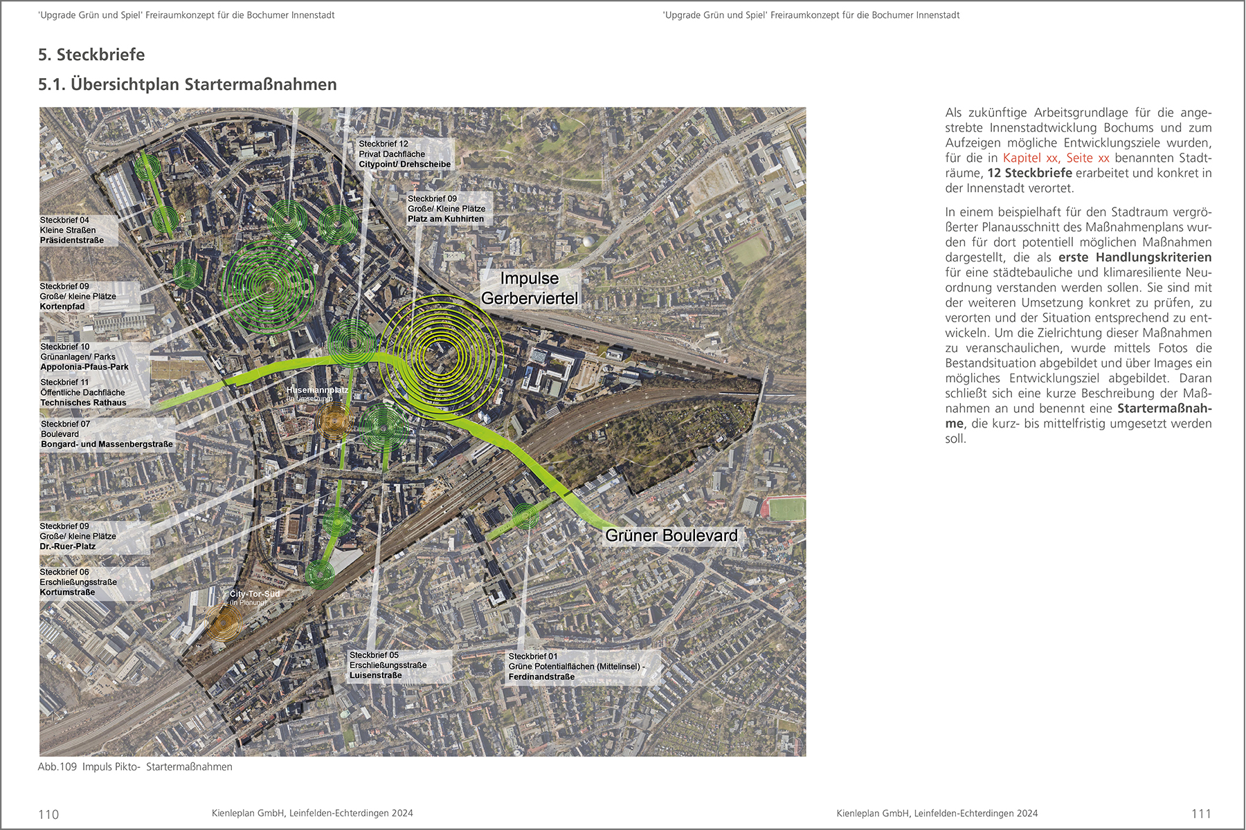 Als zukünftige Arbeitsgrundlage für die angestrebte Innenstadtwicklung Bochums und zum Aufzeigen mögliche Entwicklungsziele wurden Maßnahmenbündel erarbeitet und für ausgewählte Stadträume, Steckbriefe erstellt.