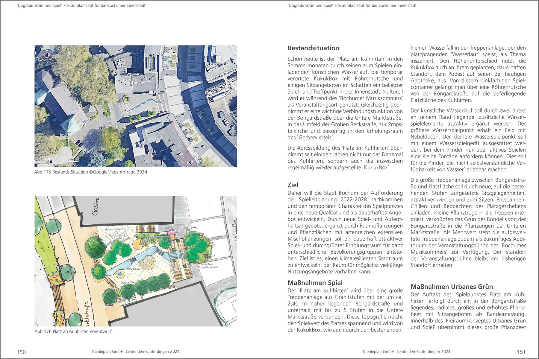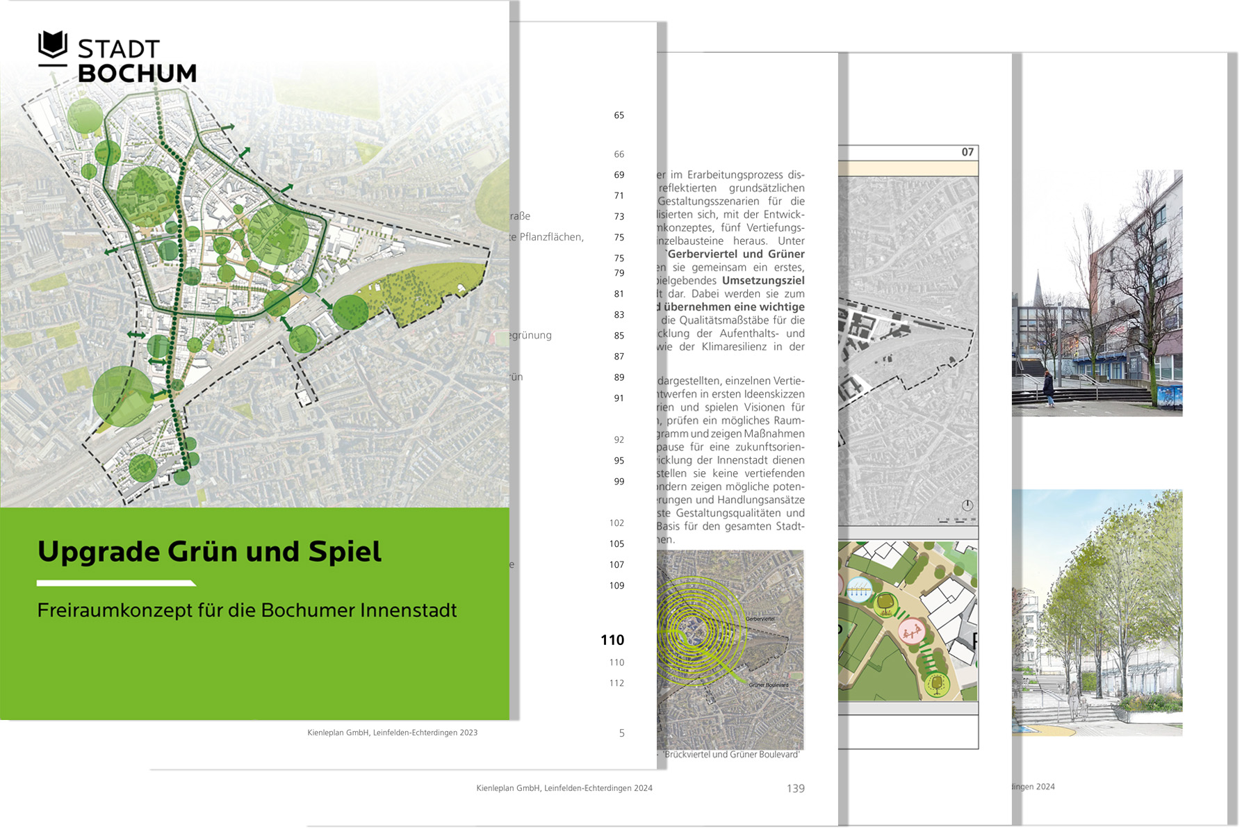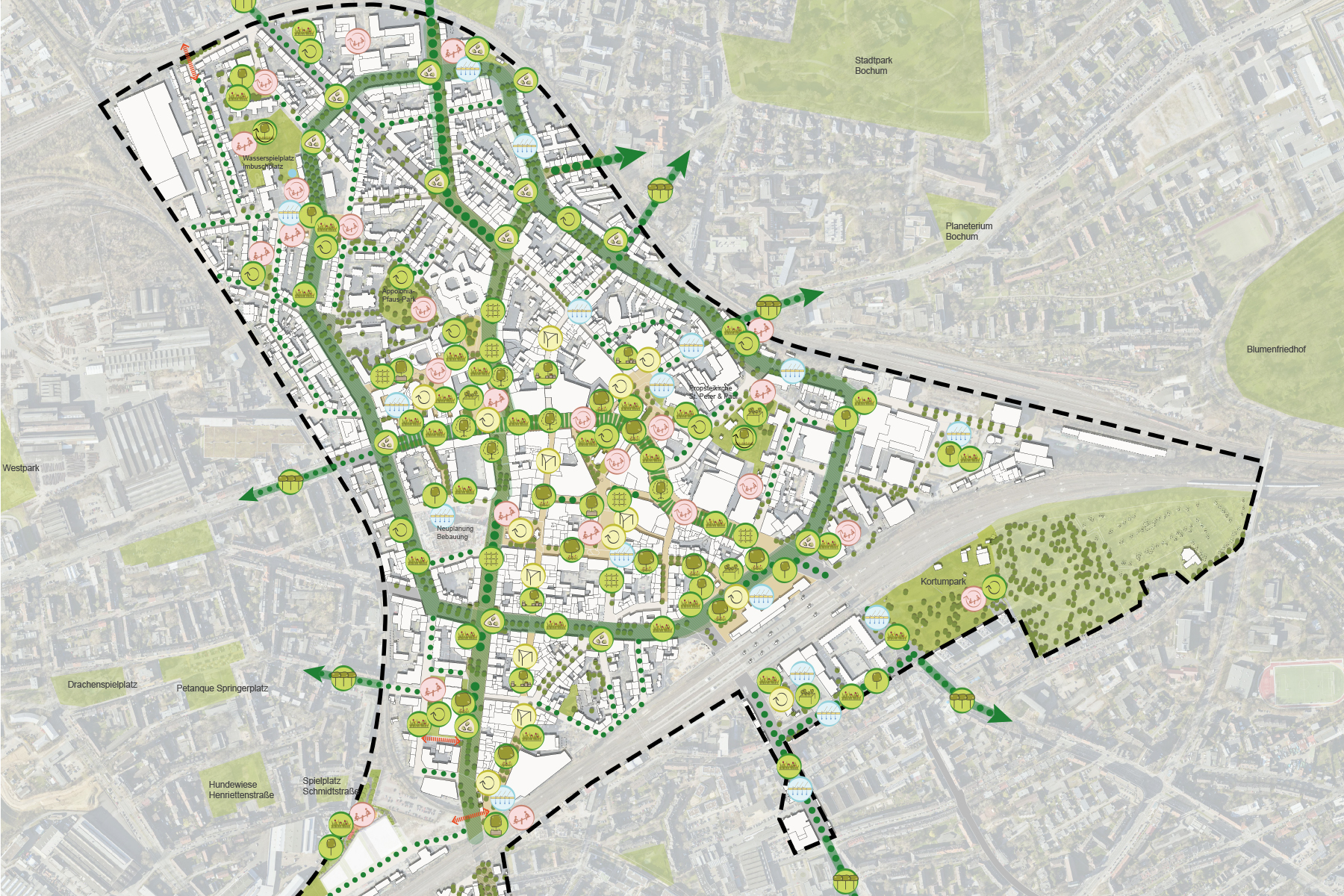 Das `Gesicht einer Stadt´ wird maßgeblich vom Öffentlichen Raum bestimmt, der viele Funktionen erfüllen muss. Durch die Folgen des Klimawandels und die multiplen Krisen unserer Zeit, stehen viele Städte heute vor fundamentalen Veränderungen und müssen ihre Stadträume an die neuen Herausforderungen anpassen. Die Stadt Bochum hat daher schon länger mit ihrem Stadtumbauprozess begonnen. Mit dem vorliegenden Freiraumkonzept `Upgrade Grün und Spiel´ wird dieser begonnene Stadtumbau mit Durchgrünungsmaßnahmen und mehr Aufenthaltsqualität verknüpft und zu einem `Grünen Stadtumbauprozess´ weiterentwickelt