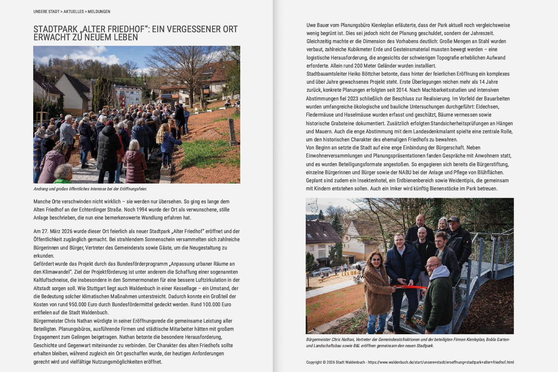 Stadt Waldenbuch - Eröffnung Stadtpark `Alter Friedhof´ Stadt Waldenbuch 2026 Eröffnung Stadtpark `Alter Friedhof´ Weiterlesen … Stadt Waldenbuch - Eröffnung Stadtpark `Alter Friedhof´