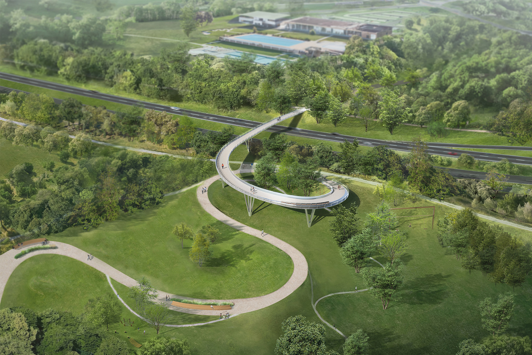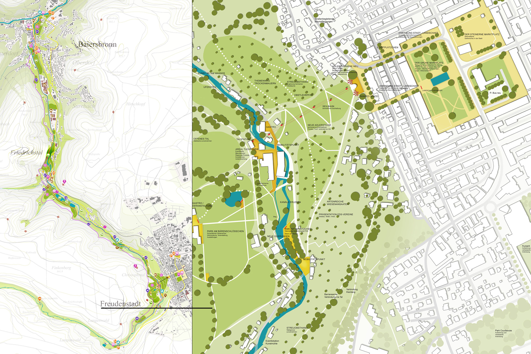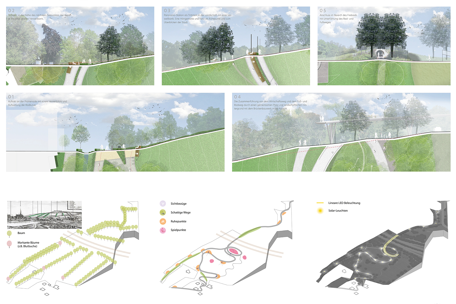 Mit neuem Schwung und viel Elan barrierefrei zu Berge und zu Tale. Ein Landschaftserlebnis, geprägt voller Gegensätzlichkeiten und voller Vielfalt und Qualität. Mit großer Spannung, ohne jemals das Ziel vor Augen zu haben erfährt der Ort eine immense Aufwertung. Ein Stück Landschaft für alle. Die Geschichte der Kulturlandschaft wird respektiert und neu interpretiert. Aus der Landnutzung abgeleitete Elemente tauchen mit neuem Selbstbewusstsein auf, werten die Flächen ökologisch auf und prägen den Ort. Altes mit Neuem verbinden. Promenade-Schneegarten-Wunschgarten-Landschaftsgarten.