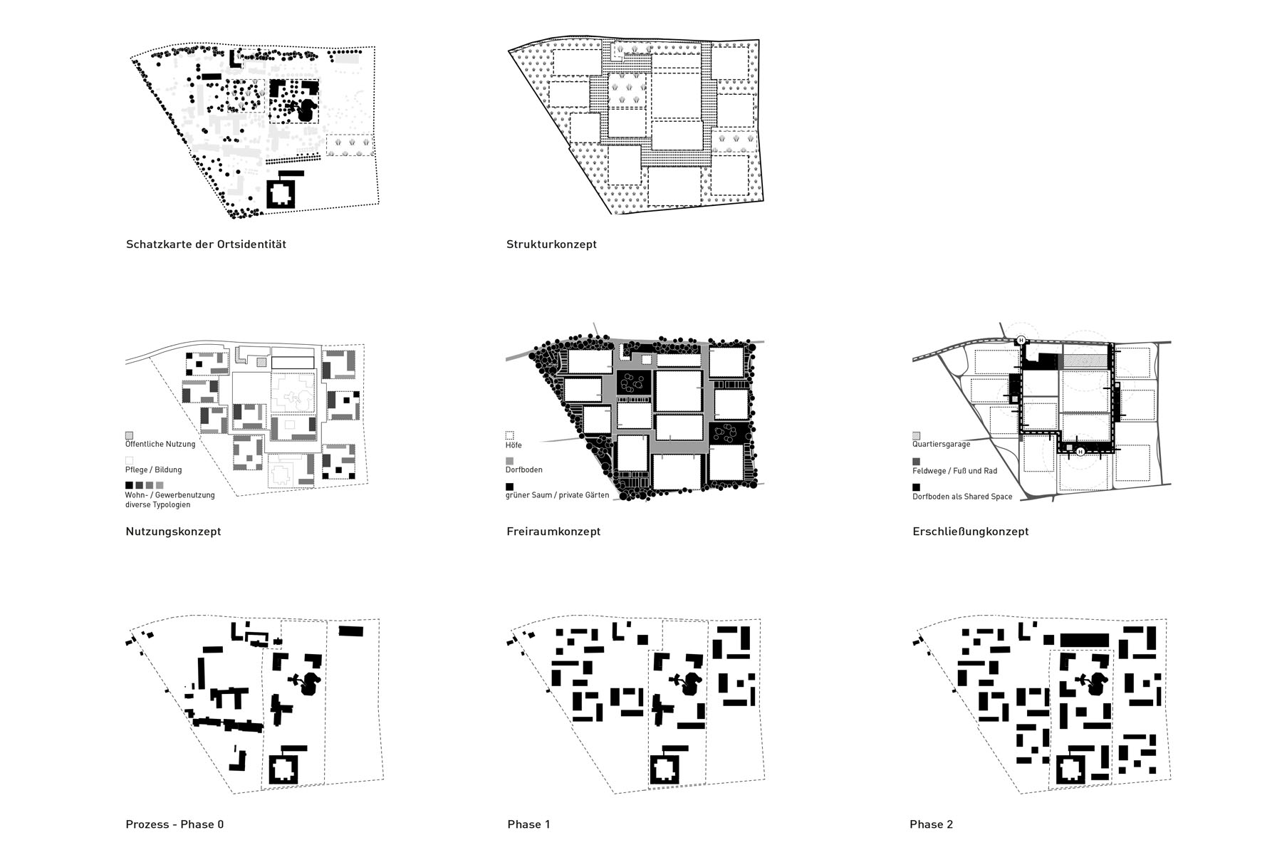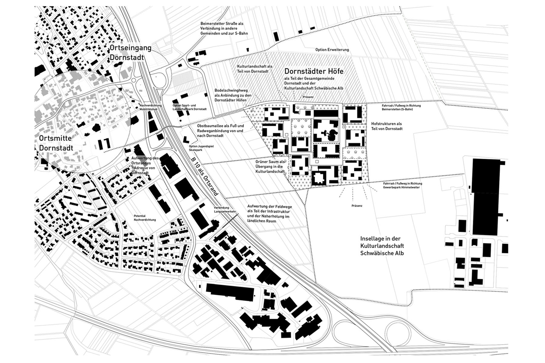 Diese Grundfrage nahmen wir zum Anlass Ort und Programm auf ihre Synergien hin zu betrachten. Ähnlich einem Ökoton entsteht für uns aus dieser Kombination des Ruralen und Urbanen ein ganz eigener Lebensraum mit besonderen Typologien in der Architektur und in den Freiräumen, die ihre Basis im Ortstypischen haben. Ein ländlich urbanes Quartier befriedigt den Wunsch nach Individualität und Rückzugsorten ebenso wie jenen nach Gemeinschaft und Austausch. Nicht das generische Einfamilienhausgebiet sondern ein Quartier mit Ortsidentität und Qualität zu entwickeln war unser Ziel. Ein Quartier, das einen Namen trägt, identifizierbar ist und eine dem Ort entsprechende bauliche wie atmosphärische Dichte entwickelt: Die Dornstädter Höfe