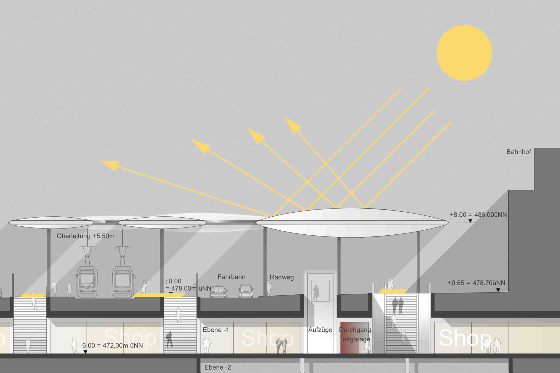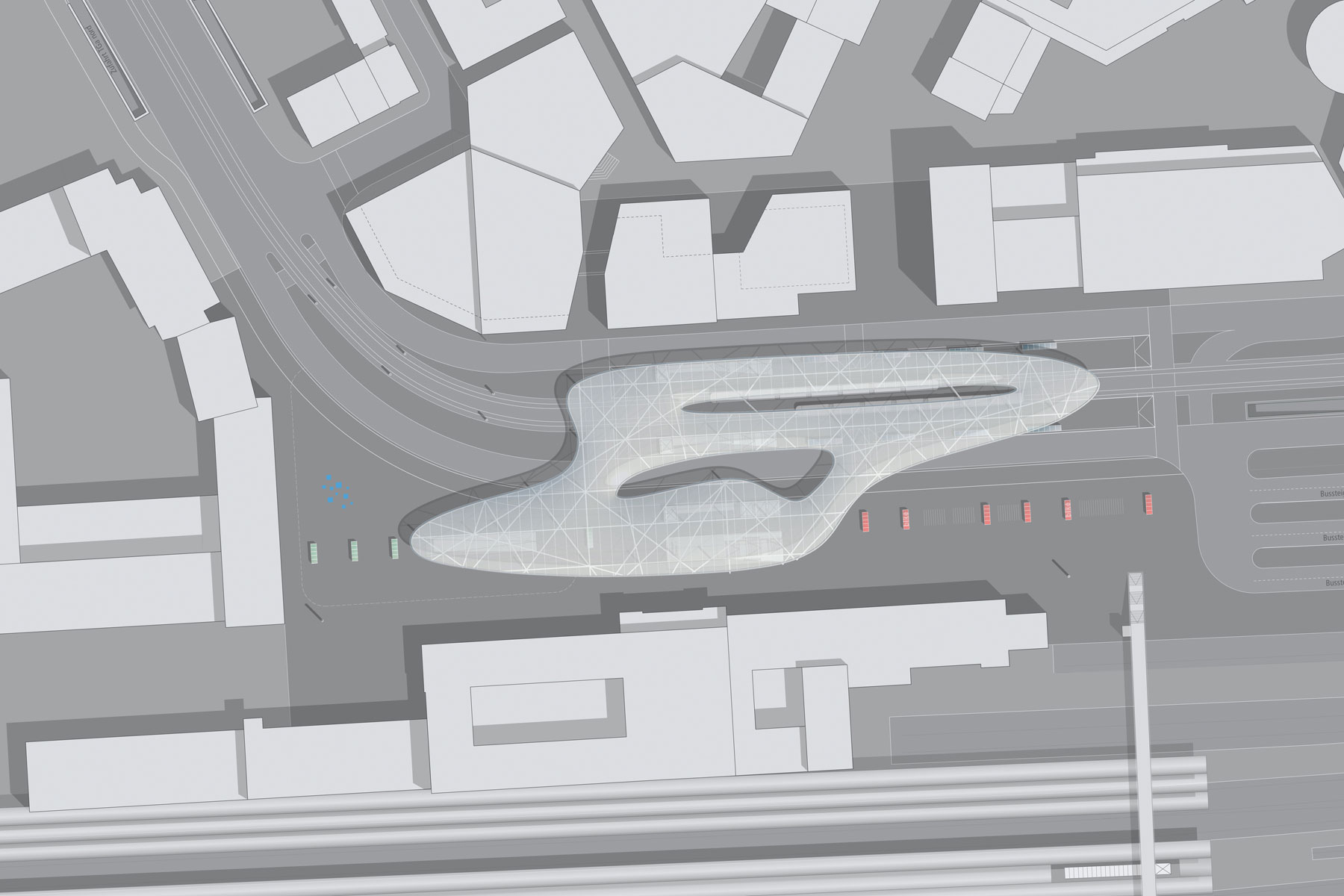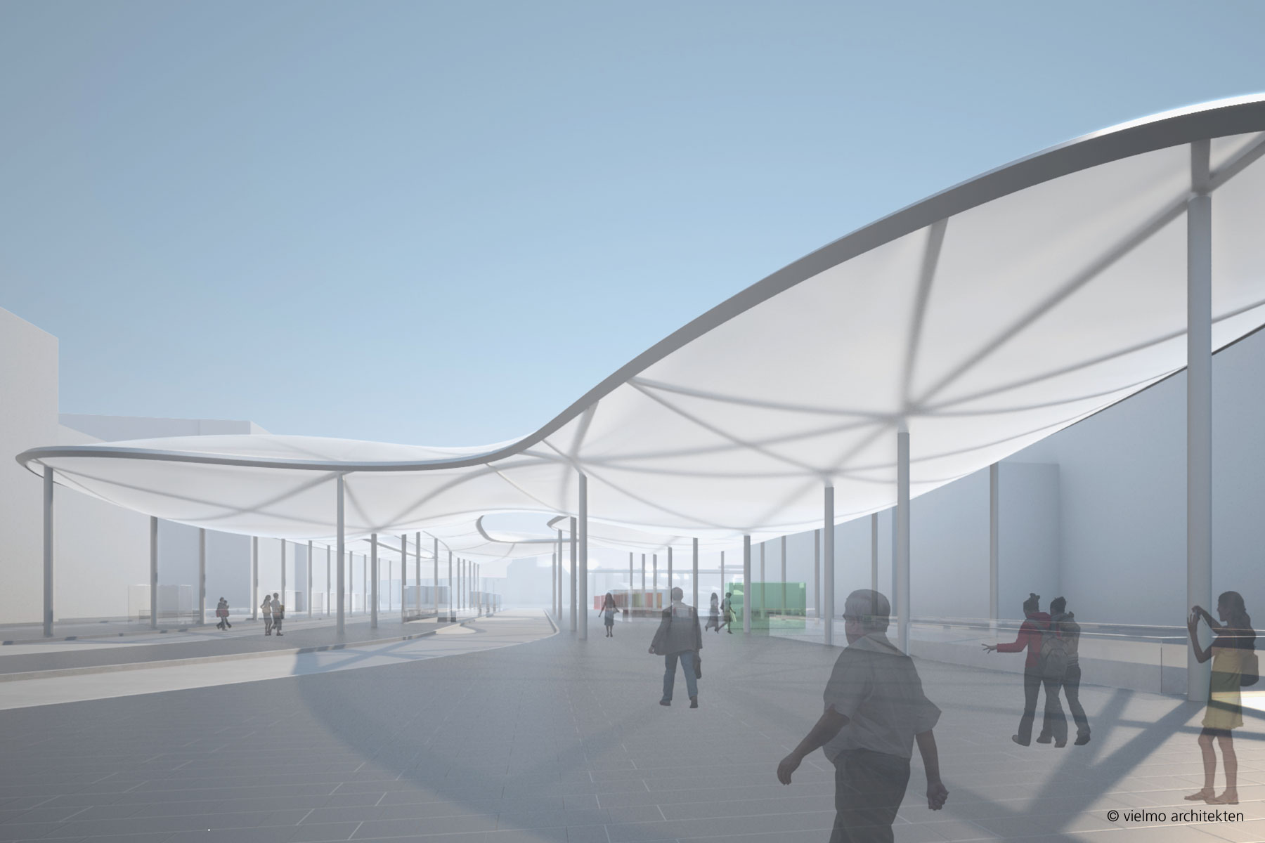 Diese Charakteristik einer langfristigen räumlichen Transformation eines zentralen öffentlichen Raumes in der Stadt fordert eine besondere Form der Konzeption des Bahnhofsplatzes: Eine große Geste, die die Dynamik und die komplexen Verknüpfungen der Verkehre und Bewegungsströme erfasst und gleichermaßen die Architektur der Platzränder in ihrer Entwicklung freilässt (offen hält). Die Stadt Ulm ist in ihrer langen Geschichte eine Stadt der großen Gesten. Das Konzept sieht deshalb vor, den Bahnhofsplatz mit einem dynamischen, organisch geformten, elastisch schwebenden Dach zu überspannen, das den Platzraum funktional wie räumlich markiert und selbstverständlich alle Funktionen miteinander vereint. Die großräumliche Geste wird durch eine leichte Konstruktionsform kontrastiert.