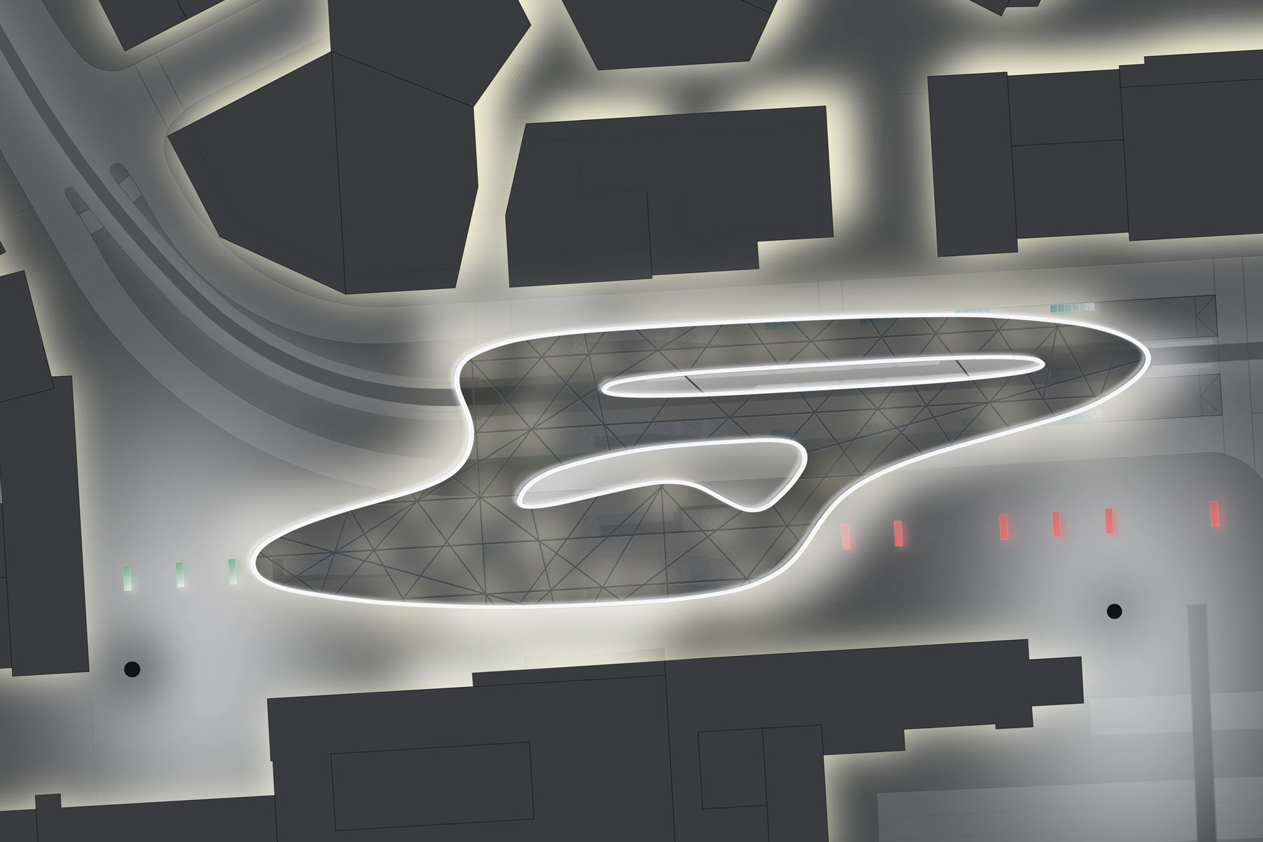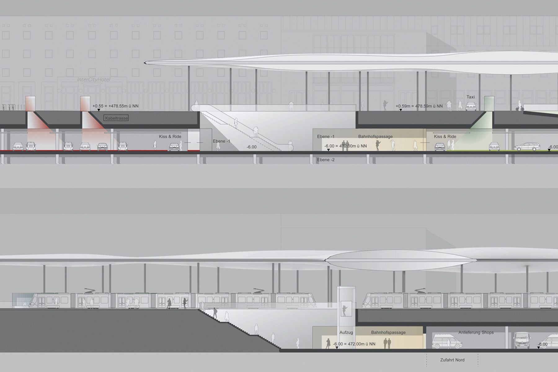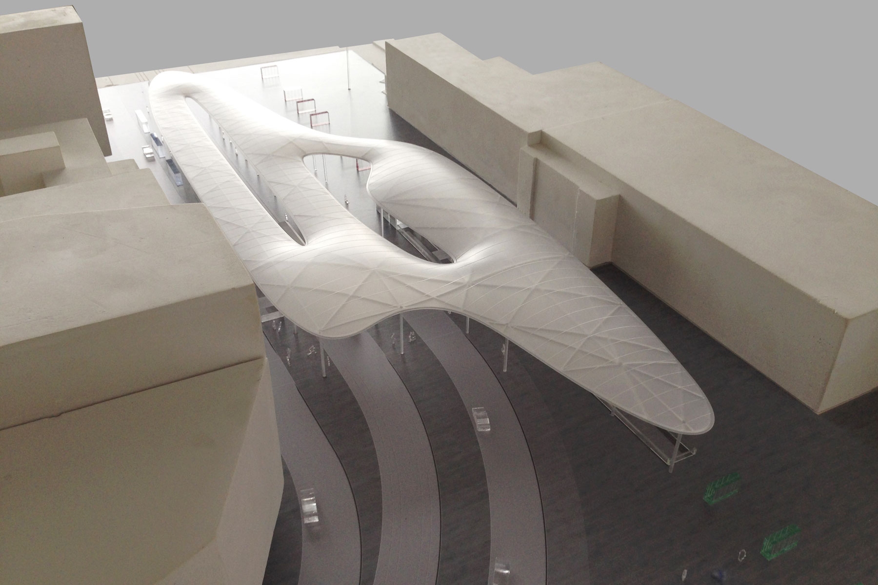 Diese Charakteristik einer langfristigen räumlichen Transformation eines zentralen öffentlichen Raumes in der Stadt fordert eine besondere Form der Konzeption des Bahnhofsplatzes: Eine große Geste, die die Dynamik und die komplexen Verknüpfungen der Verkehre und Bewegungsströme erfasst und gleichermaßen die Architektur der Platzränder in ihrer Entwicklung freilässt (offen hält). Die Stadt Ulm ist in ihrer langen Geschichte eine Stadt der großen Gesten. Das Konzept sieht deshalb vor, den Bahnhofsplatz mit einem dynamischen, organisch geformten, elastisch schwebenden Dach zu überspannen, das den Platzraum funktional wie räumlich markiert und selbstverständlich alle Funktionen miteinander vereint. Die großräumliche Geste wird durch eine leichte Konstruktionsform kontrastiert.