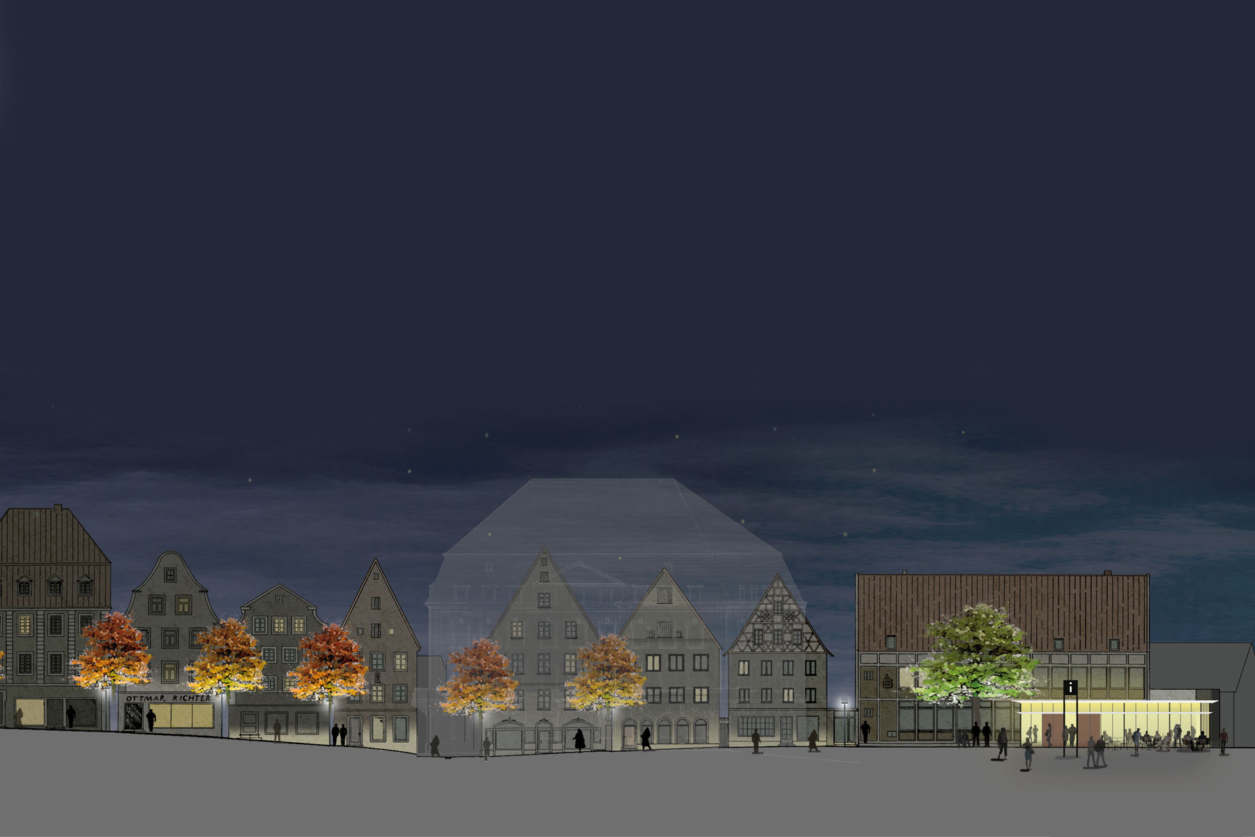 Die Solitärstellung des ehemaligen Rathauses vor dem Borgen der Bürgerhäuser darf durch einen neu in den Platz gestellten Baukörper nicht angetastet werden. Deshalb wird vorgeschlagen den Neubau des Marktpavillons an das westliche Ende des ‚Bürgerbogens‘ anzudocken. Die Architektur des Pavillons ist transparent und leicht – Materialien Stahl, Glas und textiler Sonnenschutz.