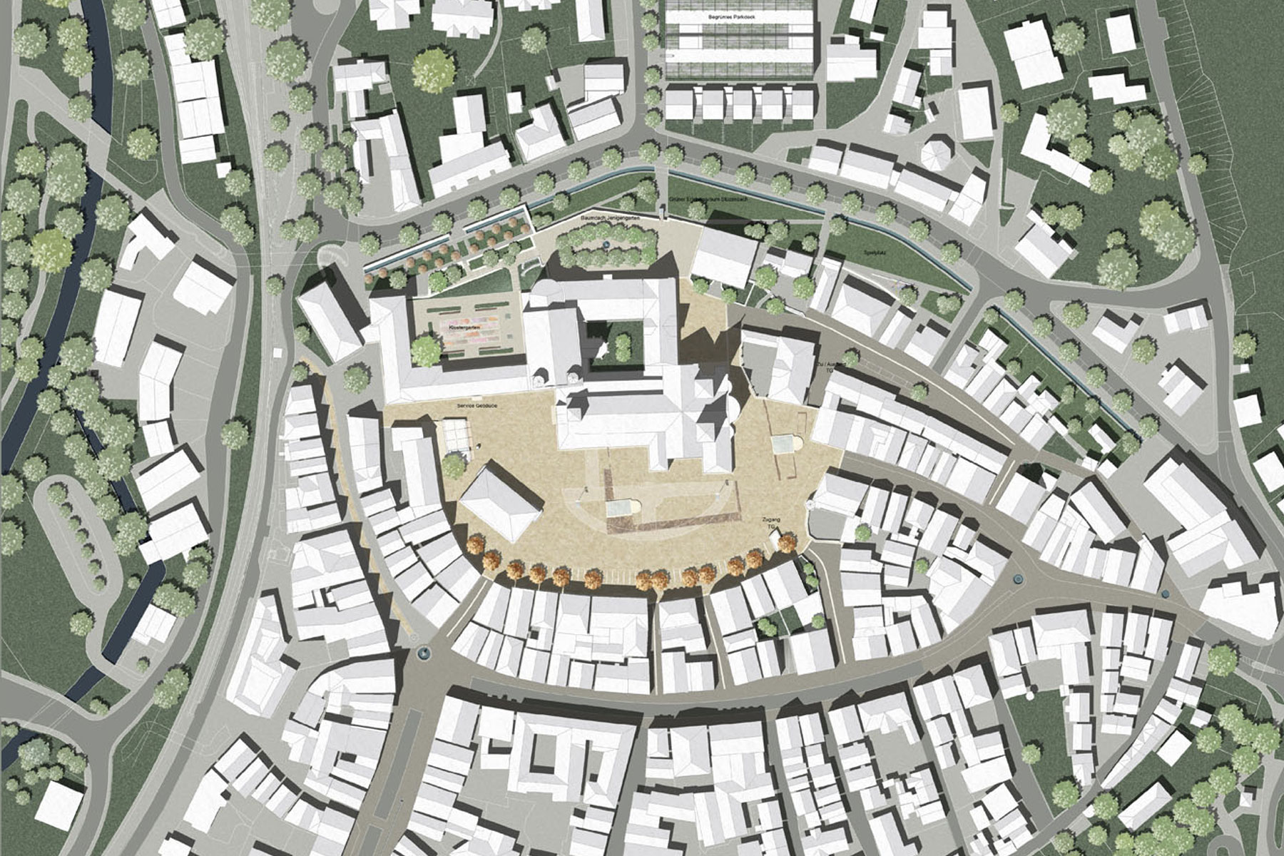 Der heute funktional in Marktgeschehen und Verkehrsbereich geteilte Markplatz wird wieder zu einem einheitlichen, durchgängigen Platz transformiert.
