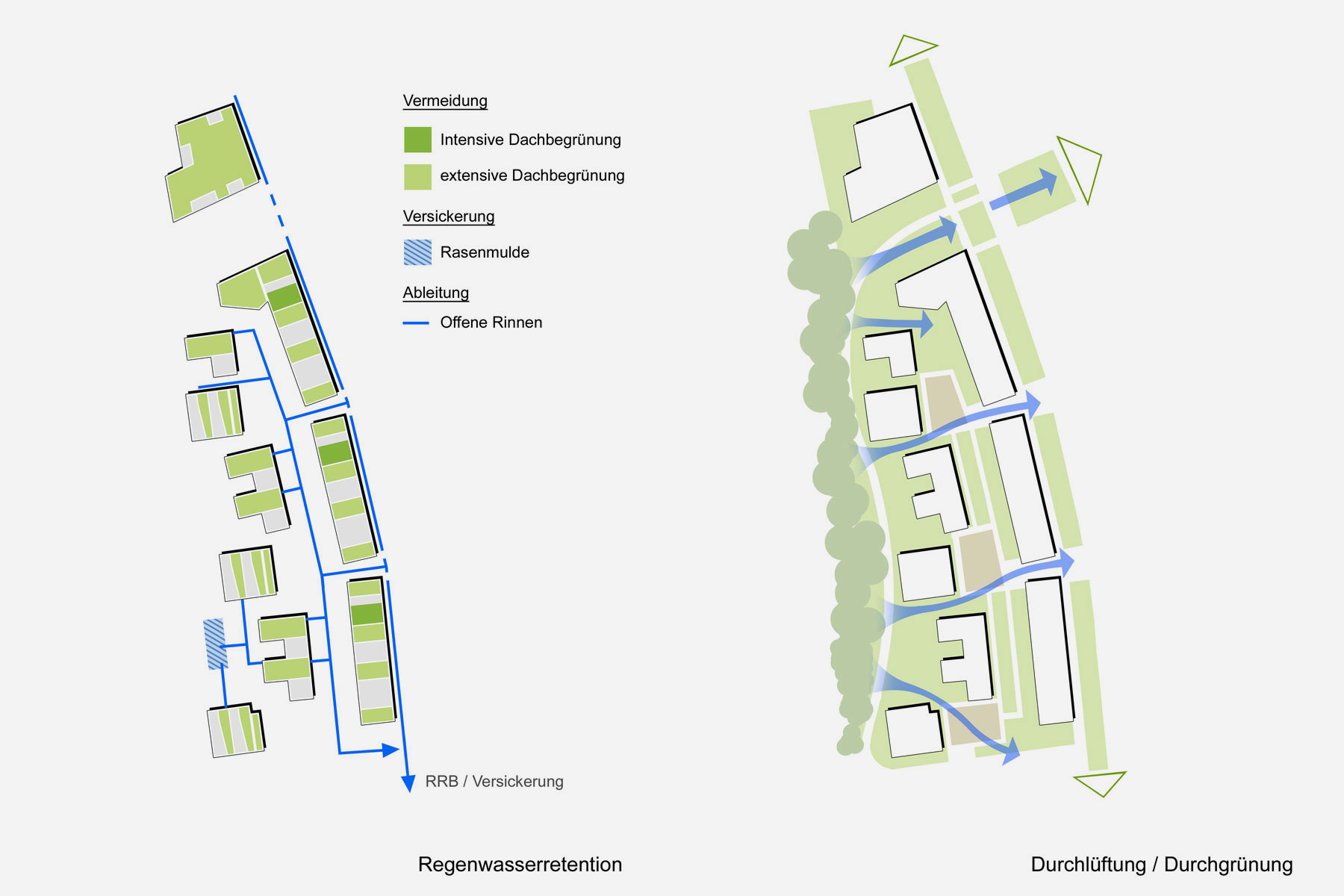 Der Umgang mit Regenwasser ist beim neuen Quartier Programm. Vermeidung vor Versickerung und Ableitung. Das hohe Maß an dachbegrünten Flächen und arrondierenden Grünflächen ermöglichen eine natürliche Regenwasserrückhaltung und verhindern weitgehend den Abfluß. Überschusswasser wird teils in Sickermulden aufgefangen, teils, wo aus topografischen Gegebenheiten nicht möglich, in offene Rinnen und angrenzende Wiesenmulden dem südlich angrenzenden Regenrückhaltebecken zugeführt. Das öffentliche Kanalnetz wird dadurch effektiv entlastet.