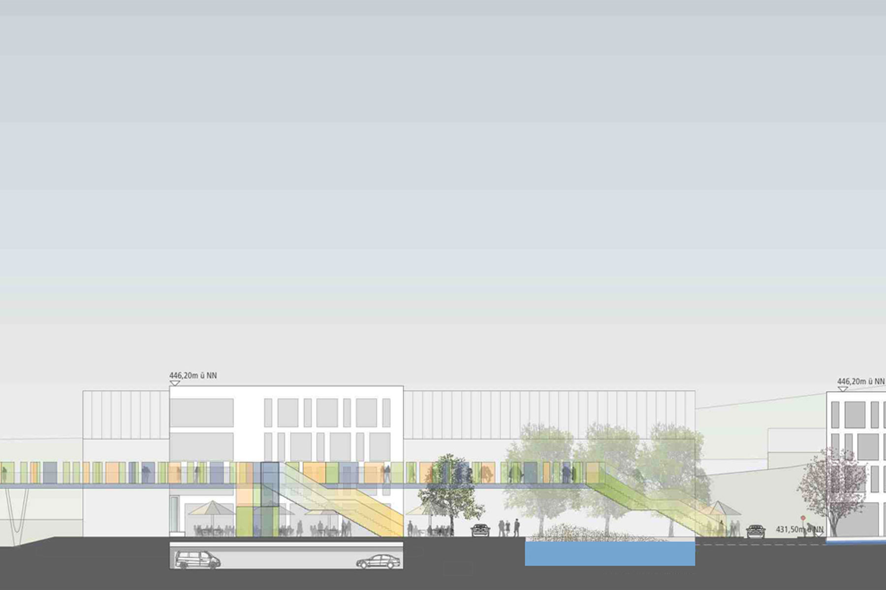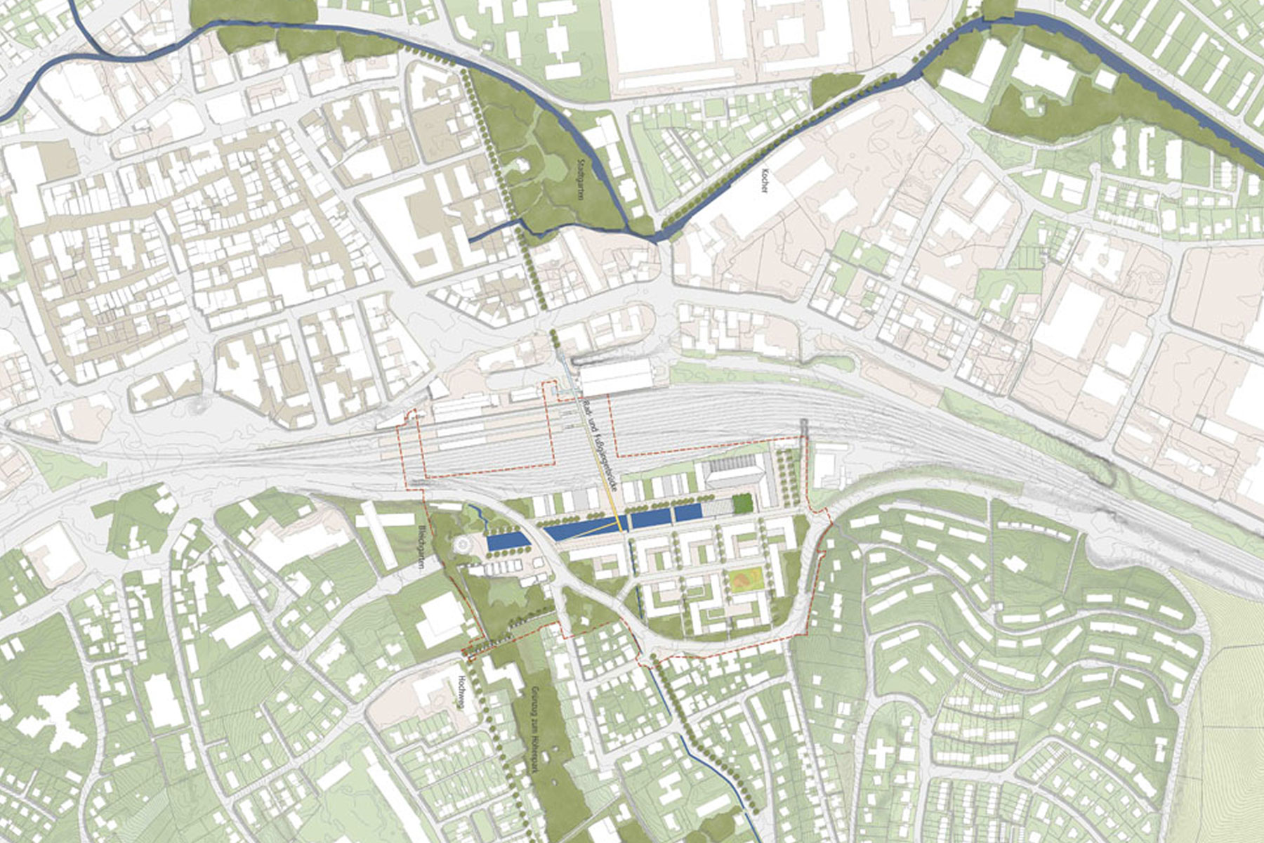 Mit großer Leichtigkeit und wie selbstverständlich legt sich das neue Stadtquartier in die bestehende Topographie mit maßstäblicher Einbindung der vorhandenen Randbebauung. Bebauung und Freiräume stehen in spannungsvollen Kontrast zueinander mit angemessenen Flächenanteilen.
