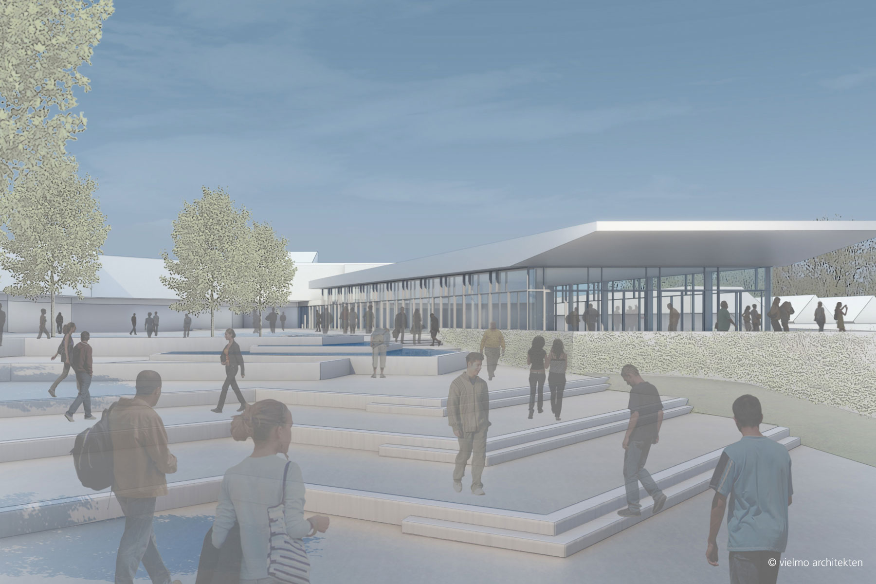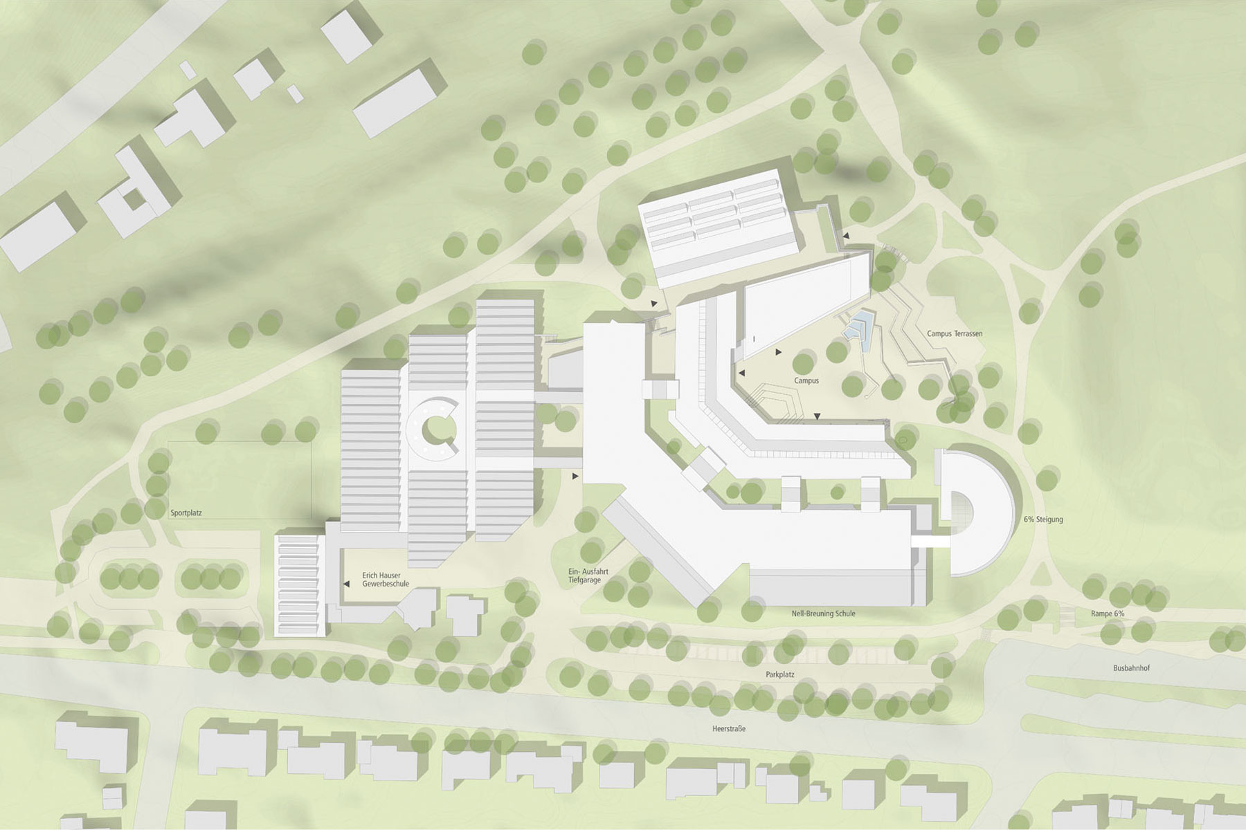 Der Gebäudeflügel der „Neuen Mitte“ des BSZ klärt den derzeit abgestuften nördlichen Rand des Campus. Der damit dreiseitig klar gerahmte Schulhof öffnet sich zur Landschaft, seine Hochlage auf der Bruderschaftshöhe bietet einen schönen Blick auf die Kernstadt Rottweils.