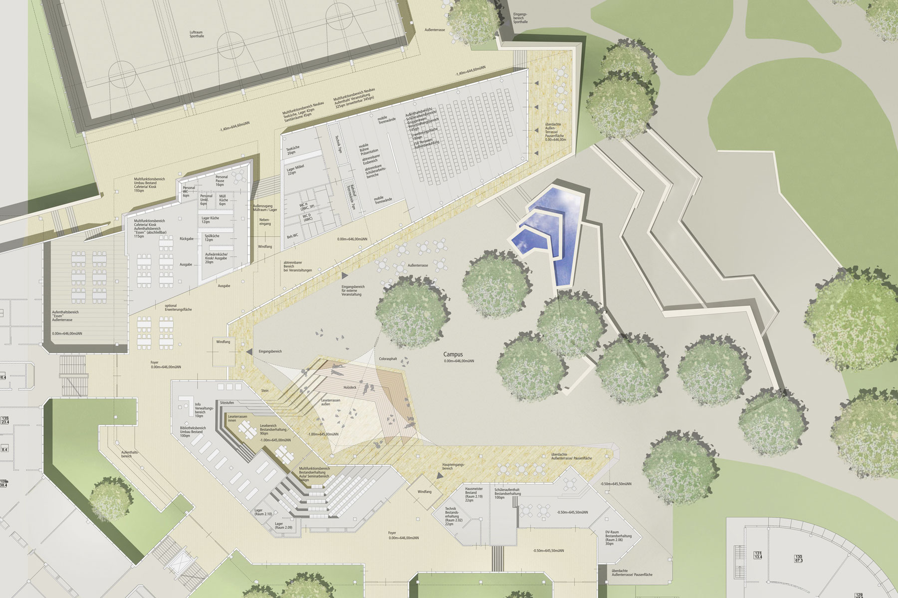 Der nach Osten abgestufte Campus wird in seiner ursprünglichen Grundform erhalten – der Hof wird aber „aufgeräumt“. Damit wird ein großzügiger, offener und einheitlicher Raum geschaffen, dessen Stufengeometrie deutlicher ablesbar und damit auch durchgängig nutzbar wird.