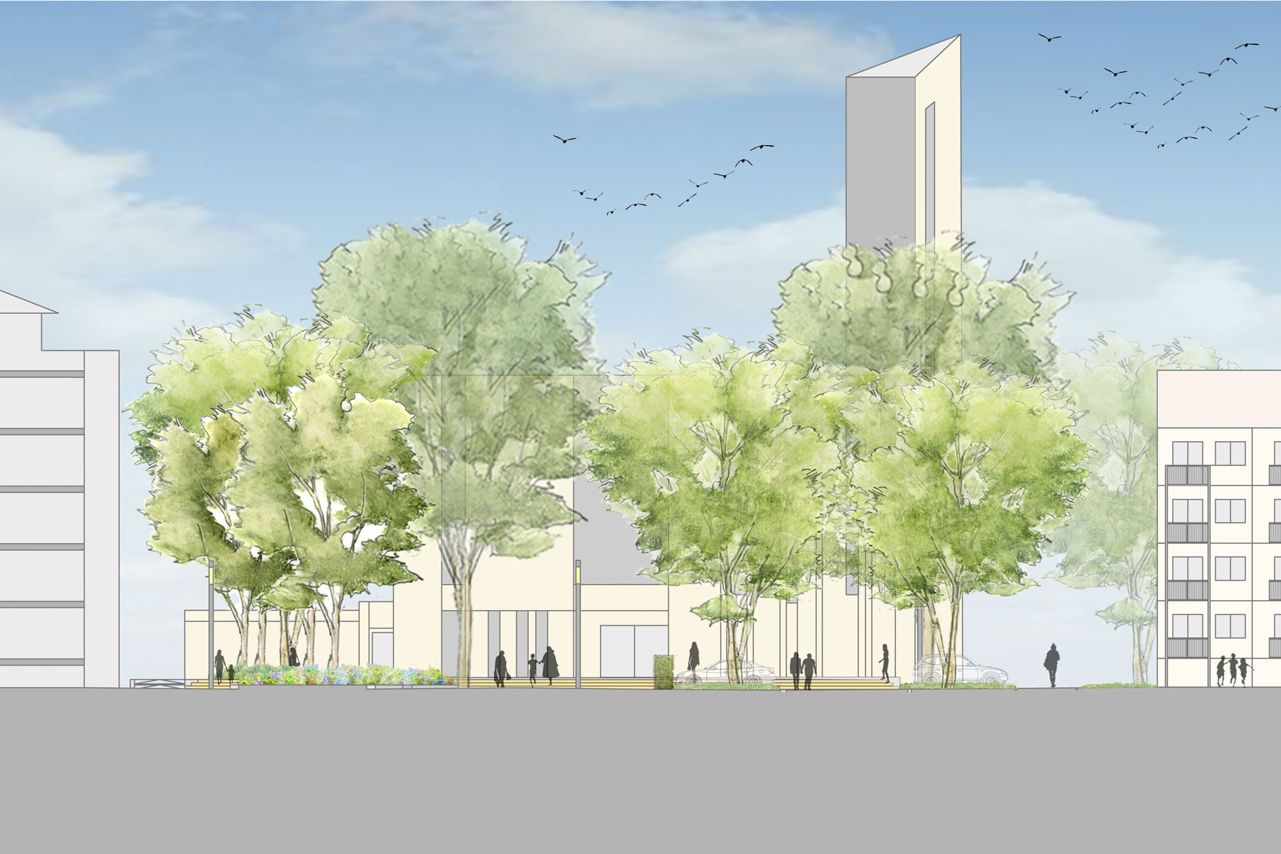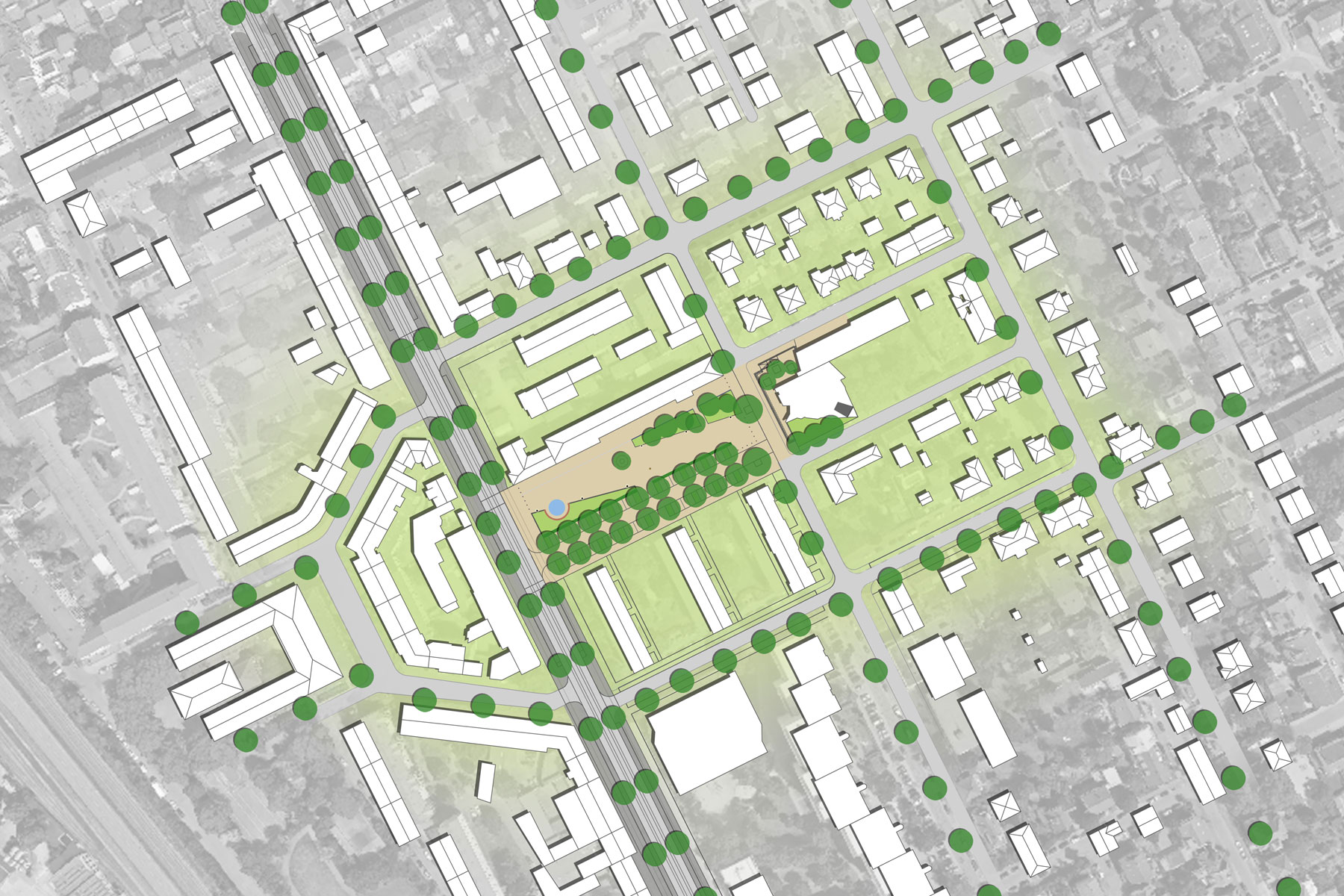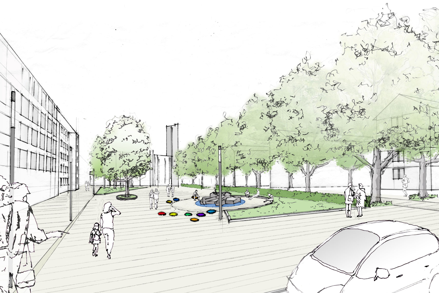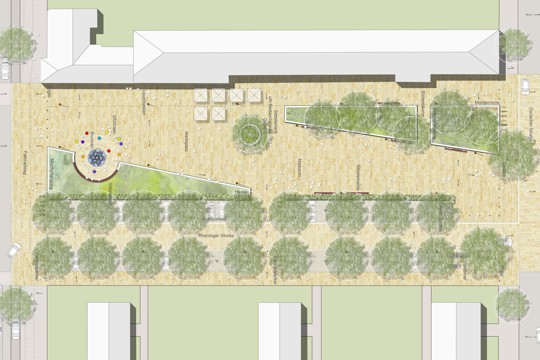 Städtebaulich wird der Stadtteil Rheinau wie das historische Mannheim durch eine strenge Stadtrasterung geprägt. Eine städtebauliche Sonderstellung nimmt das Quartier um den Marktplatz, insbesondere durch die Versöhnungskirche ein. Sie galt als eine der provozierendsten Neuschöpfungen im Mannheimer Süden nach 1945, erschaffen von einem der „bedeutendsten deutschen Architekten der letzten 50 Jahre“. Die Kirche erhält durch behutsamen Eingriff in die Grünstruktur wieder die ihr angemessene Stellung auf dem Platz. Aus dem Kirchturm abgeleitet wird eine Platzdiagonale, welche den Stadtraum in seinen Proportionen beschreibt. Durchblicke, Zonierungen und die geschlossene grüne Raumkante südlich des Platzes gegen die Zeilenstruktur stehen der offenen grünen Raumstruktur der Nordseite des Platzes gegenüber. Die Flächen des Individualverkehrs werden zentralisiert. Durch bewusstes ‚Aufräumen‘ des Platzes in klare geometrische Bezüge wird dem Platz wieder ein Ordnungsprinzip unterlegt. Querungen und Vernetzungen mit dem vorhandenen Wege- und Straßensystem erzeugen eine gute Anbindung an angrenzende Stadtfelder, umgekehrt lädt der Platz alle umliegenden Quartiere mit seiner neu geschaffenen Qualität ein.