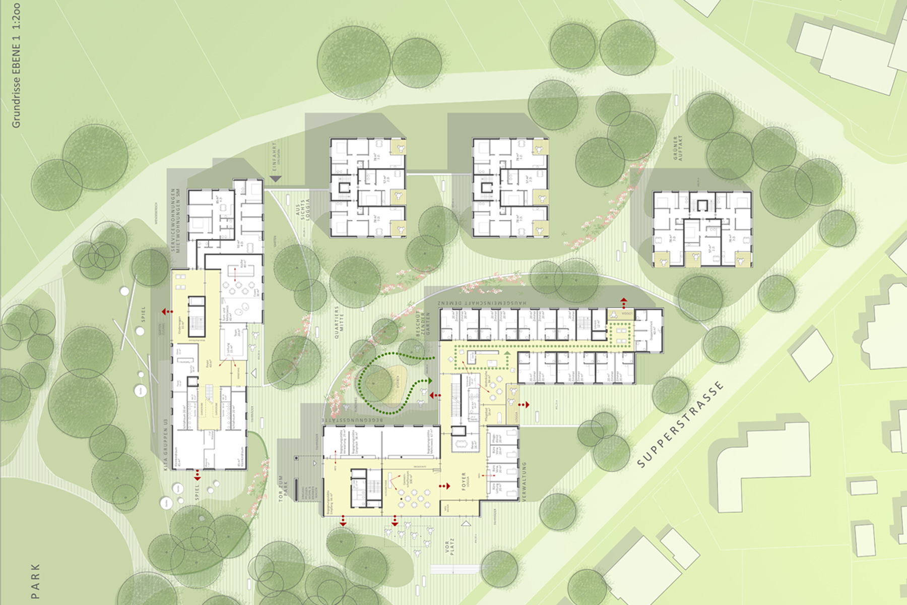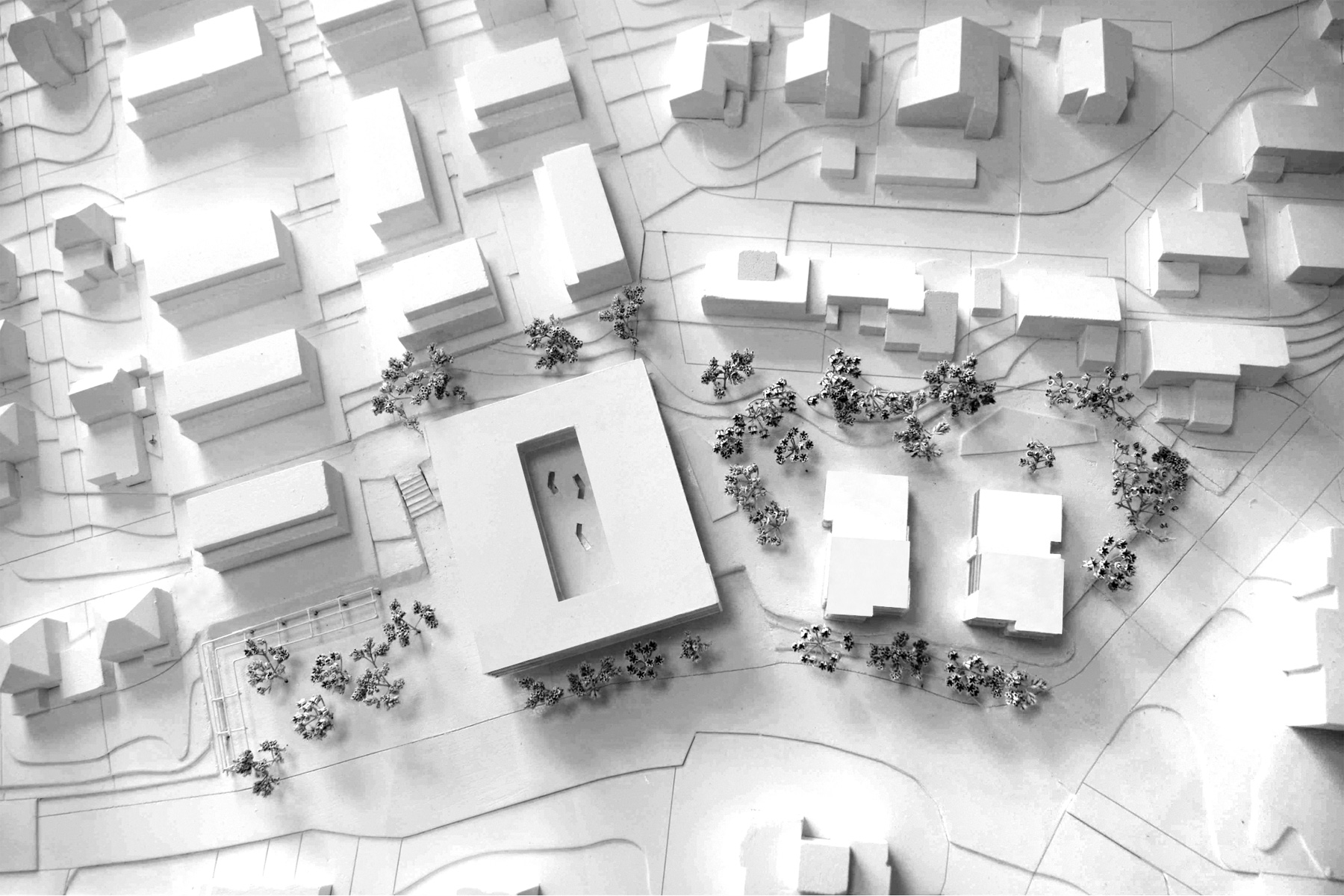 Kontrapunktisch inszeniert sich der neue Park, die neue Grüne Mitte. Wie ein langes Band setzt der geschwungene Weg als neue Verbindung zwischen Bahnlinie und Schule/Klinikum einen deutlichen Akzent.