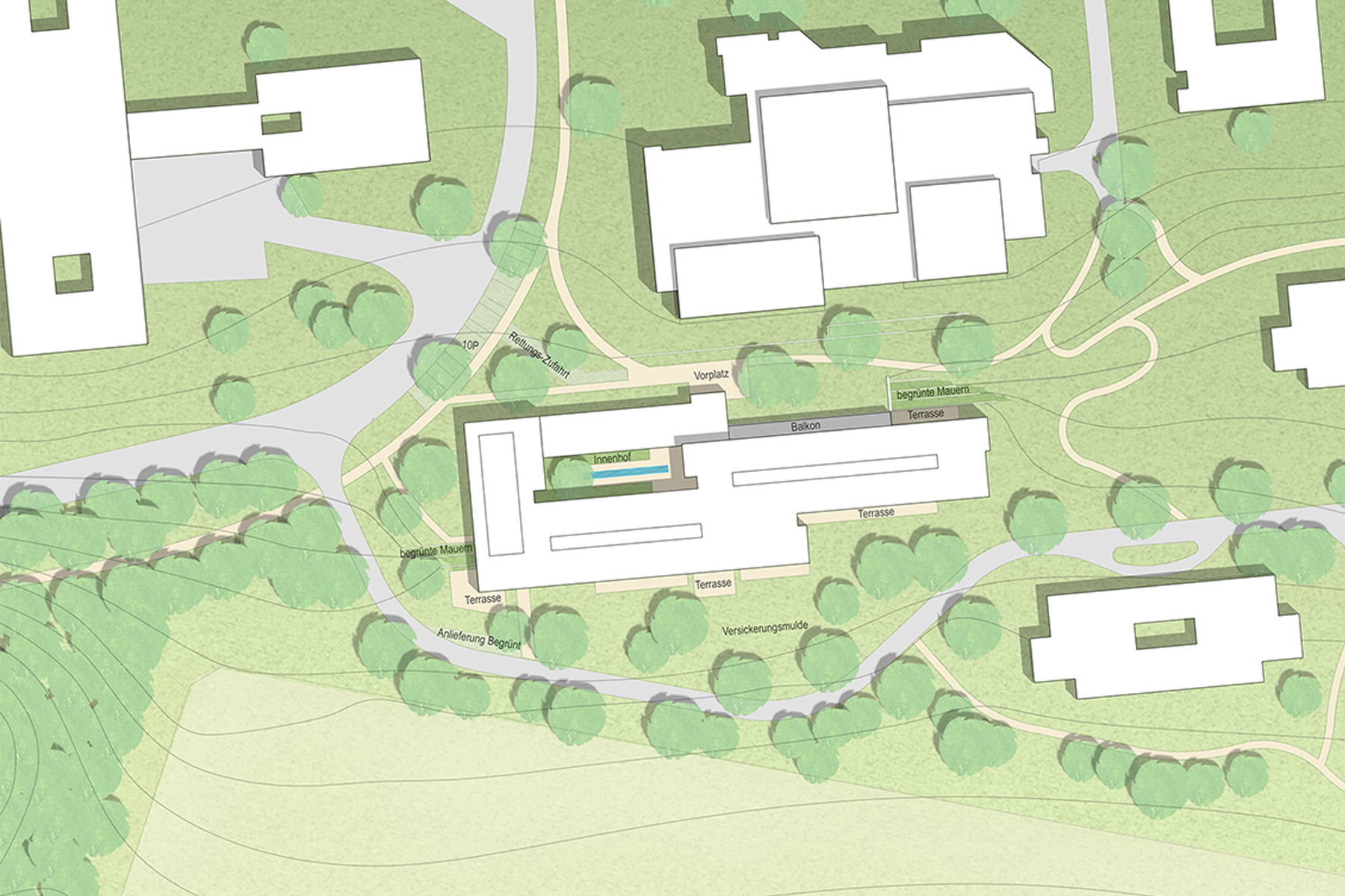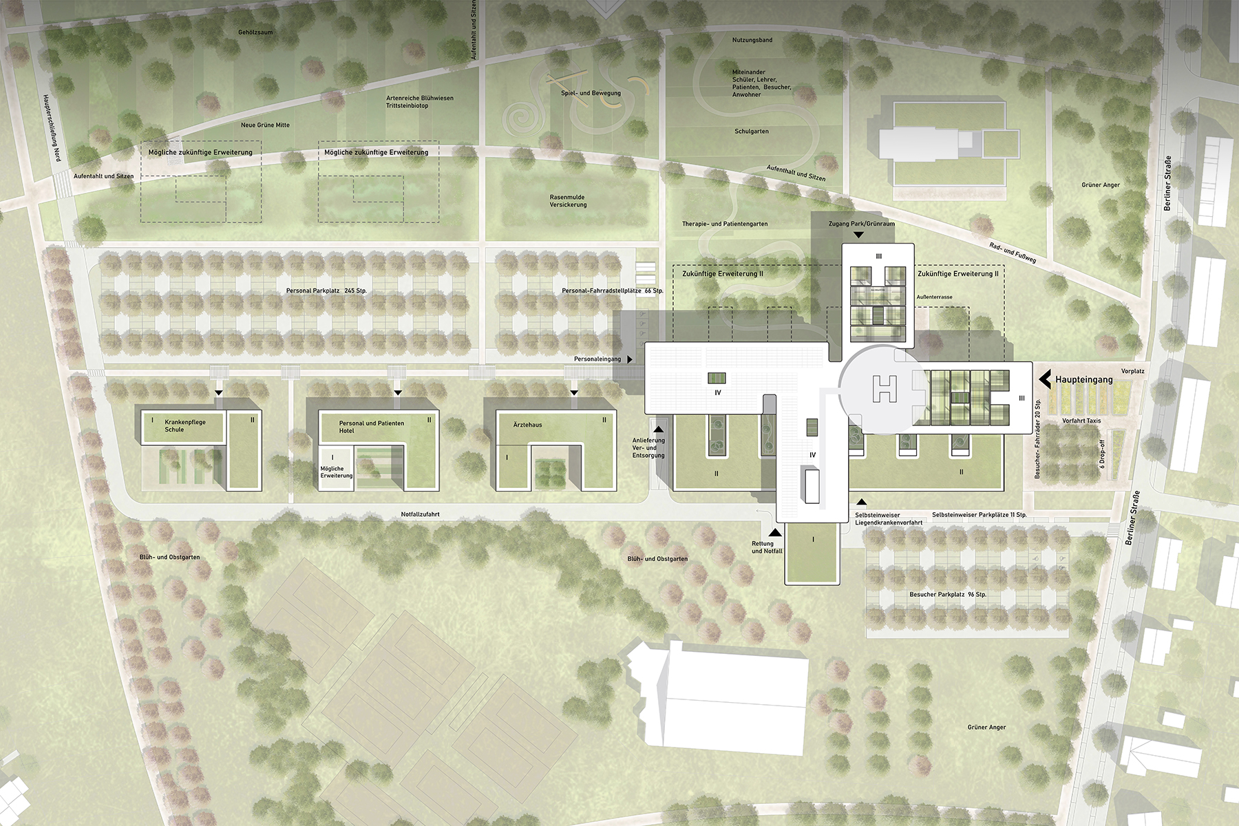 Der vorhandene Gehölzsaum entlang der Berliner Straße, ein grüner Anger, begleitet die Straße und schafft die räumliche Kante des neuen Parks in verspielter Weise. Das Motiv folgt der Berliner Straße, einzige Zäsur bildet der große, offene Vorplatz vor dem Klinikum