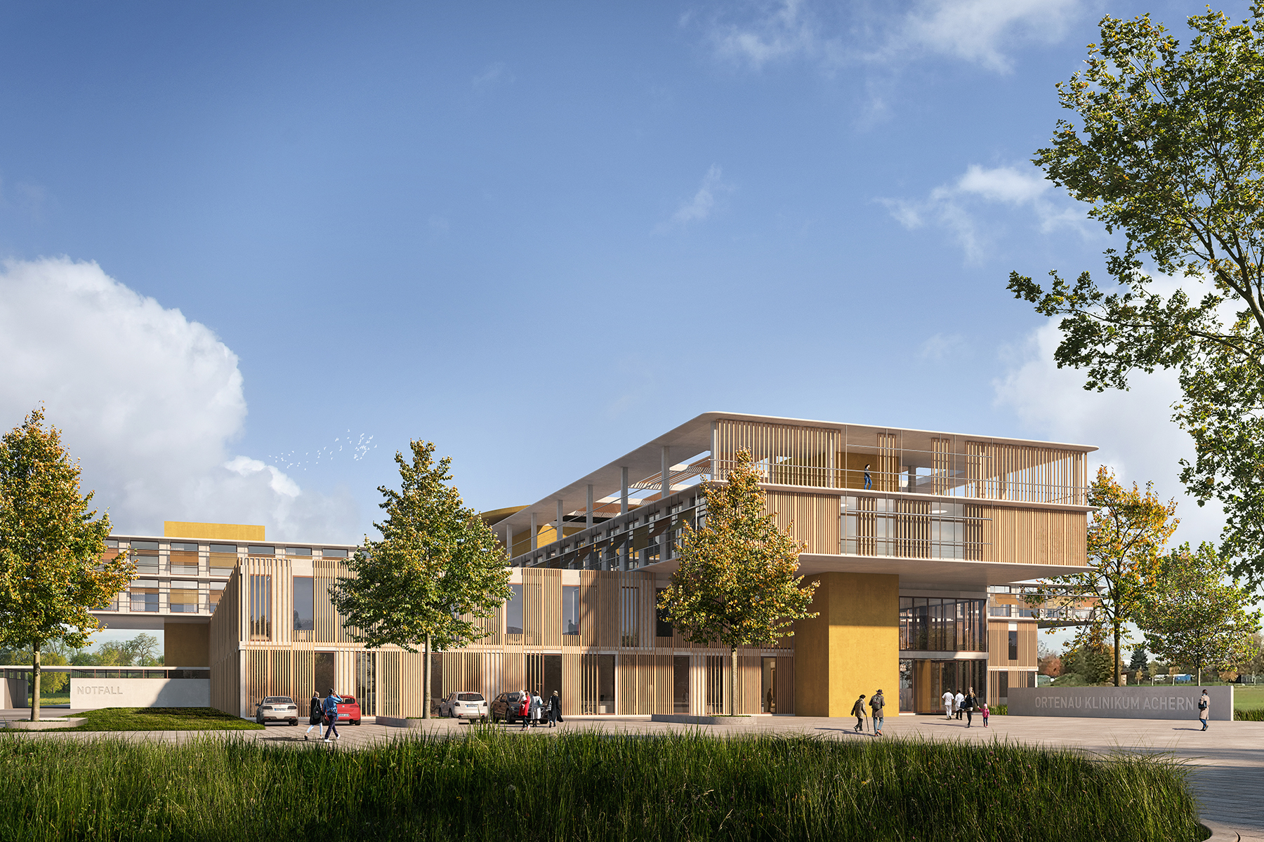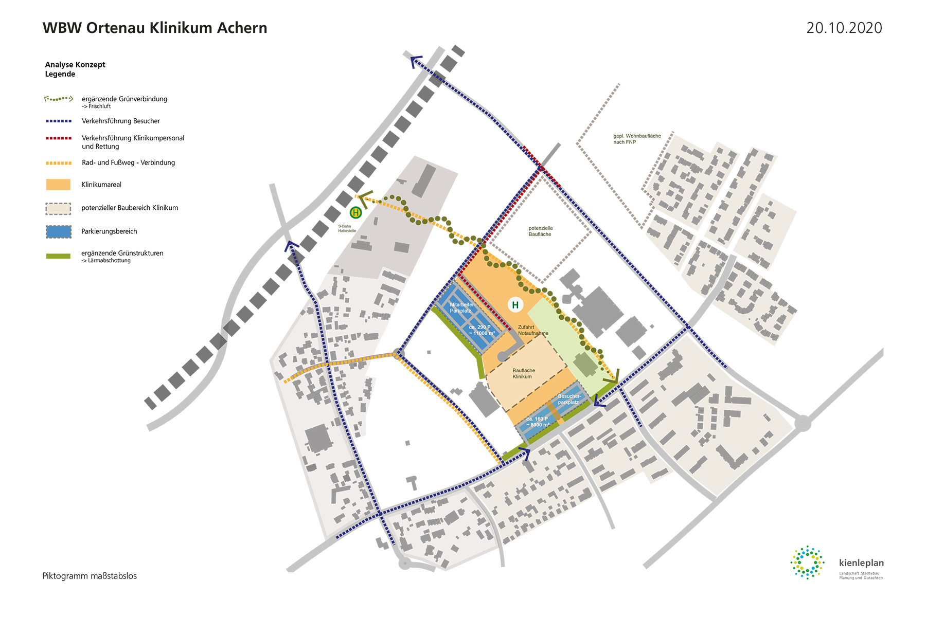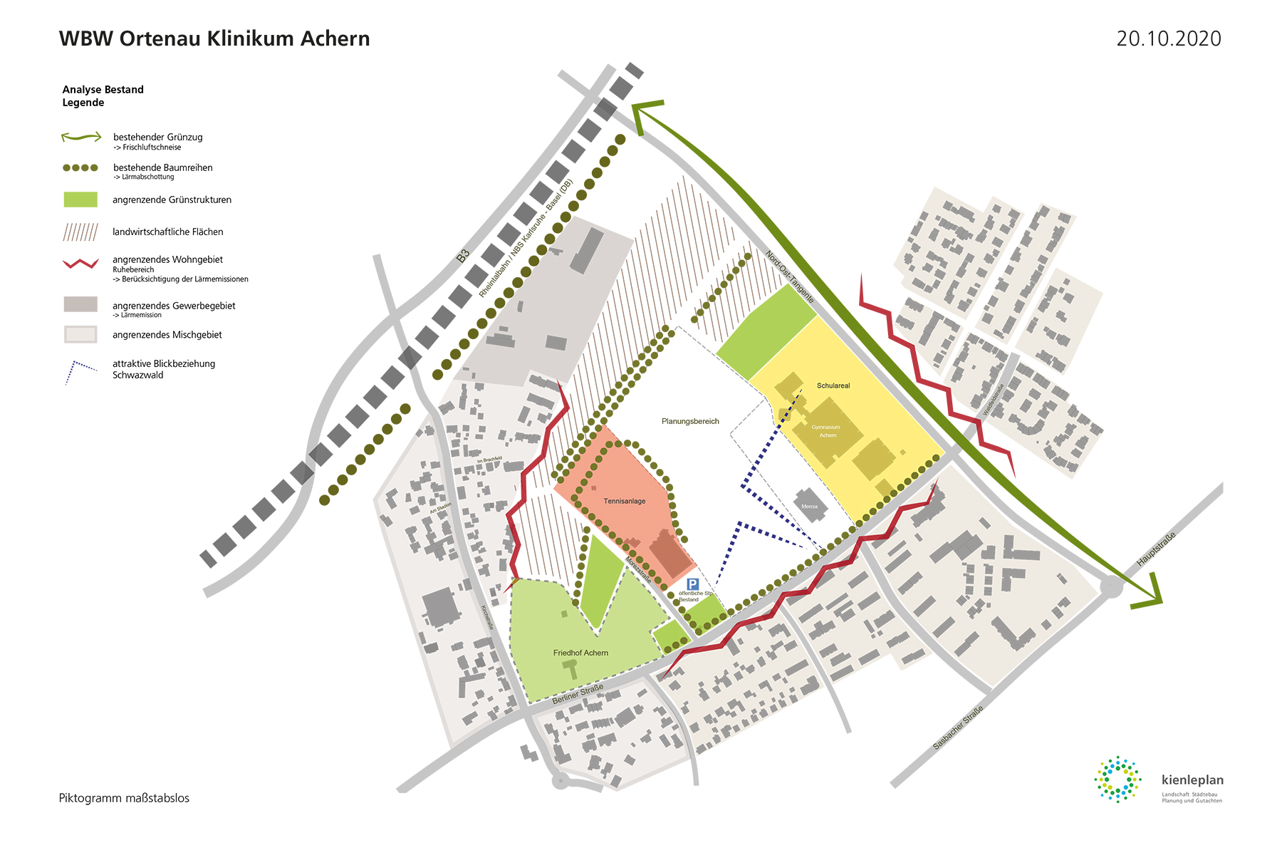 Typische Kulturlandschaftsmerkmale der Ortenau sind in regelmässigen Pflanzungen von Steinobst zu finden. Wie Furchen in die Landschaft geritzt, sind sie landschaftsbildprägend allerorten zu finden, den Lineaturen der Flurstücke folgend. Reliktisch nur noch in wenigen Spuren im Umfeld des neuen Klinikums. Gestaltprägend wird dieses Landschaftselement neu und ortsbildprägend interpretiert.