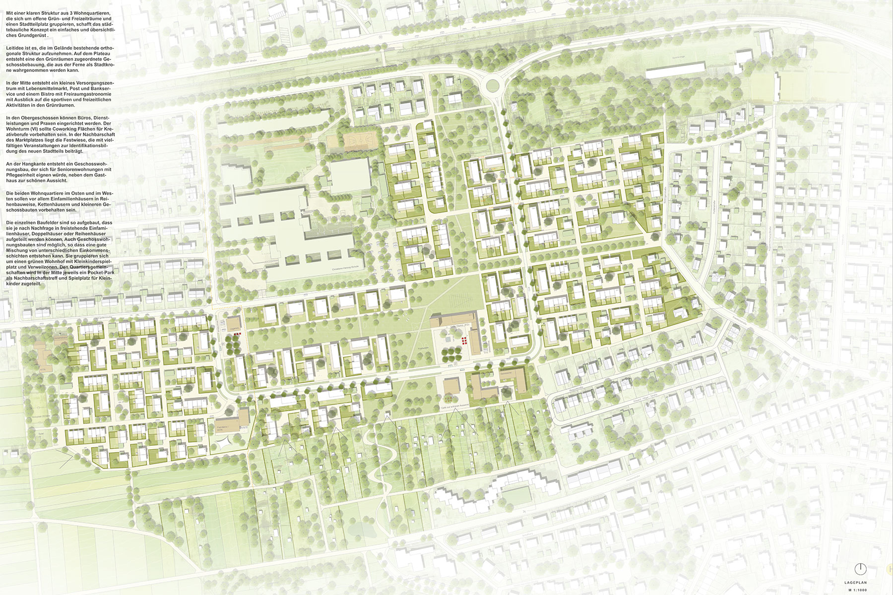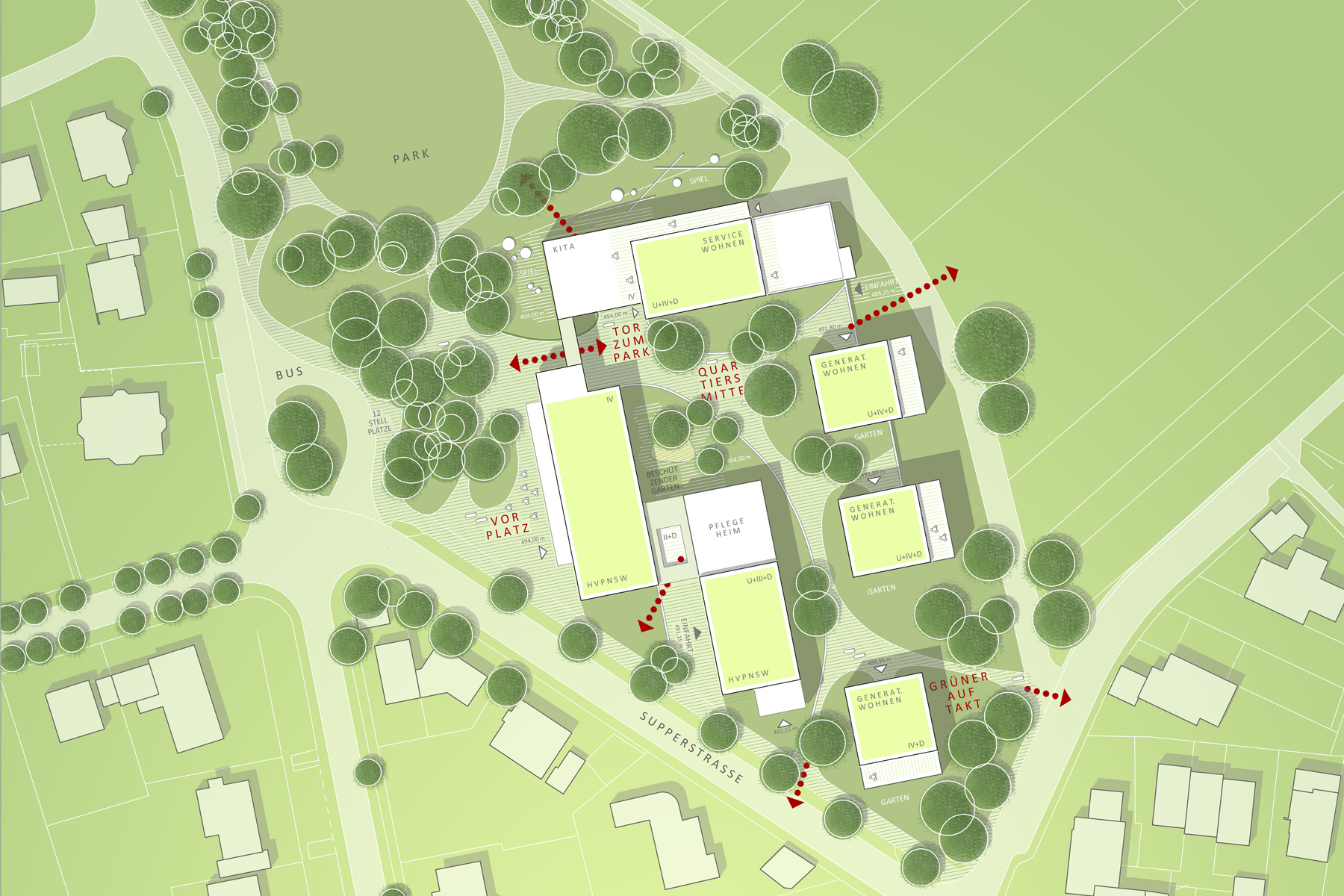 Die Freianlagen mit der vorgeschlagenen Wegeführung und Begrünung wird aus dem Gestaltkanon der nördlich angrenzenden vorhandenen Grünanlage entwickelt. Geschwungene Wege und einzelne Clumps aus Gehölzen gliedern die Anlage. Der vorhandene Park wird wie selbstverständlich nach Süden bis zur Supperstraße weiterentwickelt.