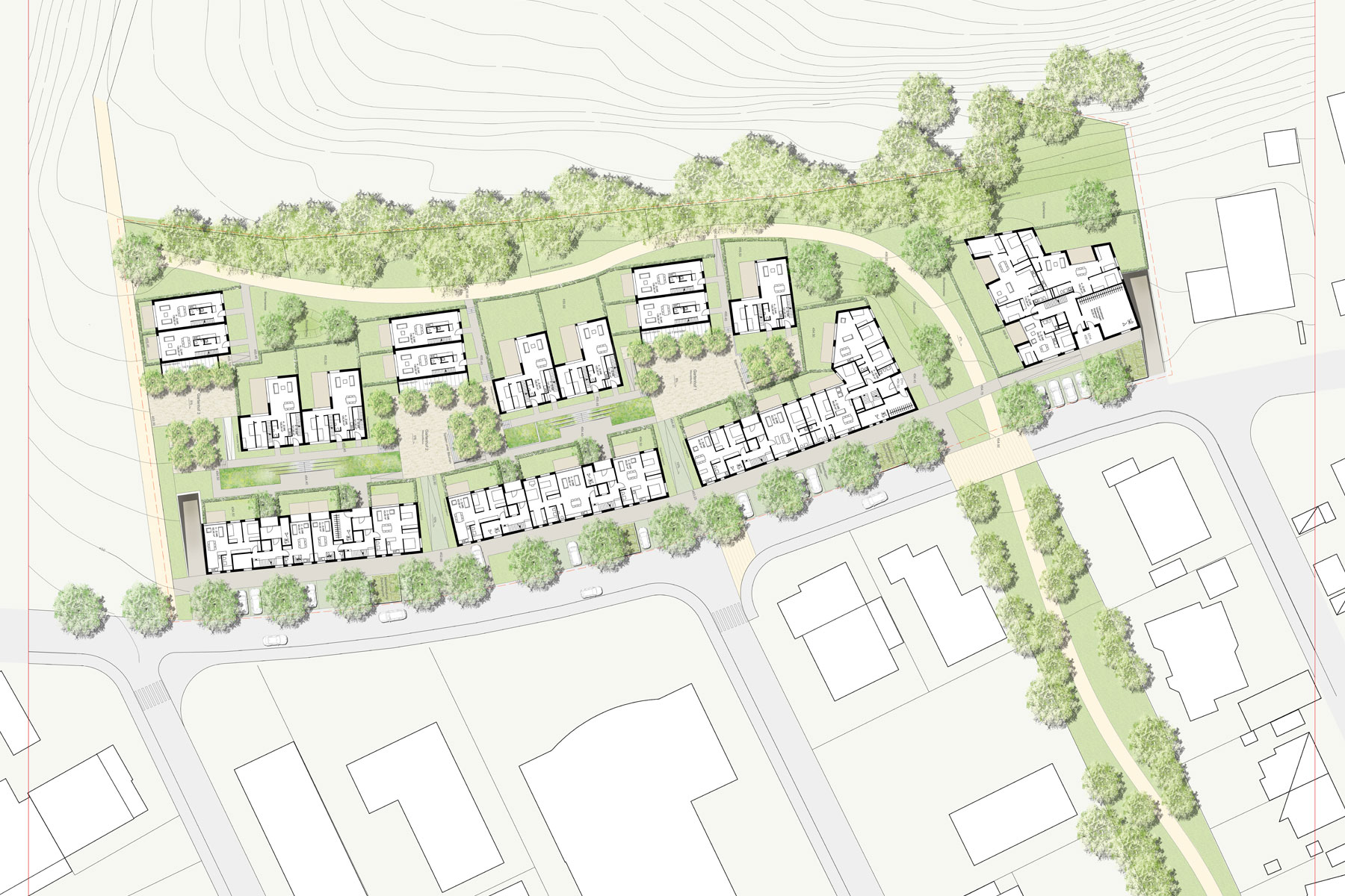 Die innere Zonierung, d.h. die etwas privateren, halböffentlichen Flächen verweben sich mit den nach Westen zur Thingstraße hin vorhandenen Grünflächen und wachsen zu einem großen Ganzen zusammen.