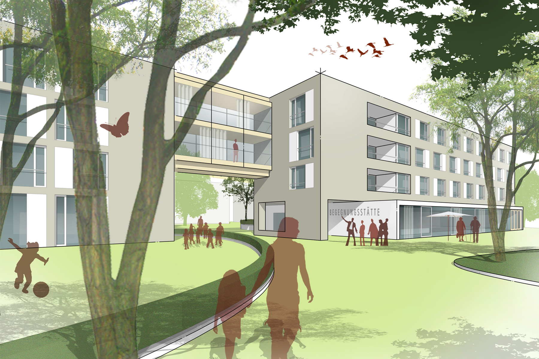 Das Vorfeld des Hauptgebäudes Pflegeheim wird räumlich geöffnet und schafft eine neue und eindeutige Adresse.