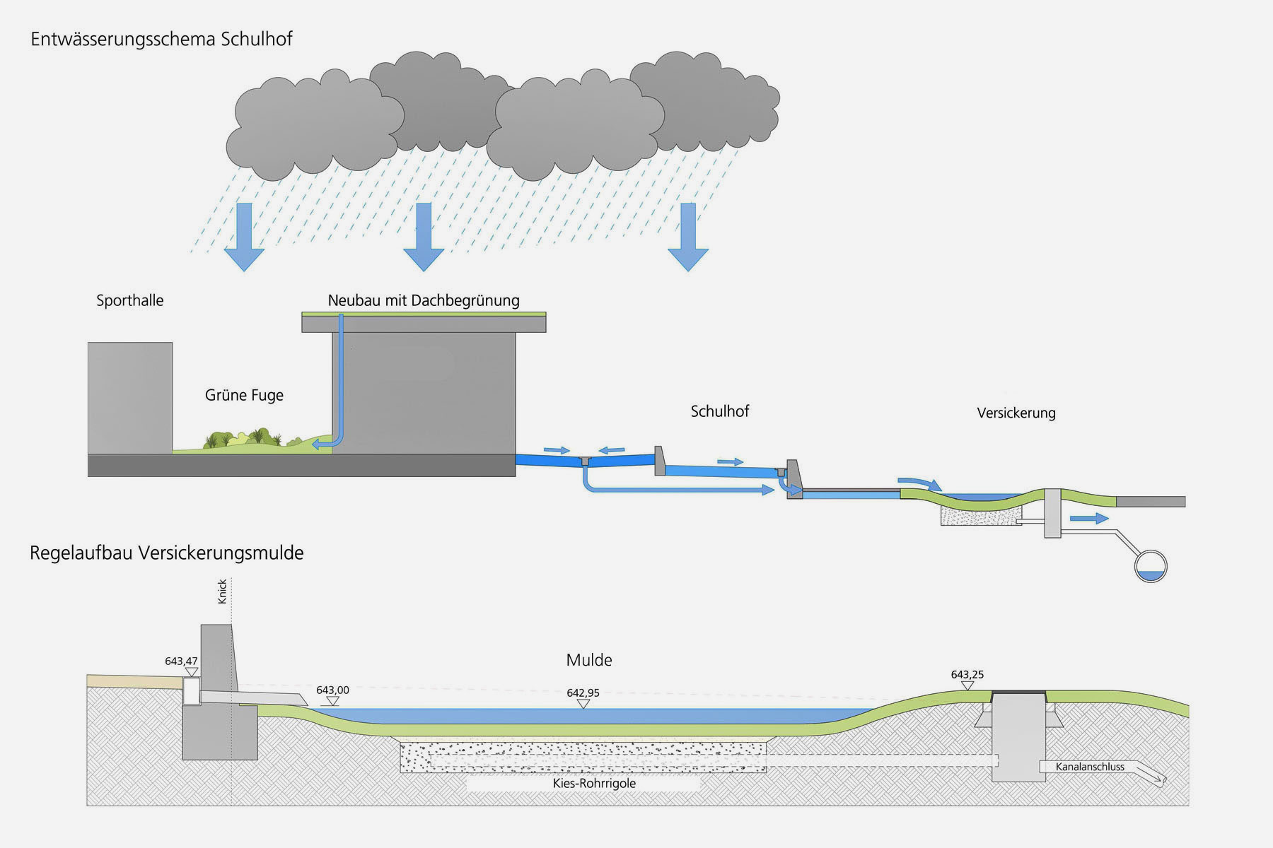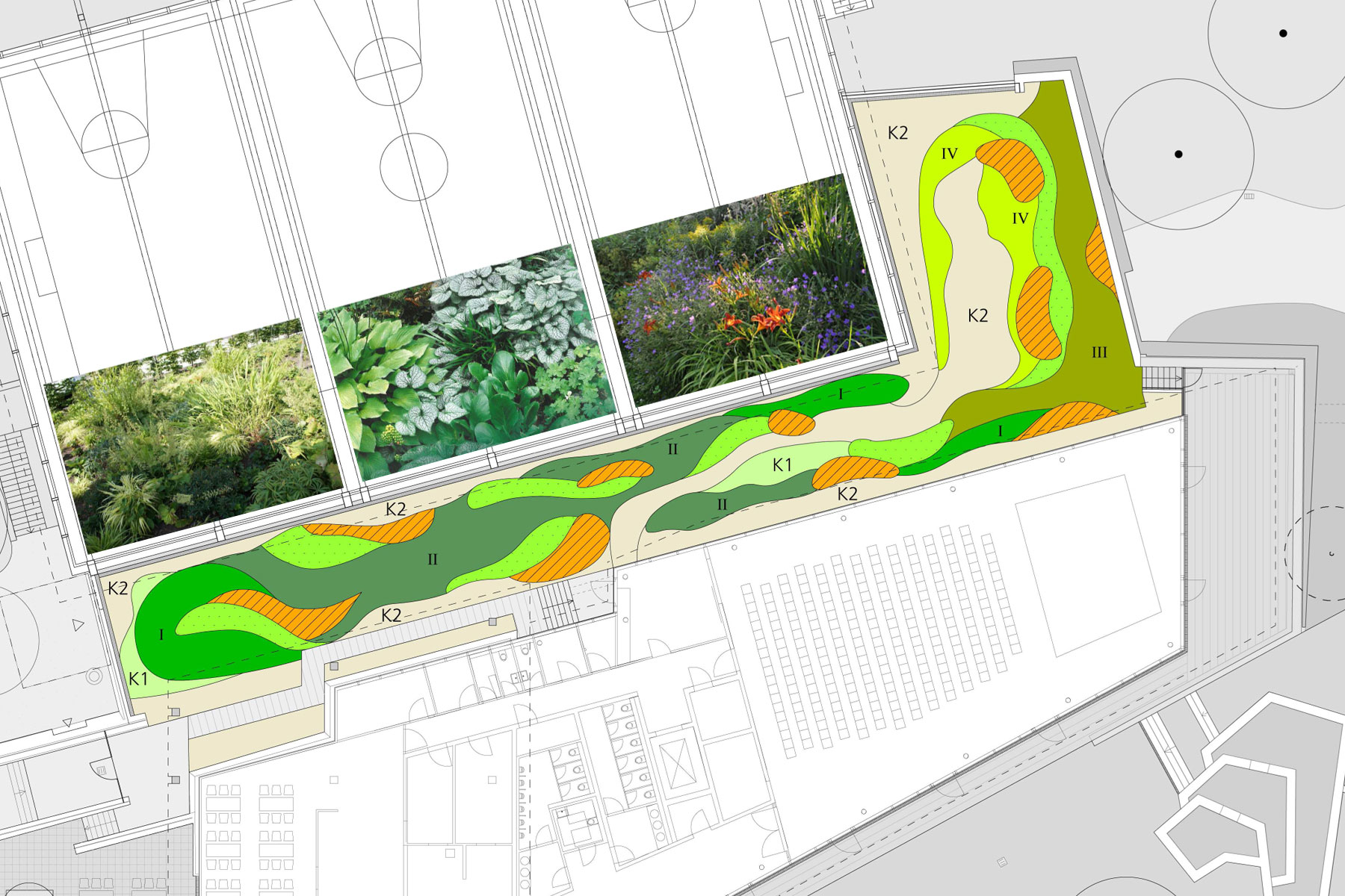 Die entstehende Gebäudefuge zwischen bestehender Sporthalle und neuem, multifunktionalem Schul- und Veranstaltungsgebäude wird als `Grüne Fuge´ gestaltet.