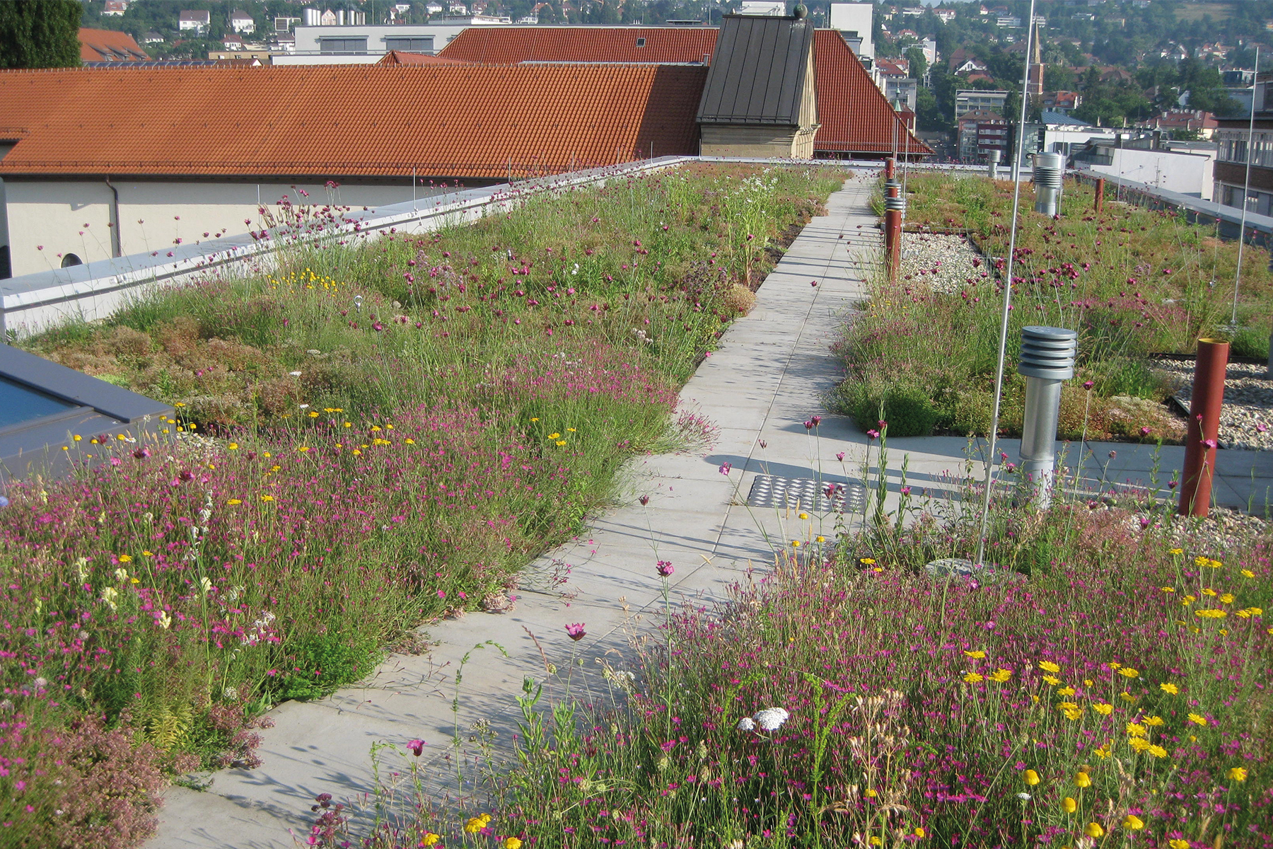 Die Dachfläche des Gebäudes ist extensiv mit Stauden-/Sprossenansaat begrünt.