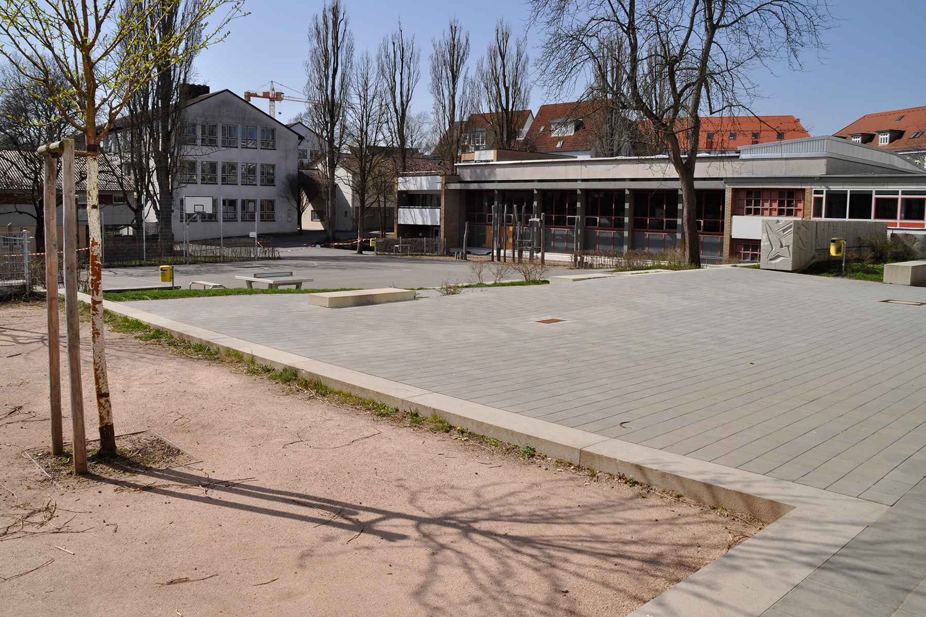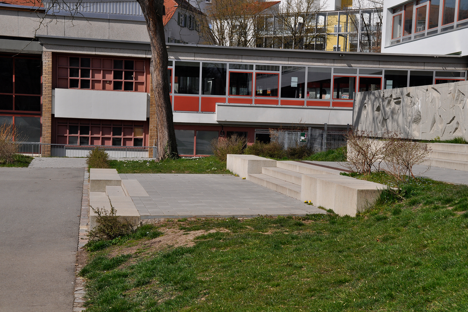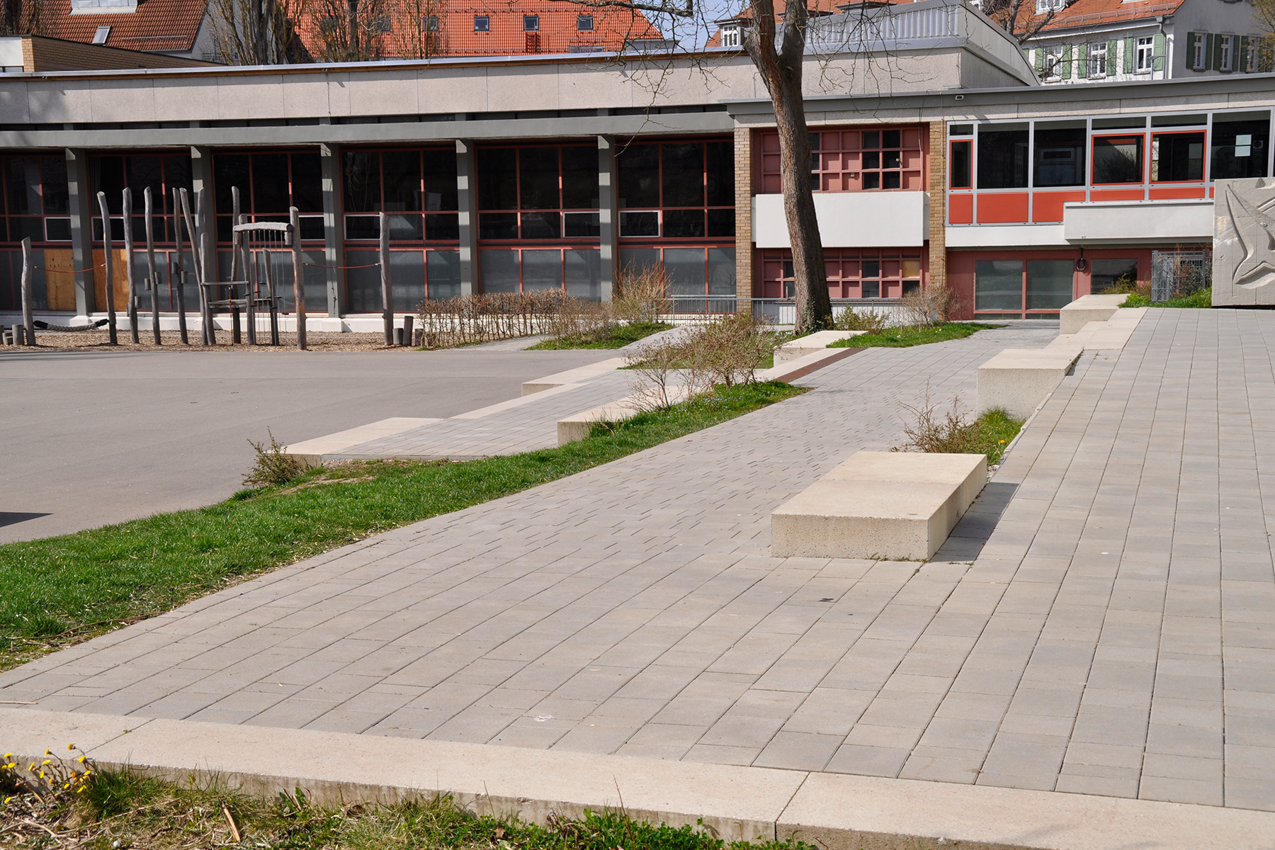 Die Klosterschule in Sindelfingen wurde nach einigen Jahren des Leerstandes wieder aktiviert und modernisiert. In diesem Zug wurden auch die Außenanlagen umgestaltet und ertüchtigt. Es wurden neue Parkplätze angelegt, die Anlieferung der Schule neu konzipiert und bestehende Strukturen Rückgebaut, wie z.B. ein ehemaliger Kohlekeller, der teilweise in eine Regenwasserrigole umgebaut wurde. Zudem wurden auch bestehende Heizöltanks freigelegt, gereinigt, zerlegt und abtransportiert. Der bestehende Schulhof wurde komplett umgeplant und bekam neue Strukturen. Es wurde ein Außenbereich für die Mensa und ein Schulgarten geschaffen. Der Höhenunterschied zwischen Pausenhof und Schule wird nun über eine Treppe und eine neue Rampe überwunden. Großzügige Spielangebote für unterschiedliche Altersstufen wurden geschaffen. Eine Betonskulptur aus den 60er Jahren wurde auf Wunsch des Bauherrn in die Planung mit übernommen.