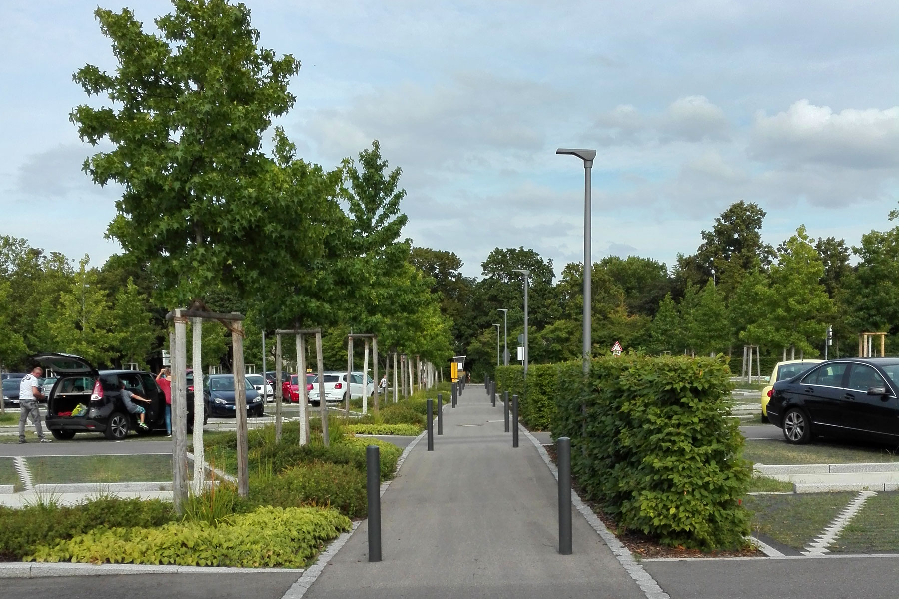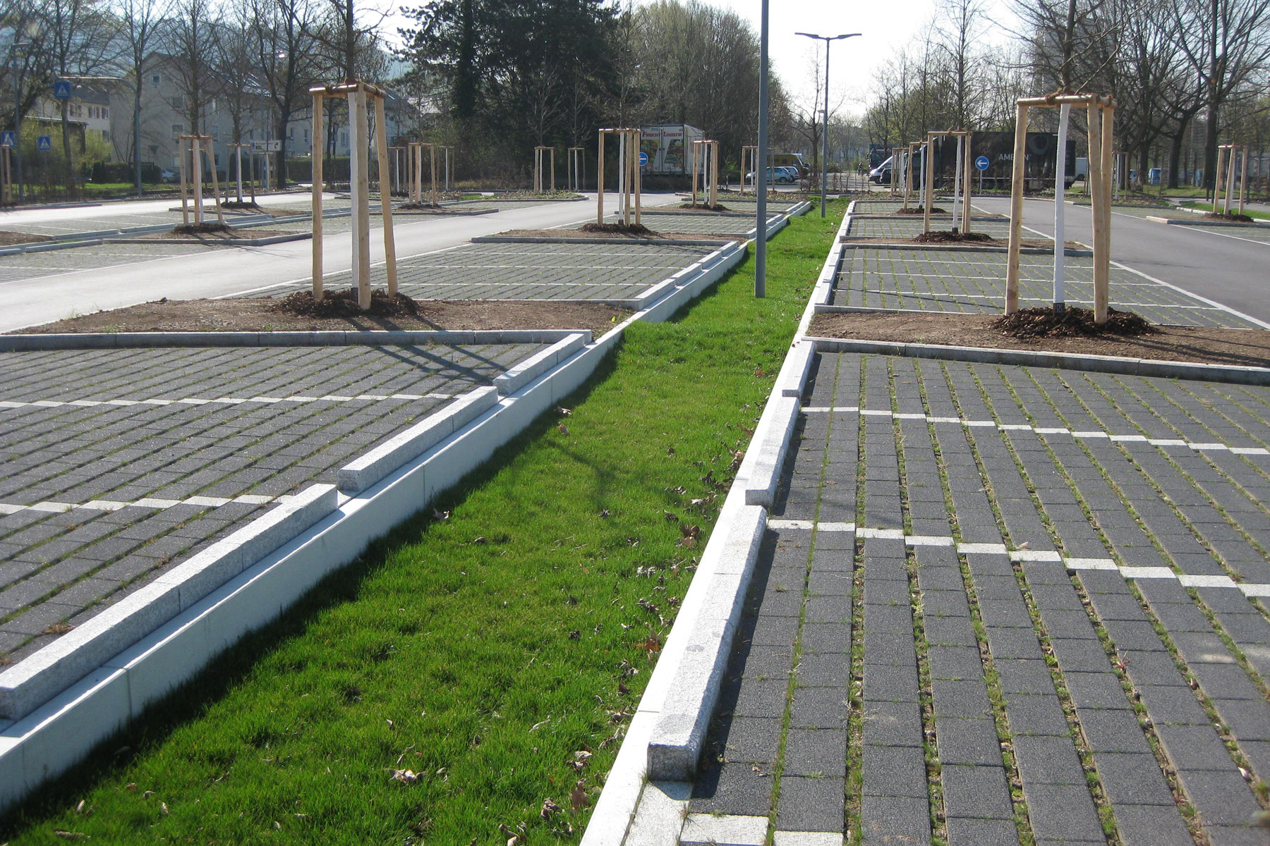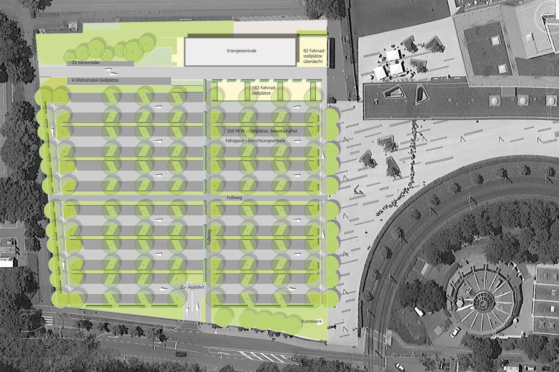 Der gesamte Parkplatzbereich wird über Bäume gegliedert. Je ca. 4 Stellplätze wird ein Baumstandort nachgewiesen. Ziel ist eine langfristige Beschattung der Parkierungsflächen, gleichzeitig wird dadurch verhindert, dass sommerliche Hitzeinseln entstehen - ein wichtiger Beitrag zum Stadtklima.