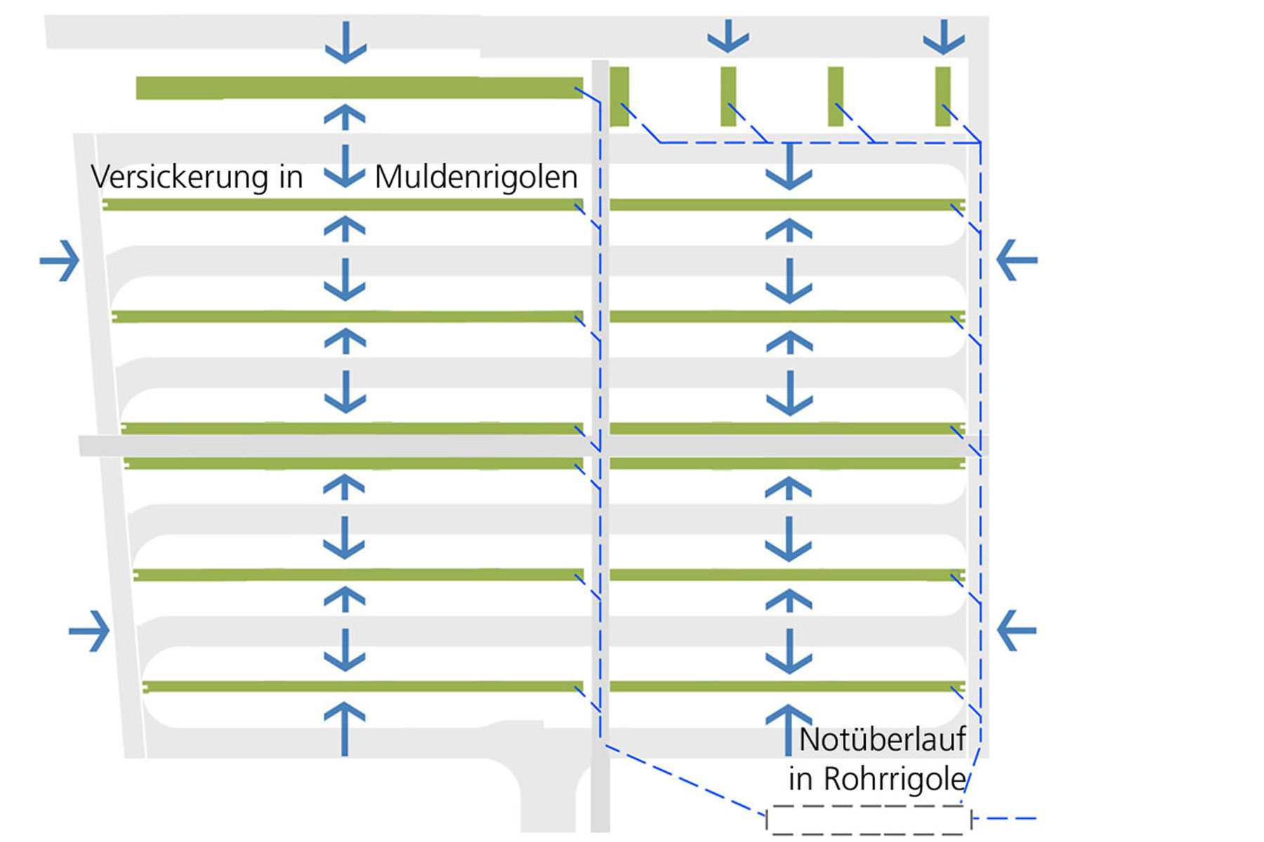 Die Oberflächenentwässerung der Anlage erfolgt über Mulden-Rigolen-Systeme zwischen den Stellplatzaufstellungen. Oberflächenabflüsse werden durch begrünte Pflasterbeläge minimiert. Damit wird eine vollständige dezentrale Entwässerung der Anlage gewährleistet.