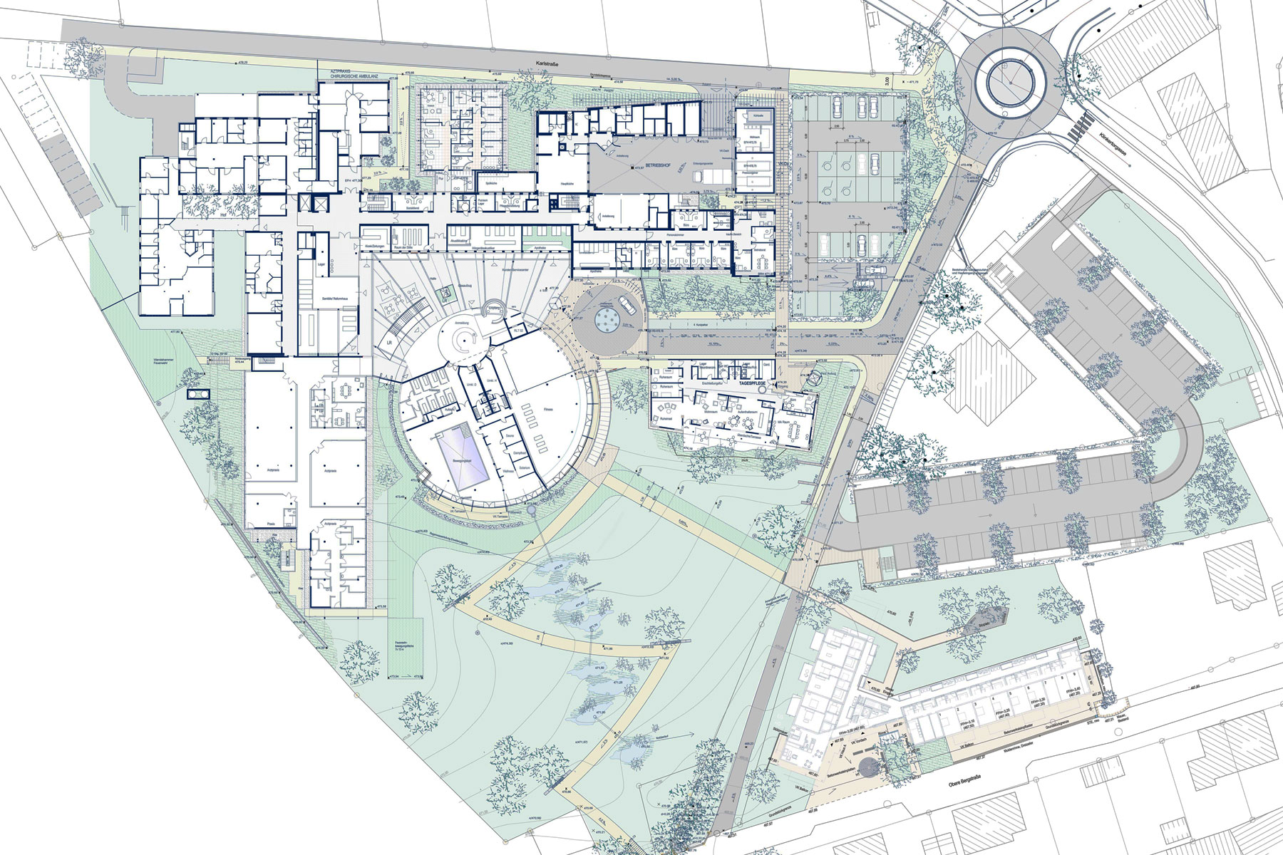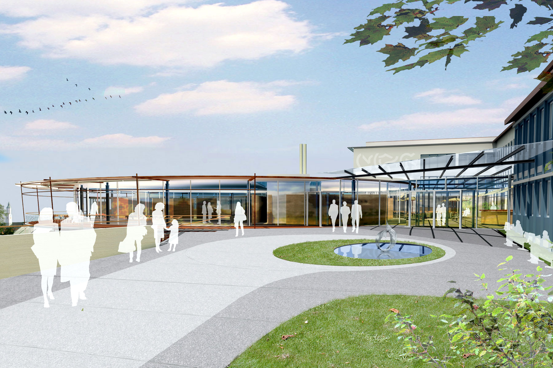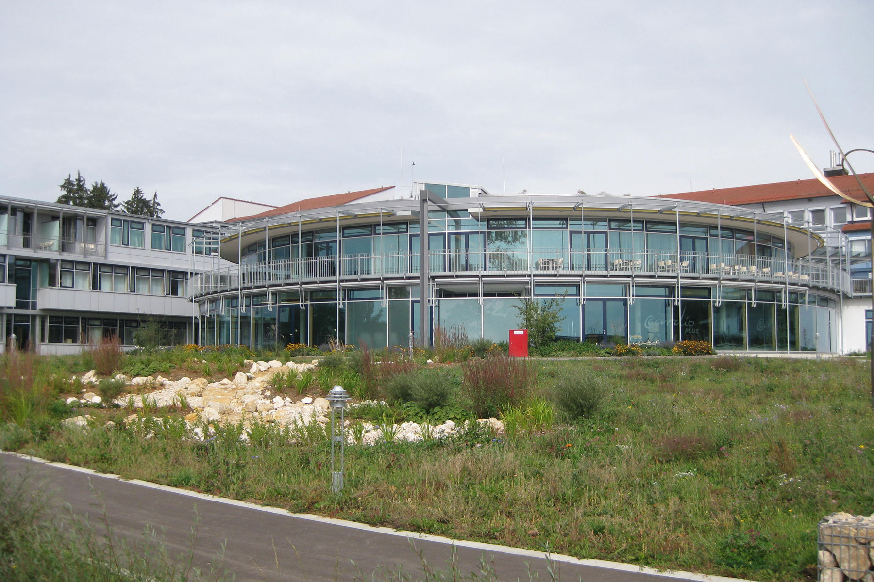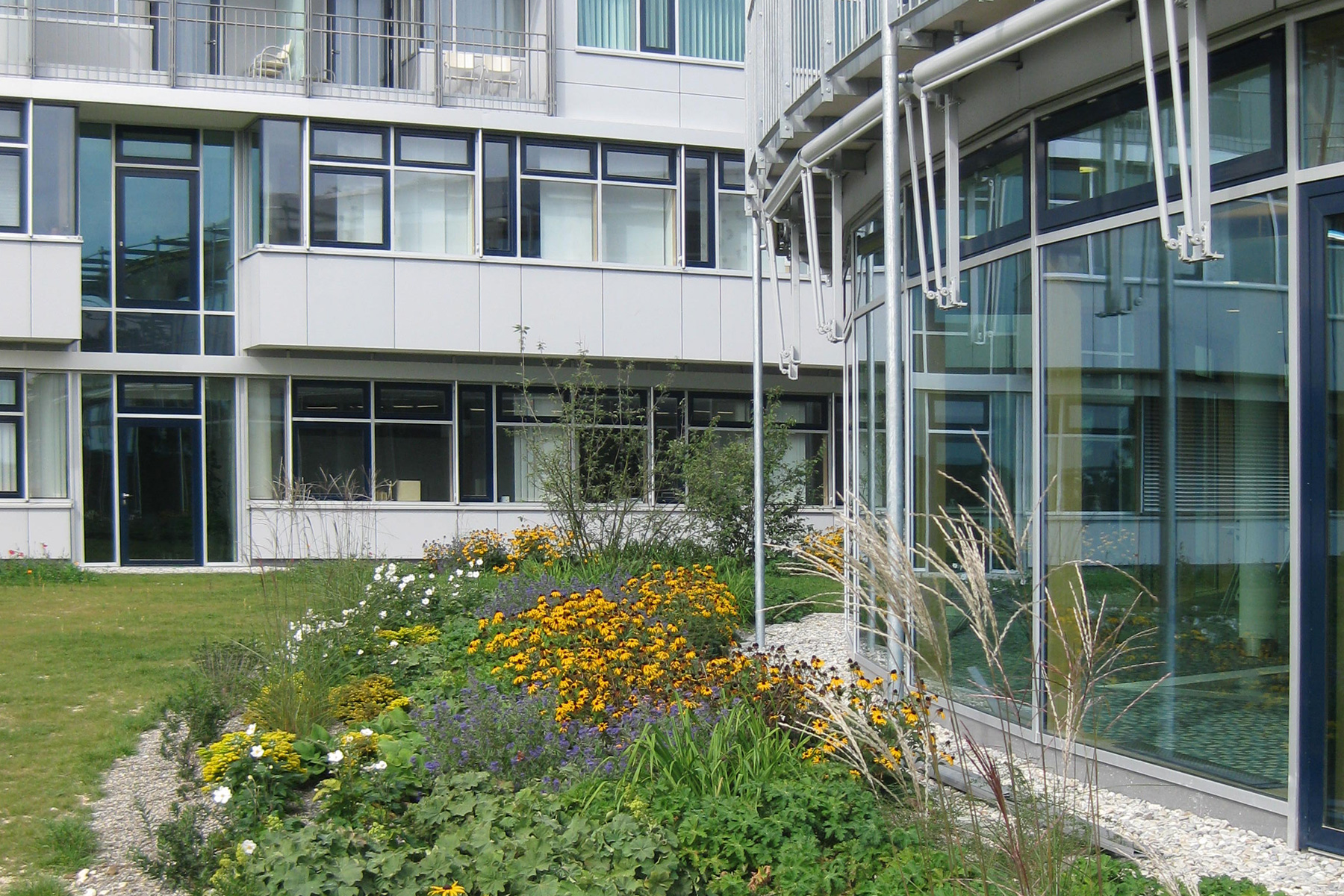Die begrünten Dachflächen der Rotunde werden von den Patientenzimmern vom Neubau und Altbau aus eingesehen. Die dortigen Vegetationselemente sind daher in Farbe, Textur und Blütezeit in Pflanzbildern gestaltet.