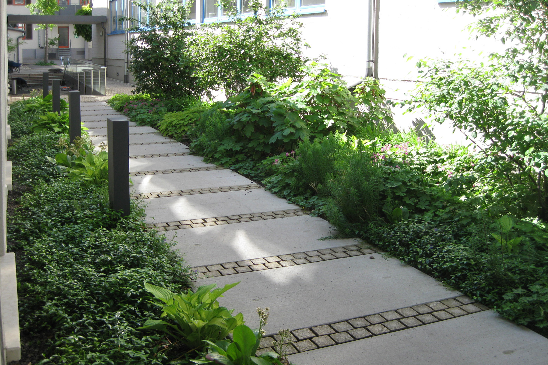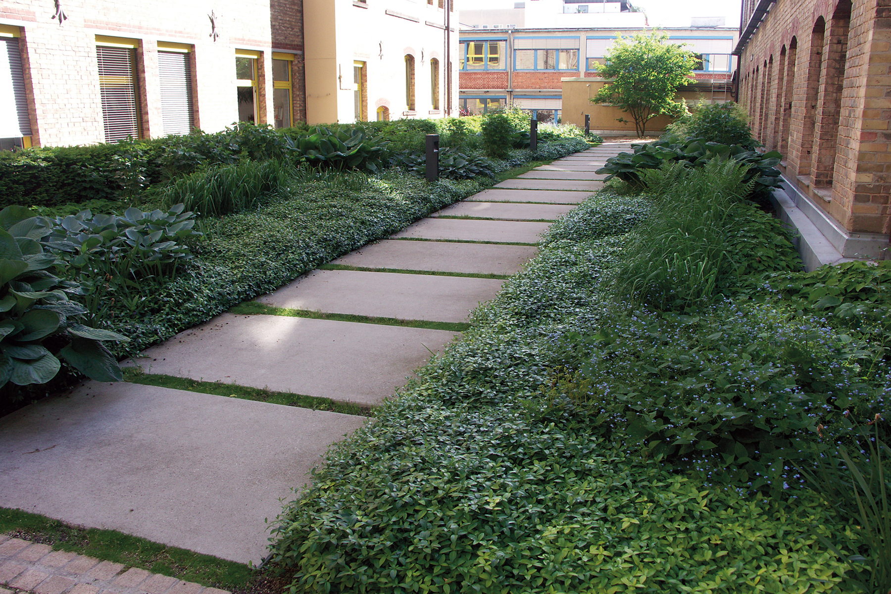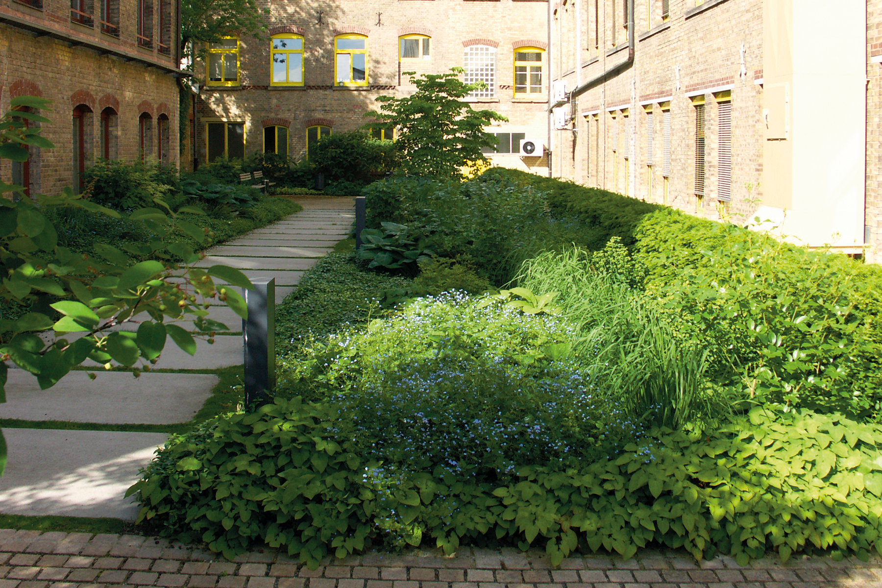Die vormals zu 75 % versiegelten und vollständig unterbauten Flächen wurden vollständig entsiegelt, mit kontrastreichen Staudenpflanzungen und Verweilplätzen neu gestaltet und den Mitarbeitern zur Erholung zur Verfügung gestellt.