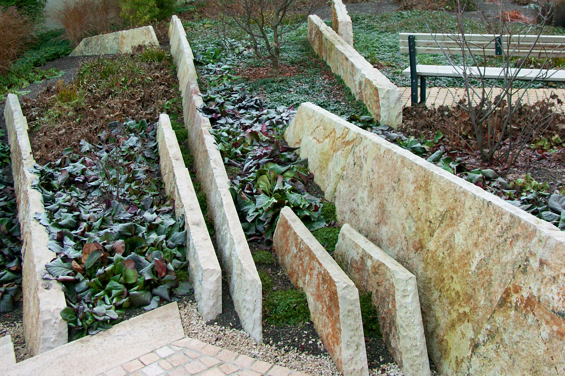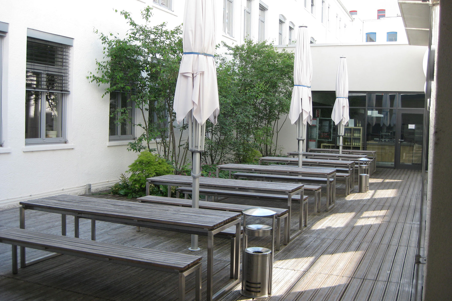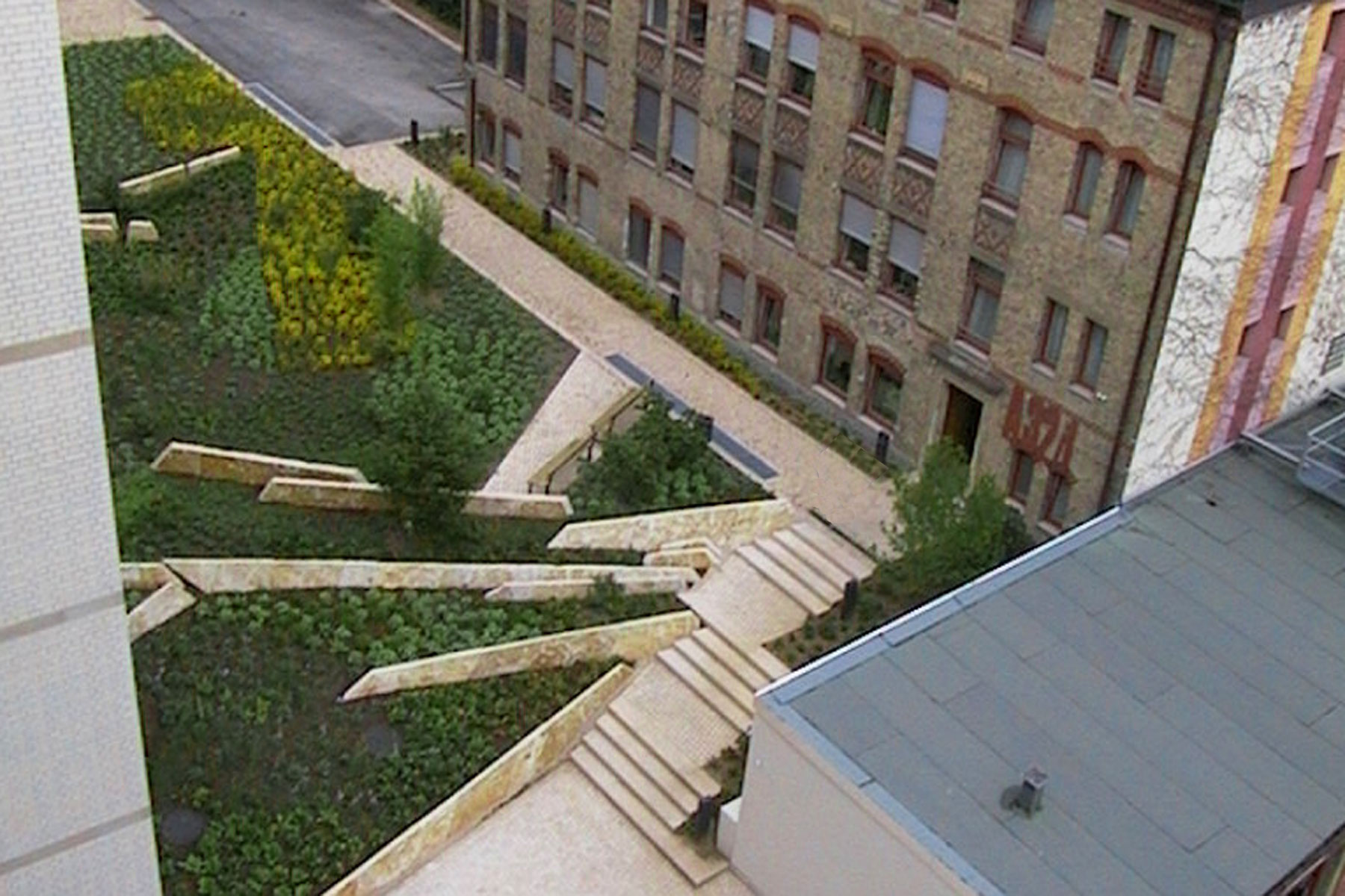 Die vormals zu 75 % versiegelten und vollständig unterbauten Flächen wurden vollständig entsiegelt, mit kontrastreichen Staudenpflanzungen und Verweilplätzen neu gestaltet und den Mitarbeitern zur Erholung zur Verfügung gestellt.