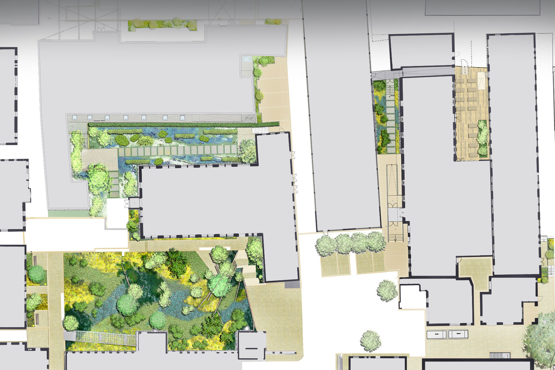 Der Freiraum ermöglicht, durch die vollständige Intensivbegrünung der Tiefgarage, einen zusammenhängenden, großzügigen Garten. Mit freiraumplanerischen Elementen wie Stützmauern, Freitreppe und Steg wird eine gesamte Geschosshöhe in subtiler Weise überwunden.
