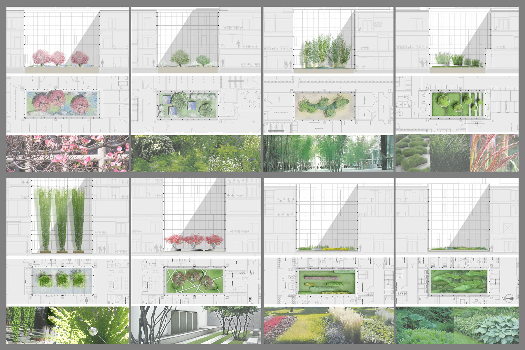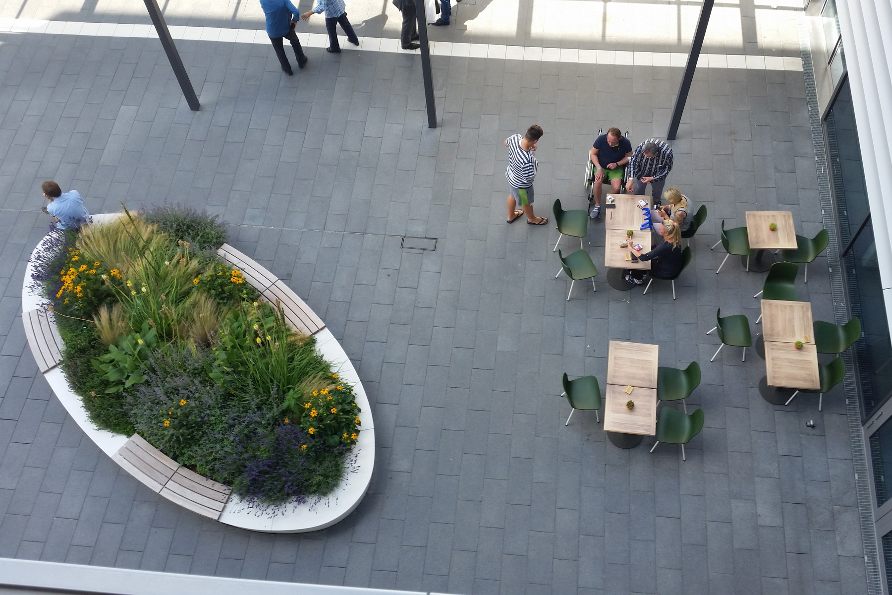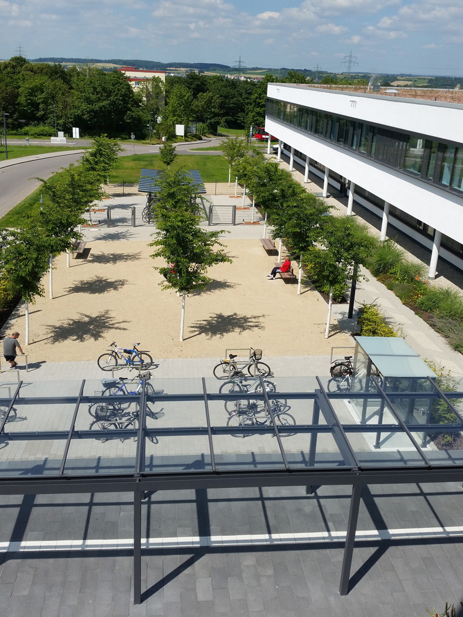 Die Gestaltungsintensität nimmt zum Haupteingang des geplanten Neubaus zu. Die gebäudenahen Bereiche sind geprägt von hochwertigen Belags- und Vegetationsflächen. Die zur Belichtung der Trakte erforderlichen Innenhöfe sind mit unterschiedlichen gestalterischen Mitteln formuliert. Jeder der Innenhöfe interpretiert Vegetation und befestigte Flächen auf eigene Weise.