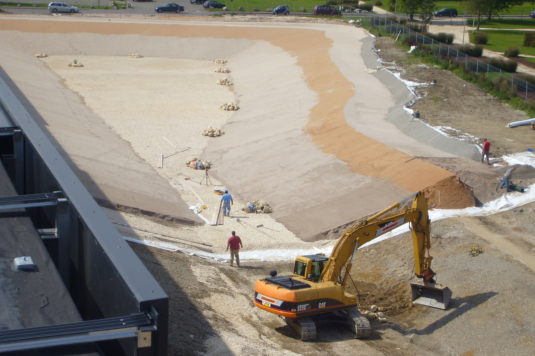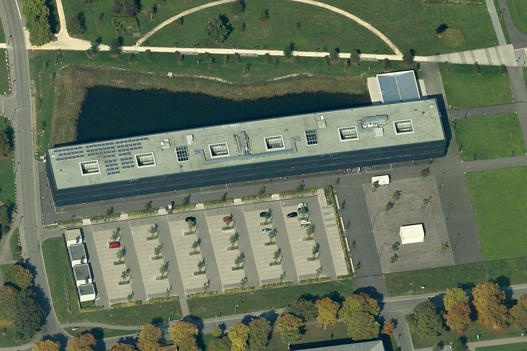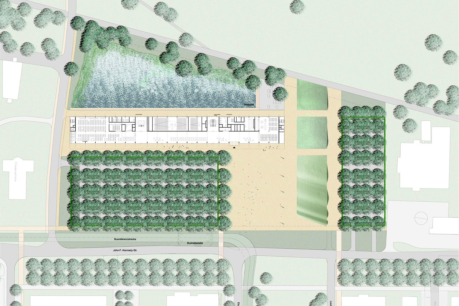 Südlich des Gebäudes befinden sich die notwendigen Stellplätze, überstellt mit einem dichten Baumdach aus Platanen. Ein vorhandener, öffentlicher Grünzug in Nord-Süd-Richtung wird auf dem Gelände in Form einer bewegten, wellenartigen Rasenmodellierung fortgeführt und läuft in nördlicher Richtung zur Landschaft hin aus.