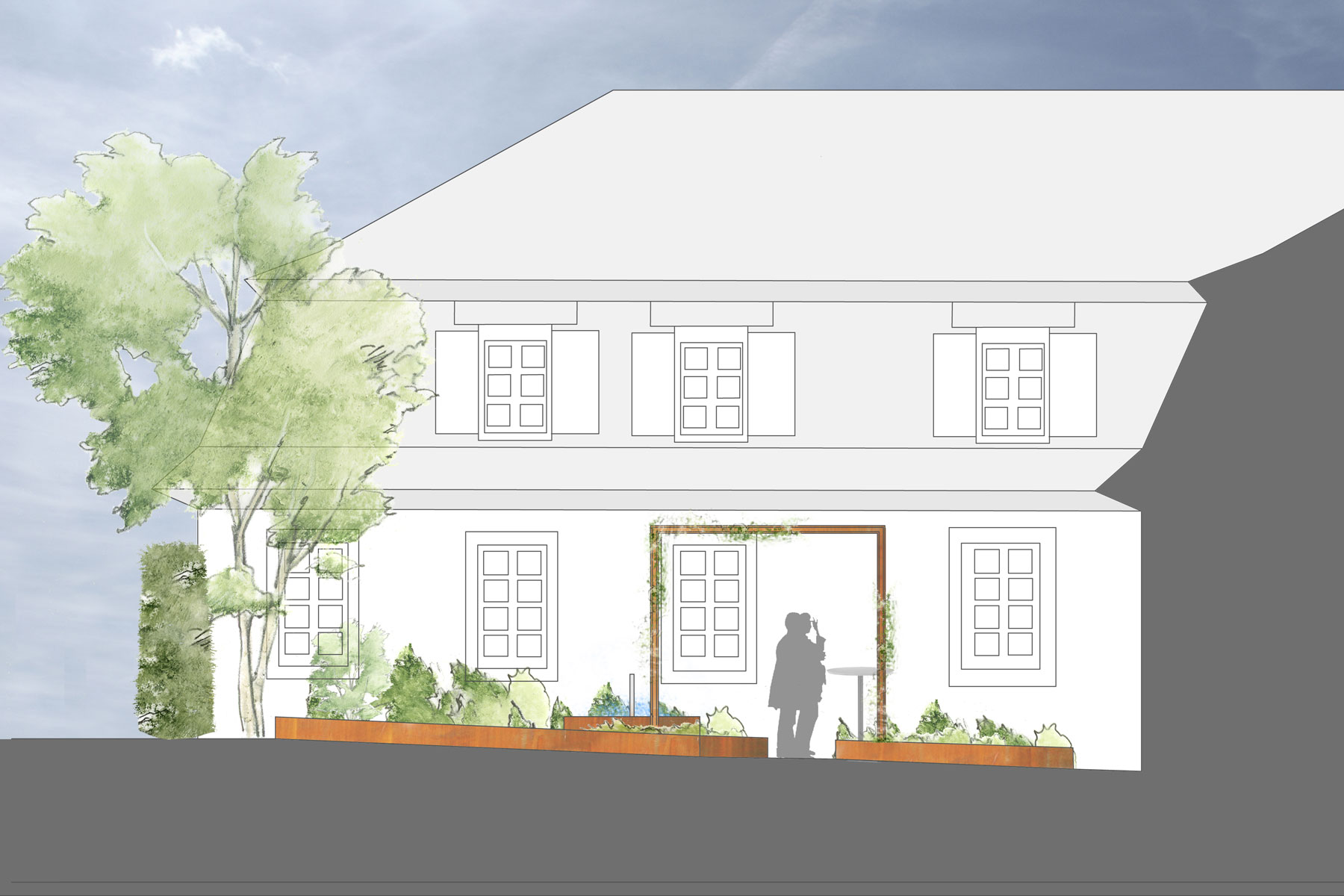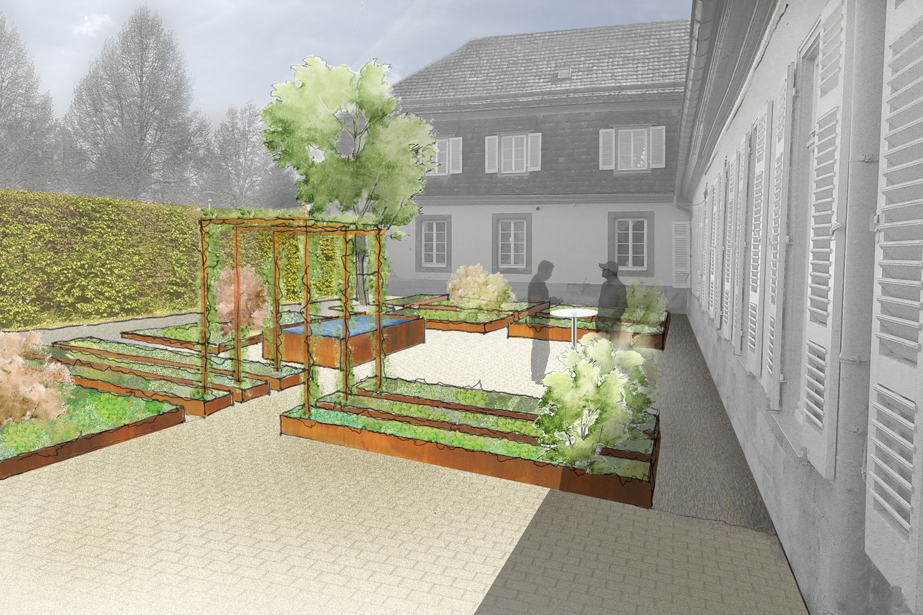 Geplant ist, einen neuen Außenraum für Gäste zu gestalten, der den hohen Anspruch der Küche, in Form eines Kräuter- und Küchengartens spiegelt und der gleichzeitig eine hohe Aufenthaltsqualität zum Empfang der Gäste, in authentischer Atmosphäre ermöglicht. Entstehen soll ein sinnlich erfahrbarer Raum des Duftes und Geschmacks, der als Einstimmung auf die kommenden Gaumenfreuden, zum Verweilen und Entdecken animieren soll.