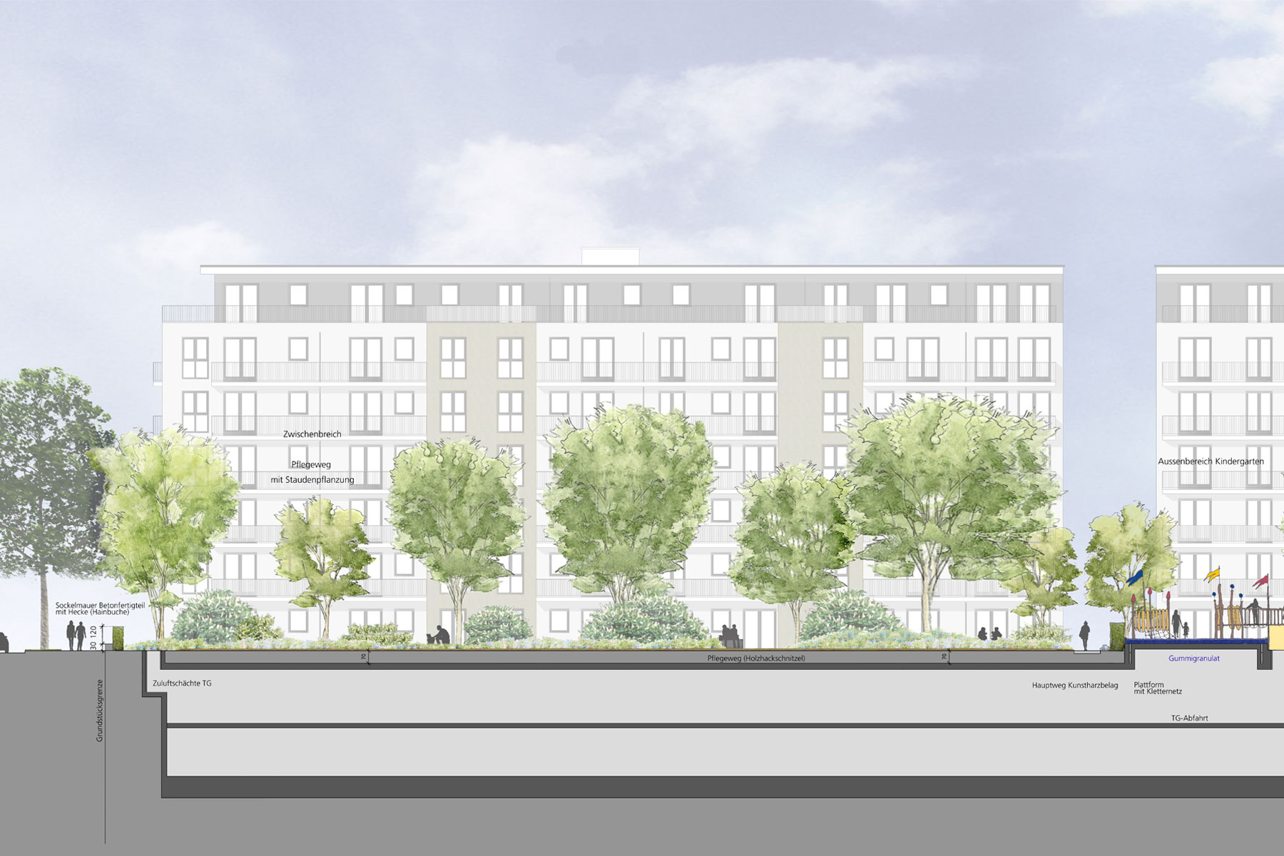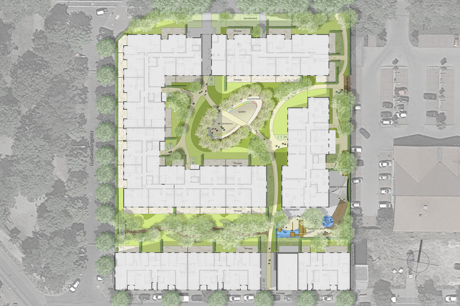 Urbanität und die halböffentliche Gemeinschaftszone entwickelt sich im Oval der Mitte, einem Spiel- und Bewegungsbereich mit vielfältigen Sitzmöglichkeiten. Ein Baumoval aus attraktiven Felsenbirnen zonieren diese Flächen und schaffen eigene gestalterische und räumliche Qualitäten.